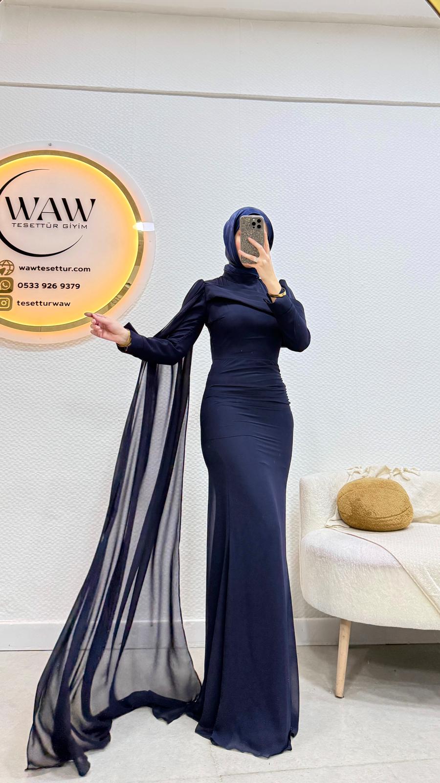 Atlas kumaştan üretilmiştir Pelerinli şifon kumaştır Beli drapelidir Arka orta gizli fermuarlıdır 36/38/40/42/44 bedenler mevcutturmanken 170 60 kilo 38 beden tercih etmektedir
