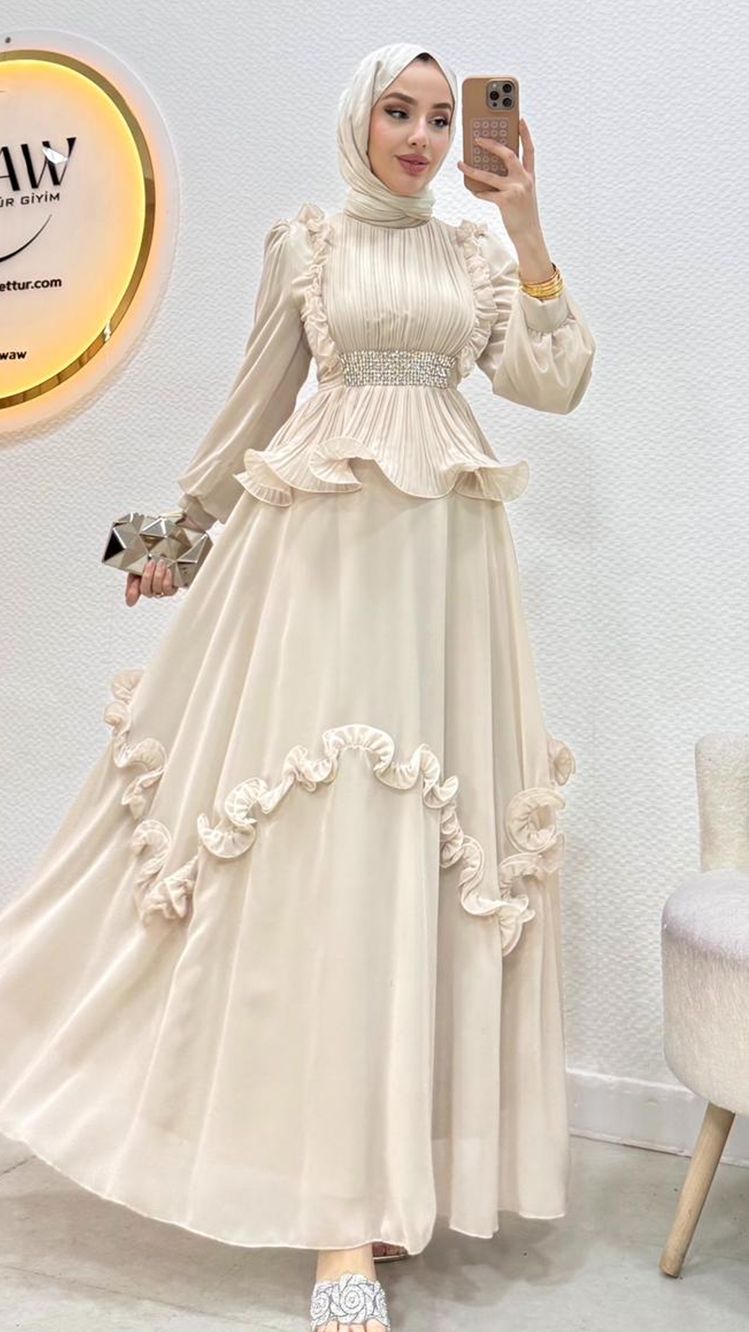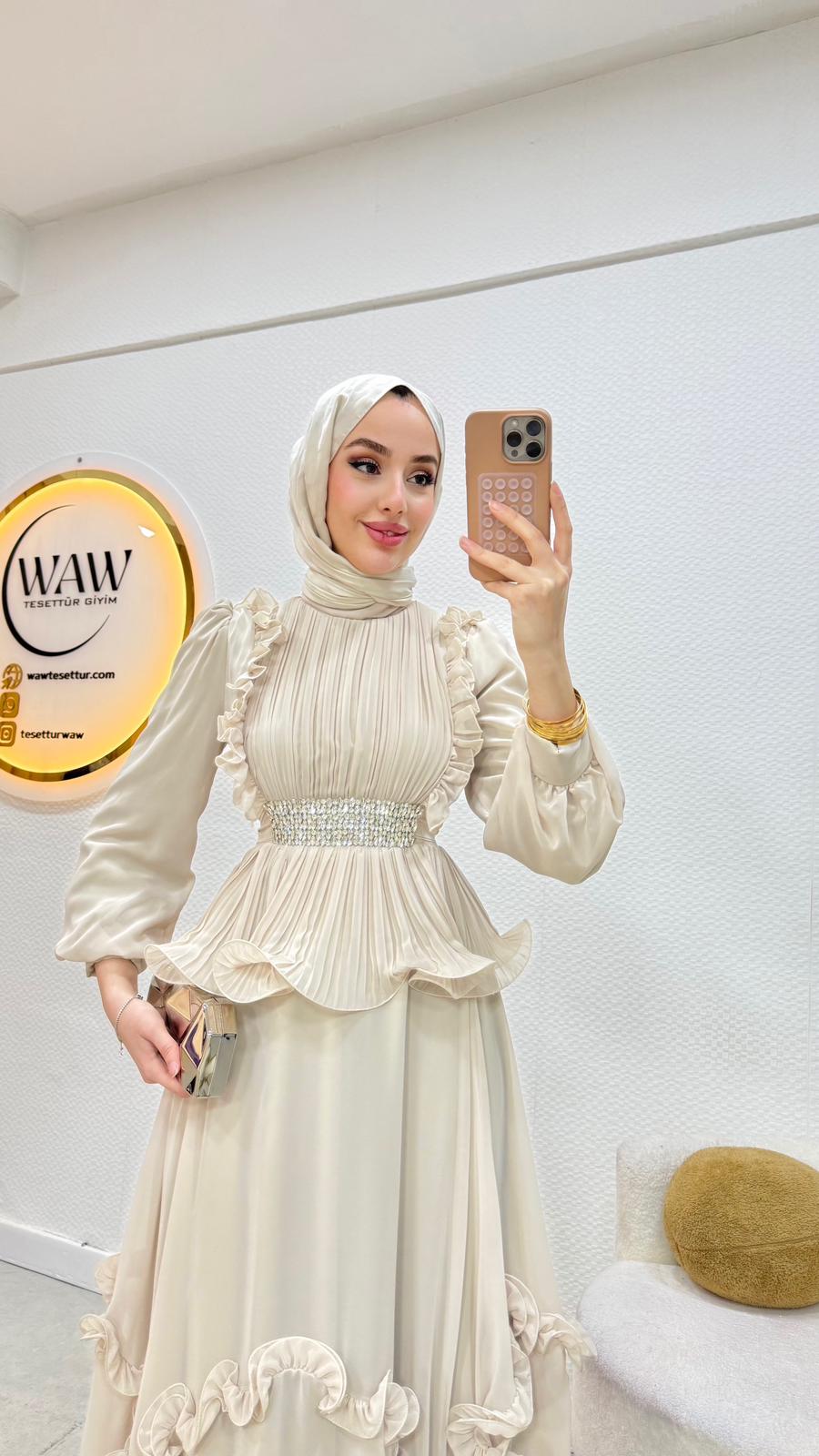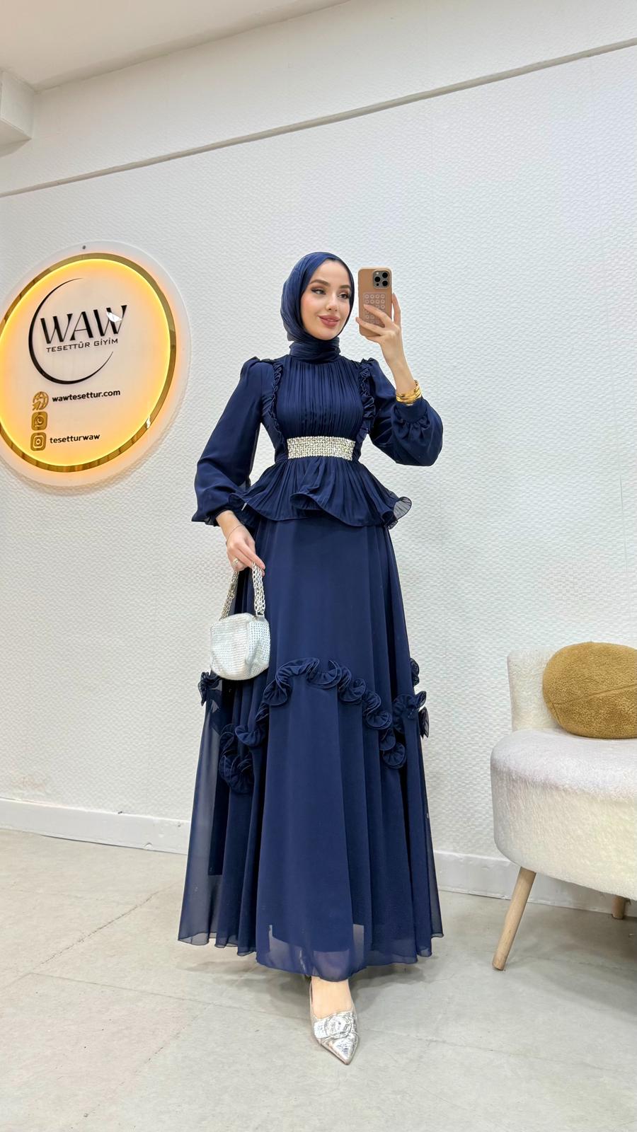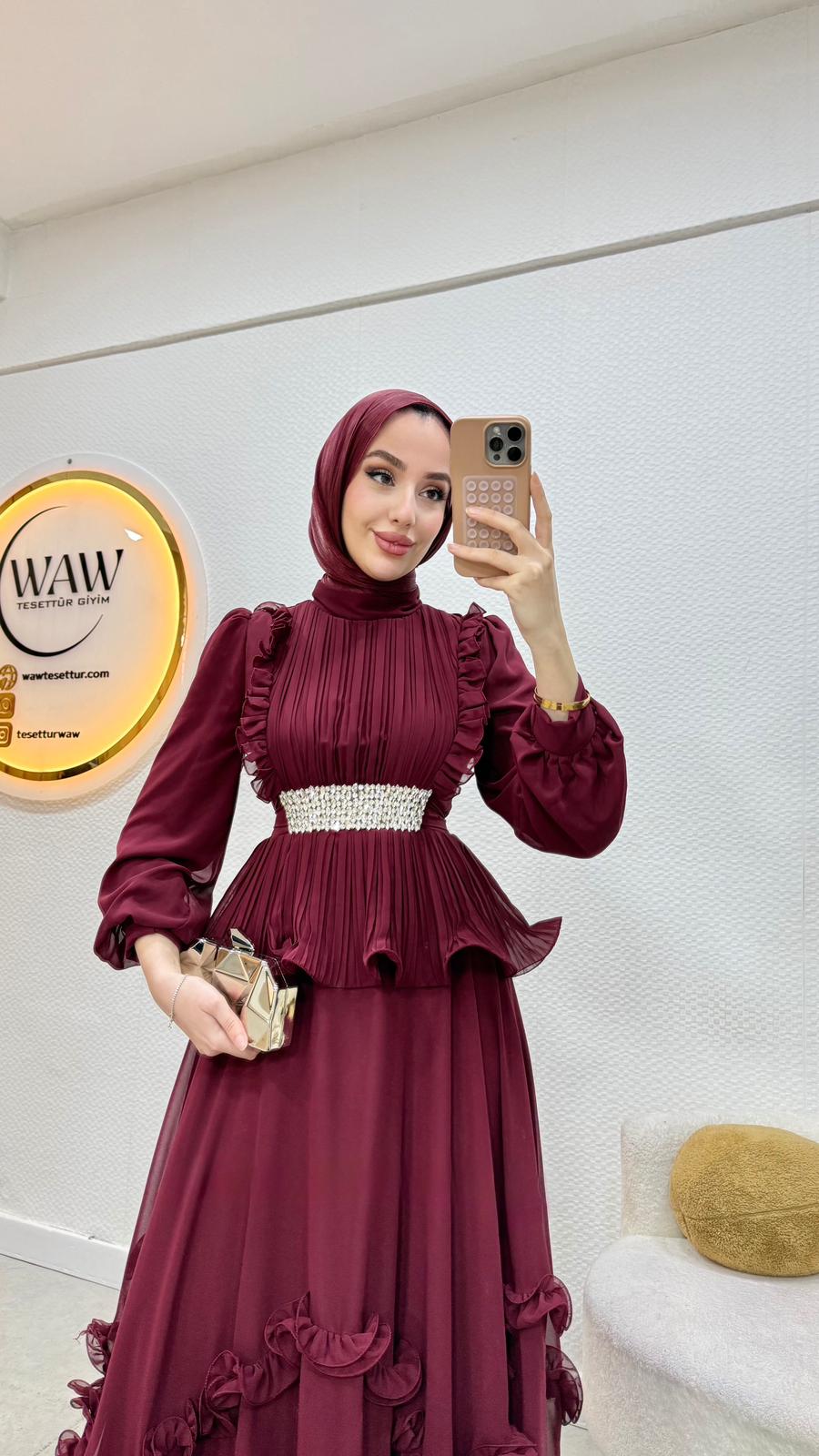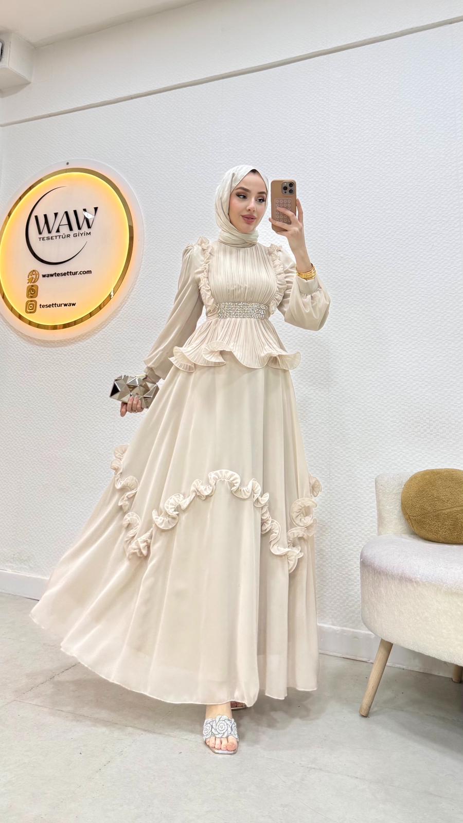 Birinci kalite şifon kumaştır. Arka orta gizli fermuarlıdır. Boy:140cm Beden: tam kalıp Bedenler 36/38/40/42/44Mankenin tercih ettiği beden 38