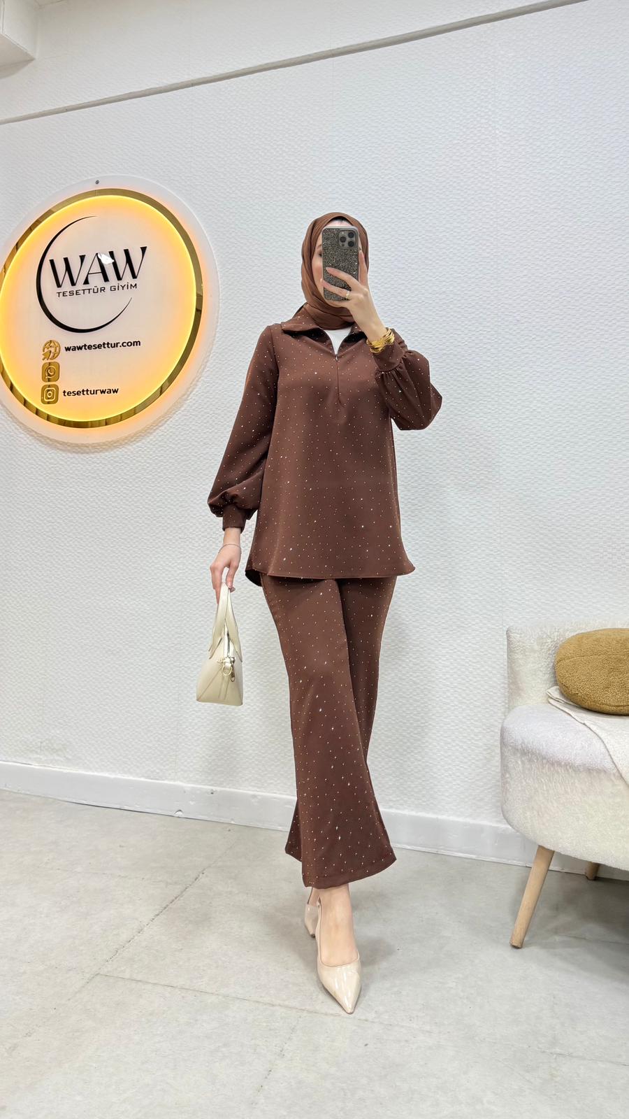 taşlı krep kumaştan üretilmiştirönü fermuarlıdır üst boy 75cmpantolon boyu 100cmürün kalıbı salaş kalıptır36/38/40/42/44çekim mankeni 170/60 kg 38 beden tercih etmektedir