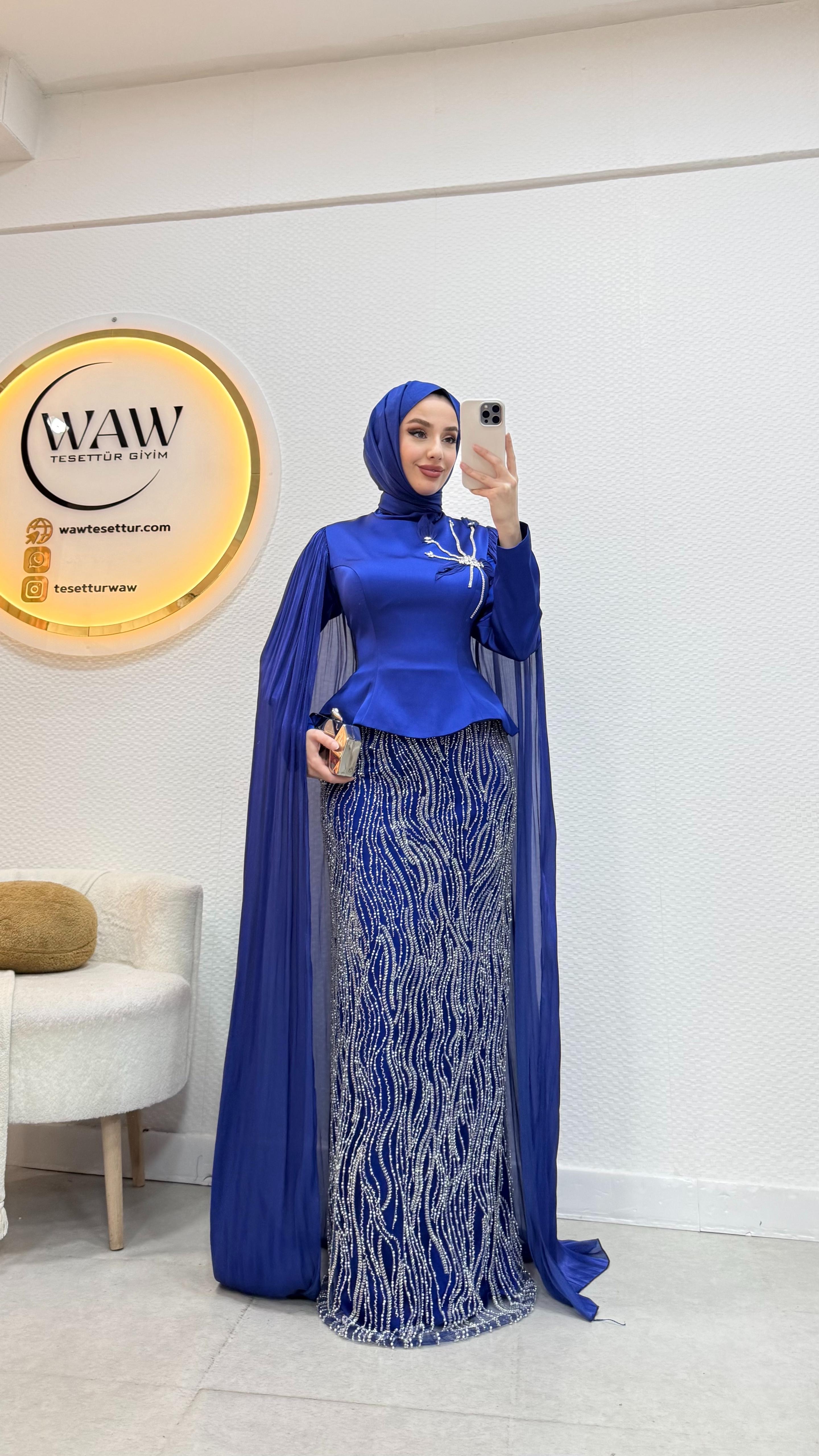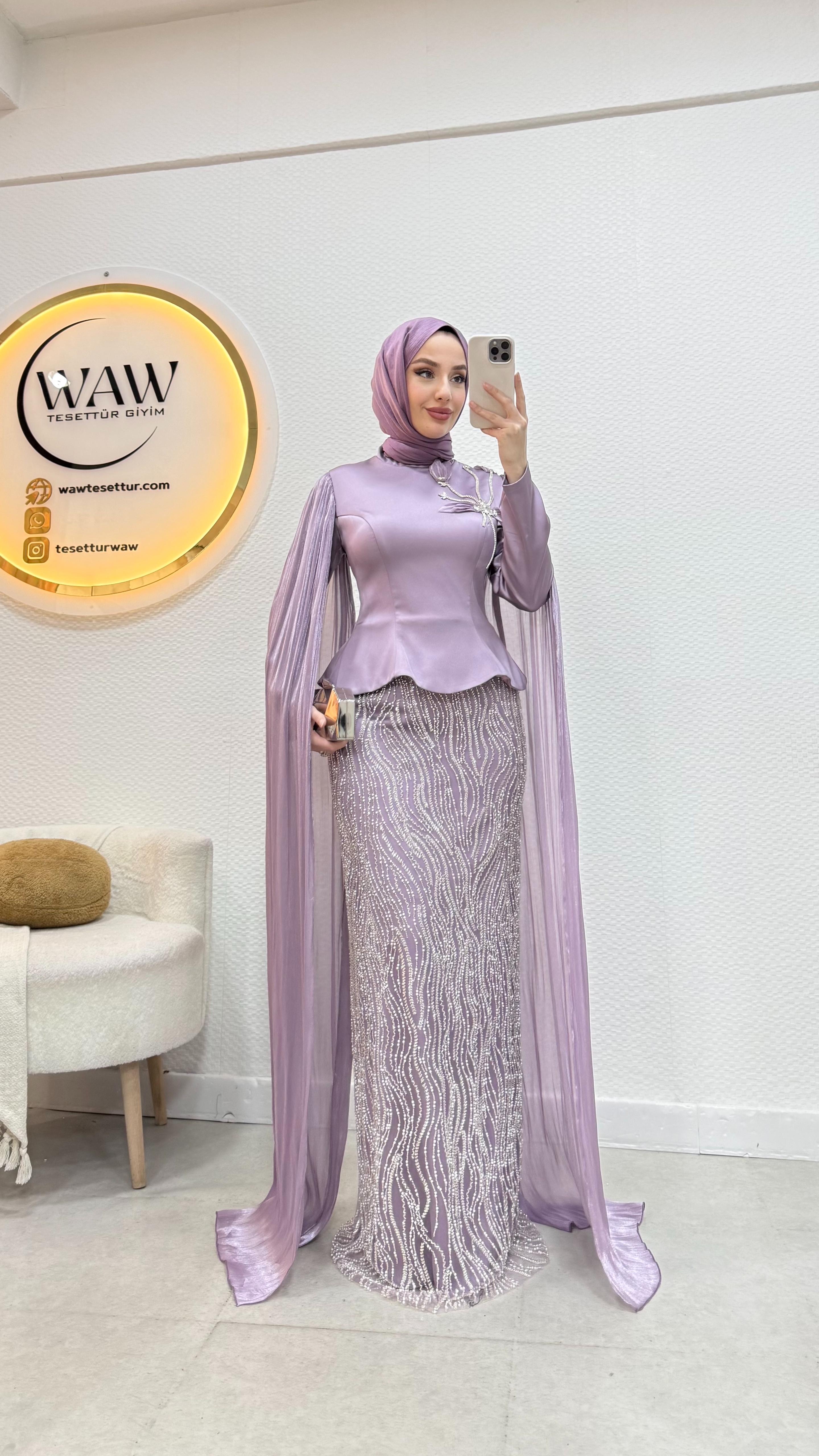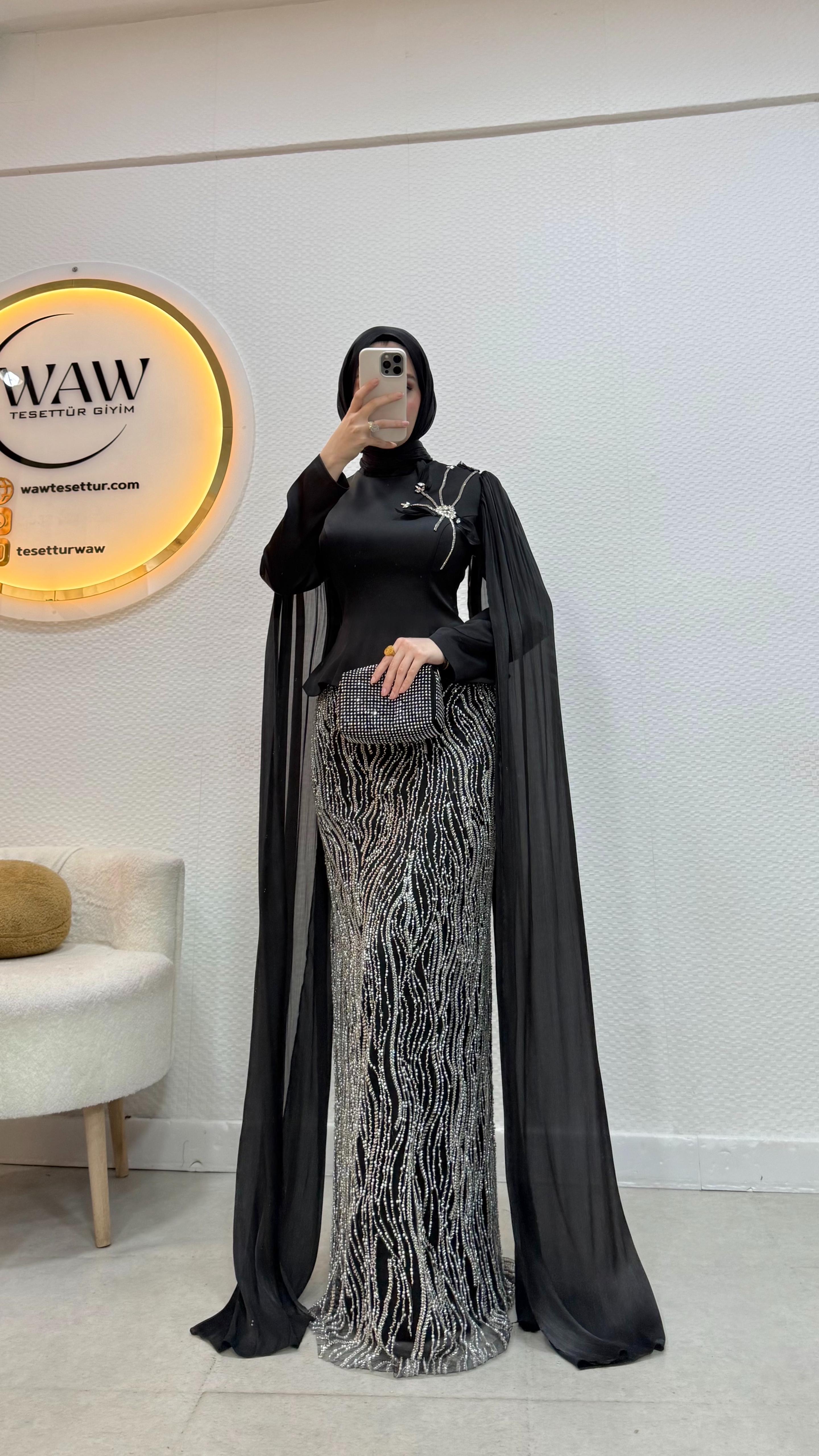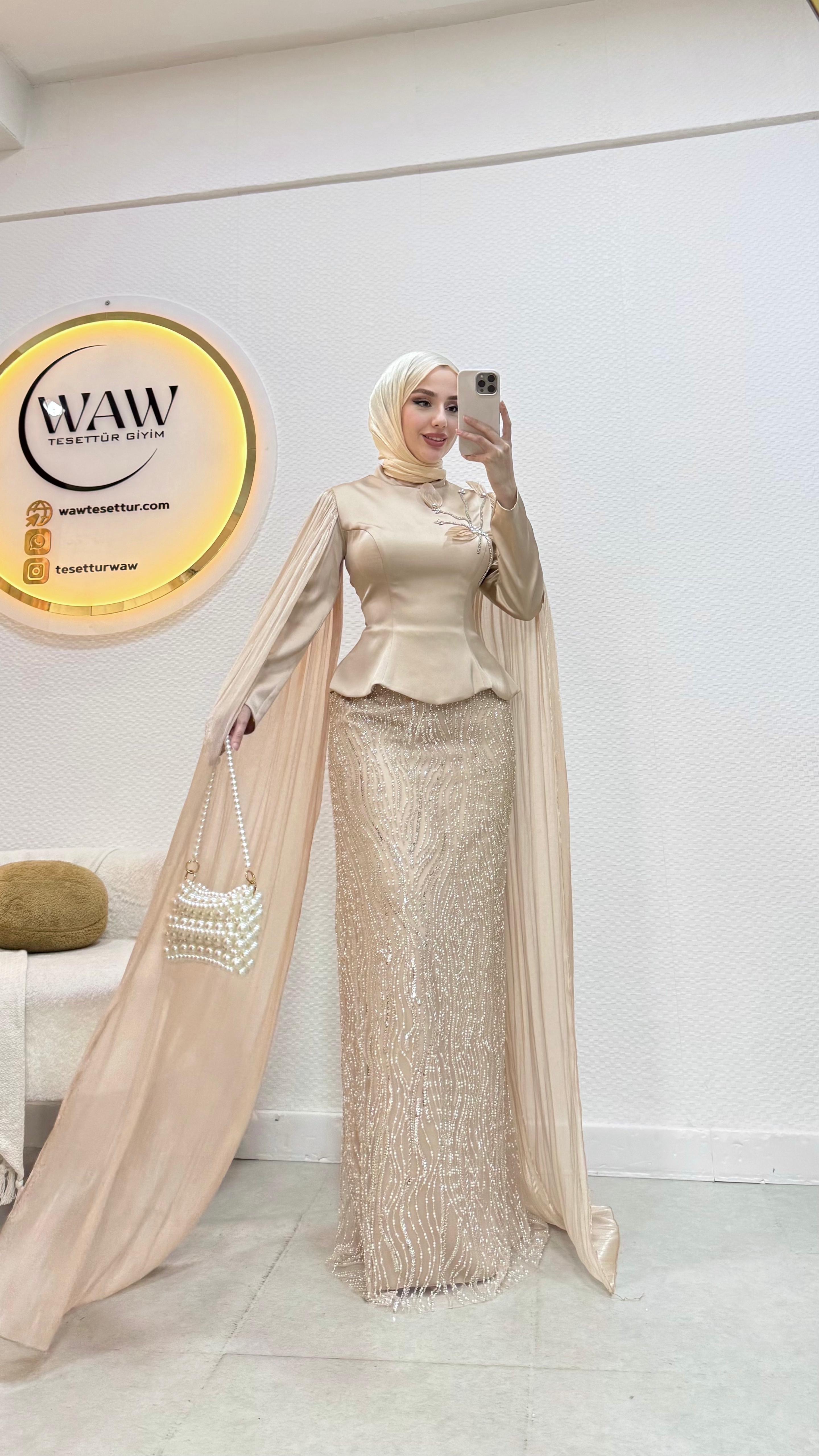 Üst saten, alt taş işleme kumaştan üretilmiştir. Arka orta gizli fermuarlıdır. Pelerini sabittir. Hakim yakadır,göğüs detayı yapıştırmadır. Tam kalıptır. Boy:145cm Bedenler 36/38/40/42/44/46 Manken 170/60kg 38 giymektedir.