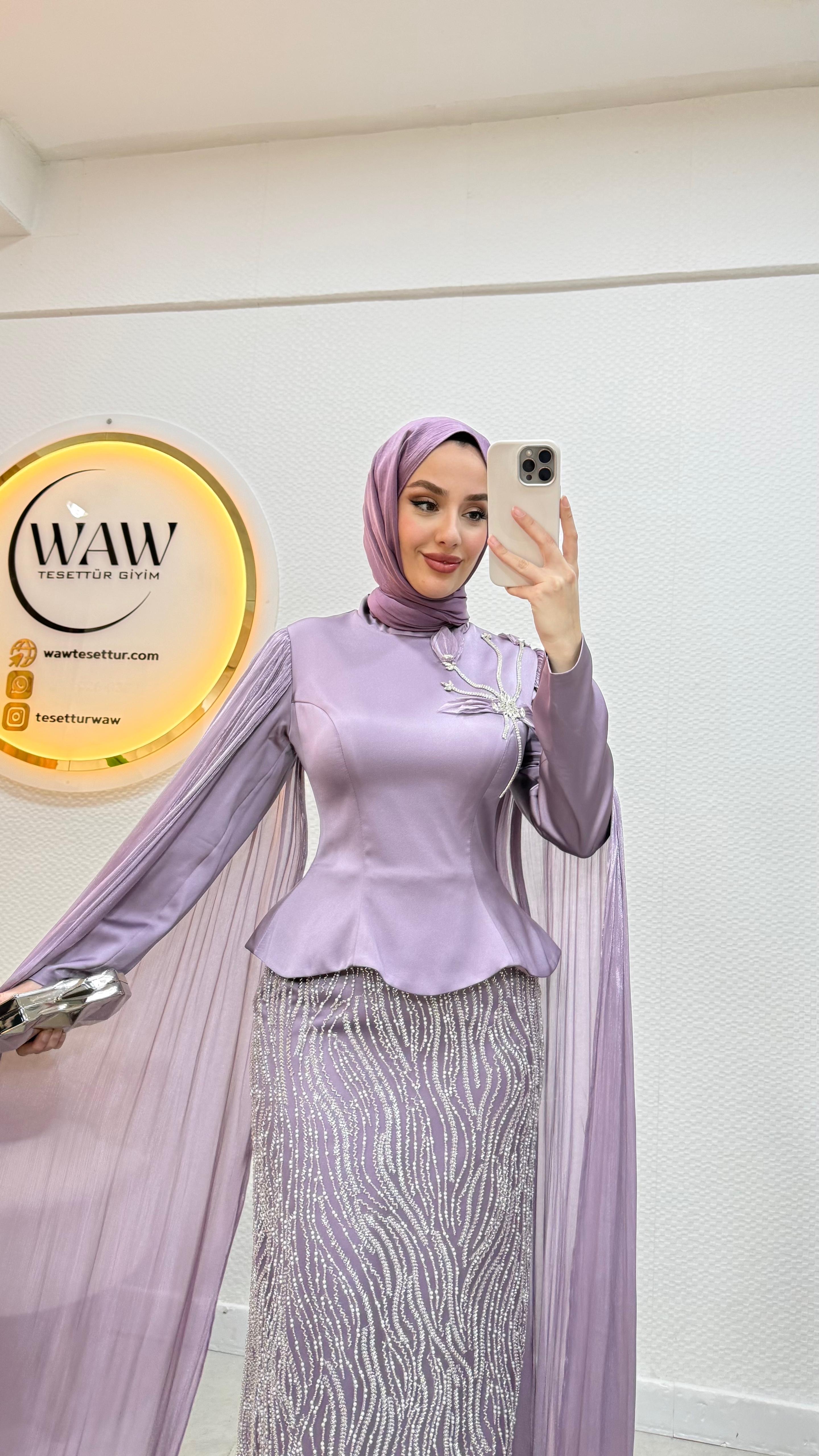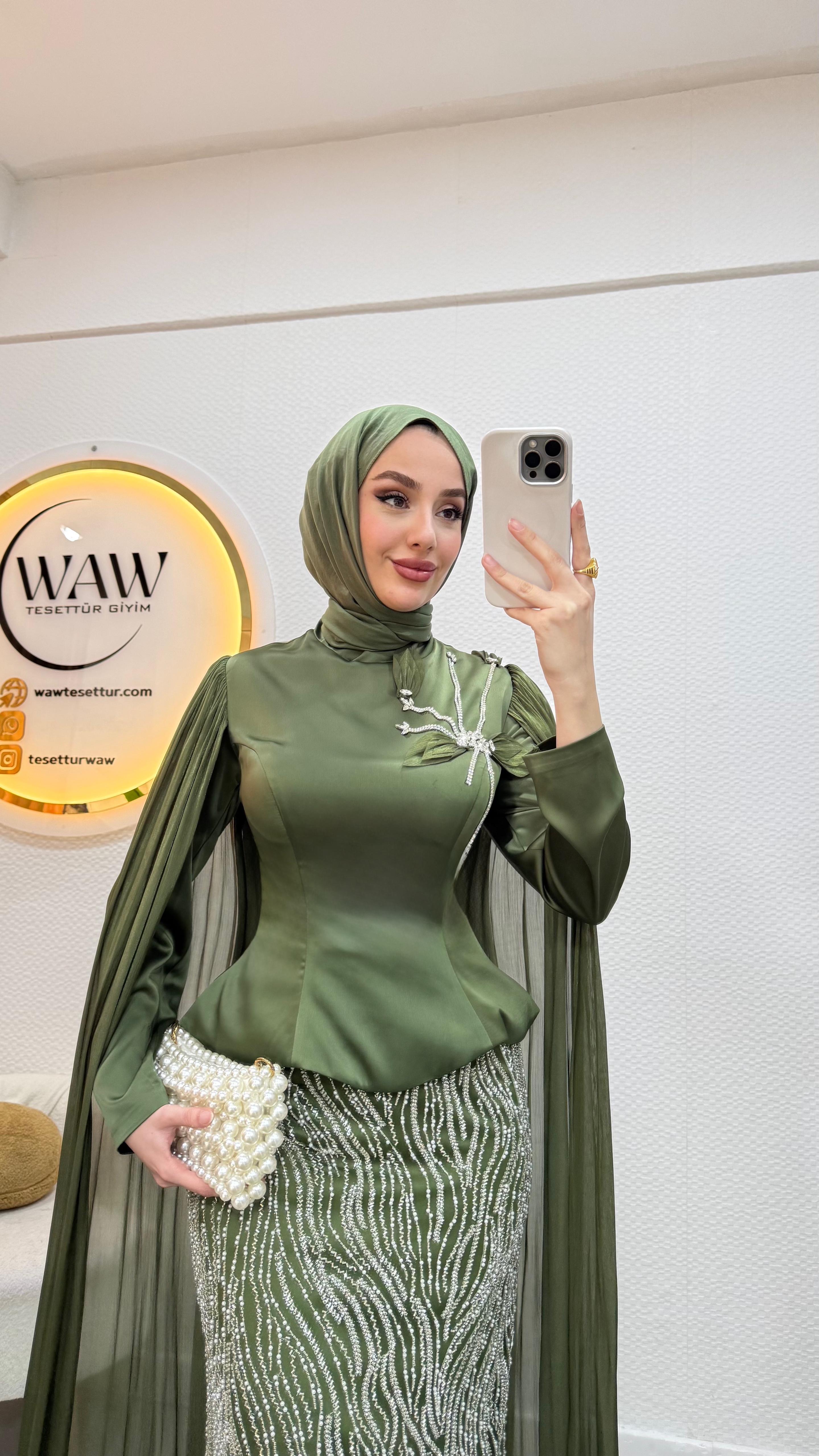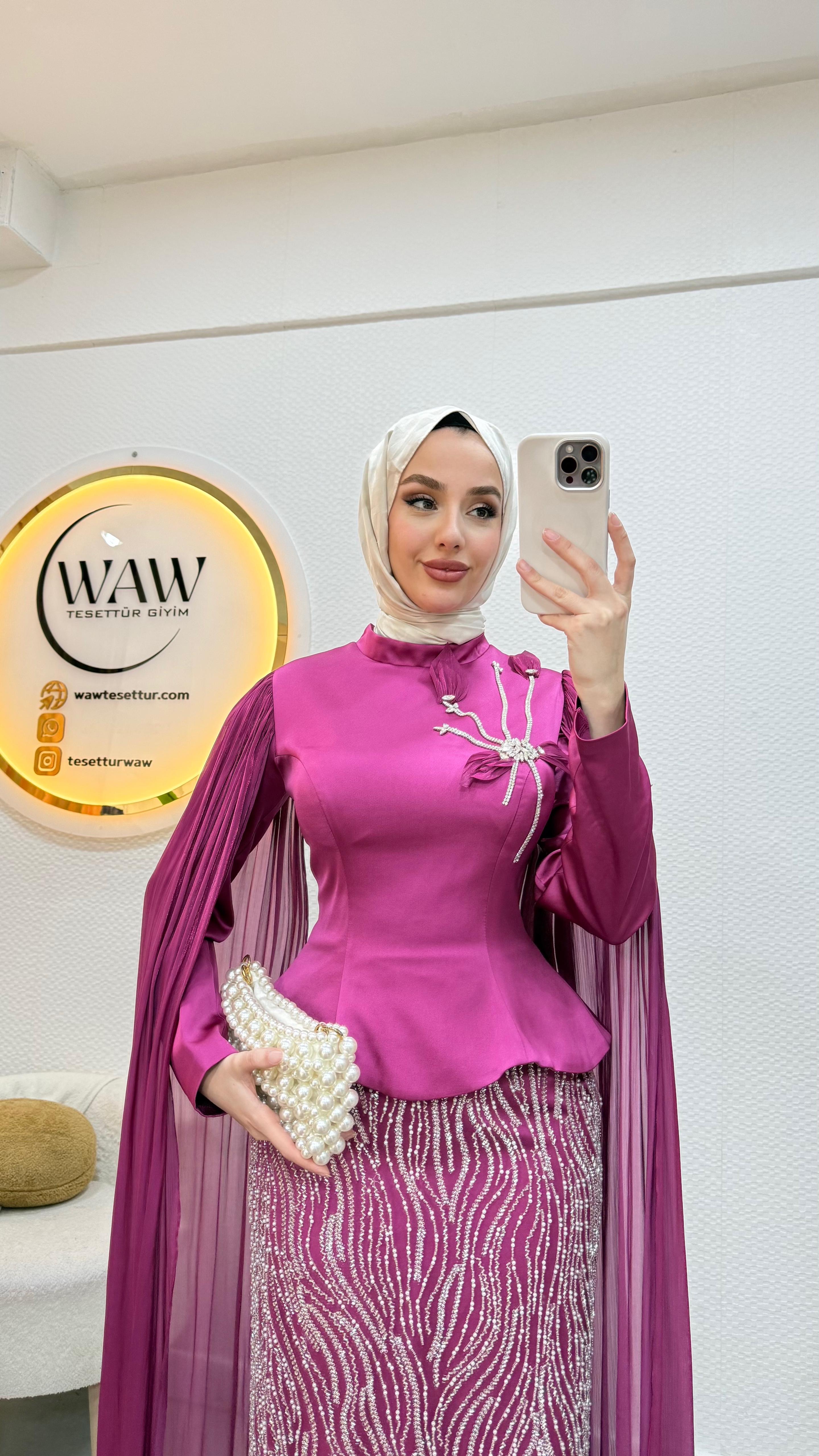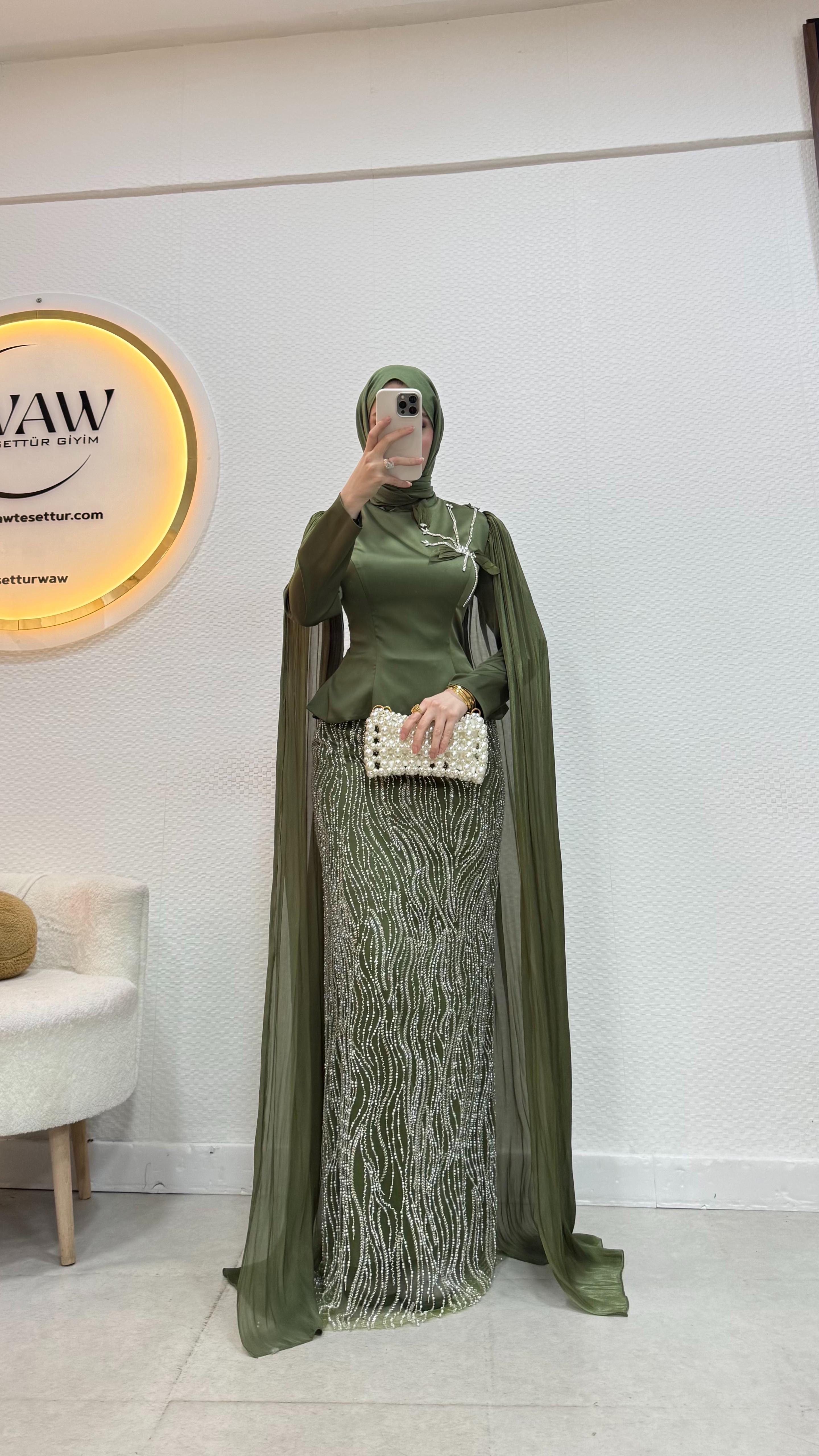 Üst saten, alt taş işleme kumaştan üretilmiştir. Arka orta gizli fermuarlıdır. Pelerini sabittir. Hakim yakadır,göğüs detayı yapıştırmadır. Tam kalıptır. Boy:145cm Bedenler 36/38/40/42/44/46 Manken 170/60kg 38 giymektedir.