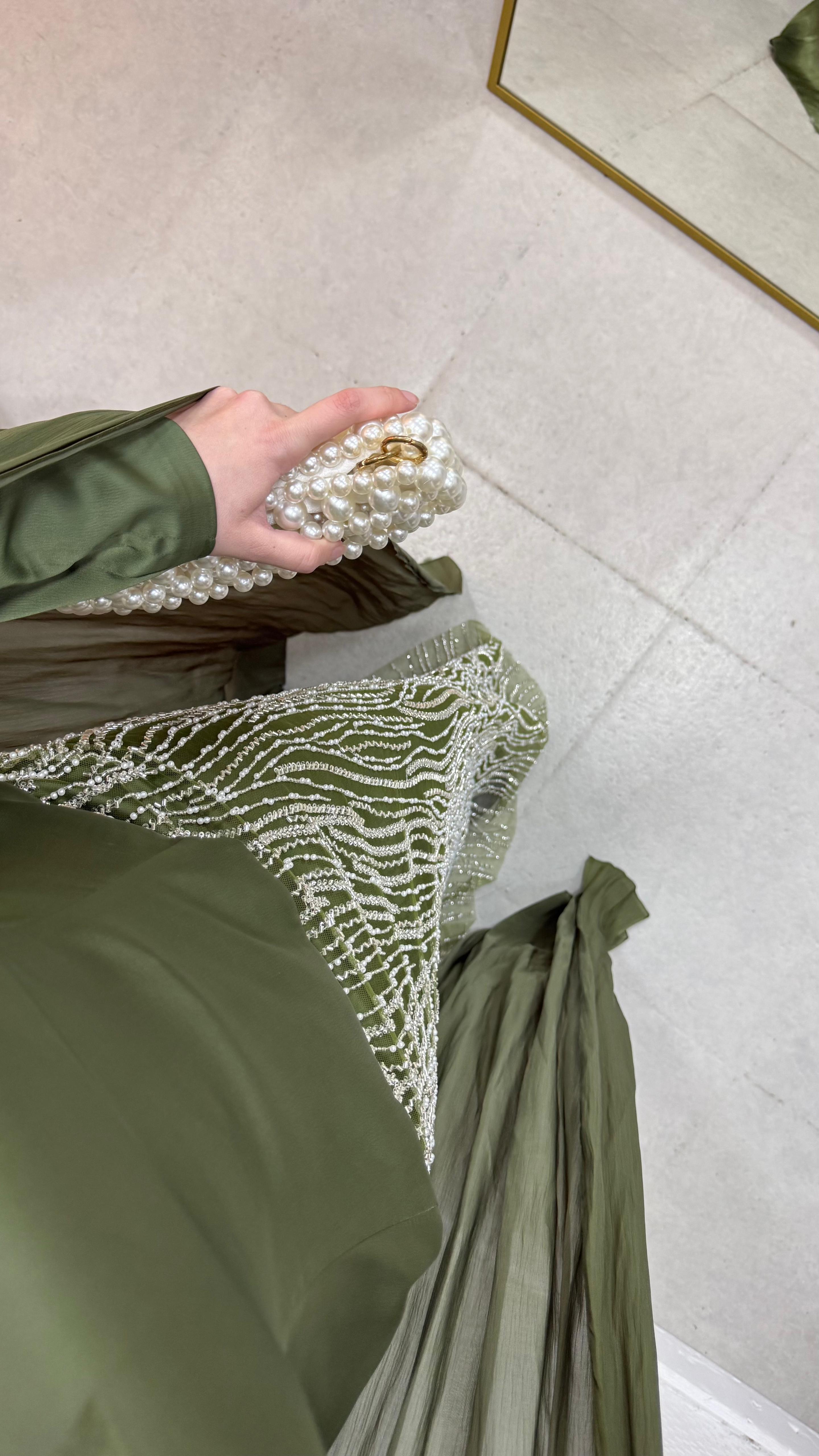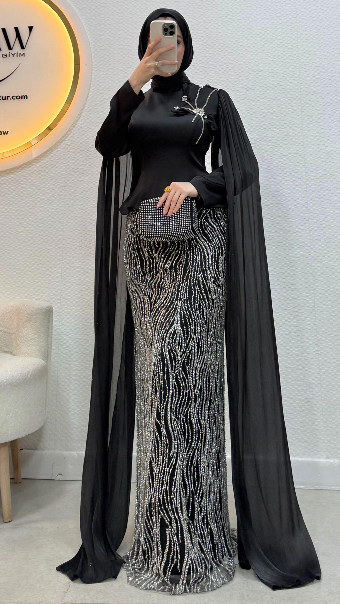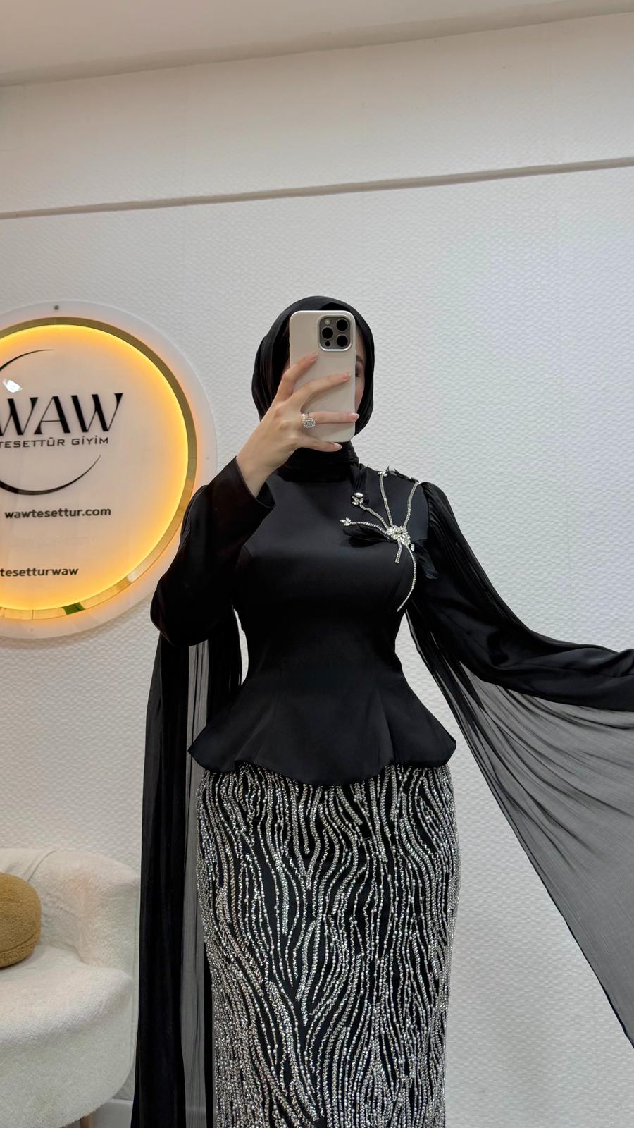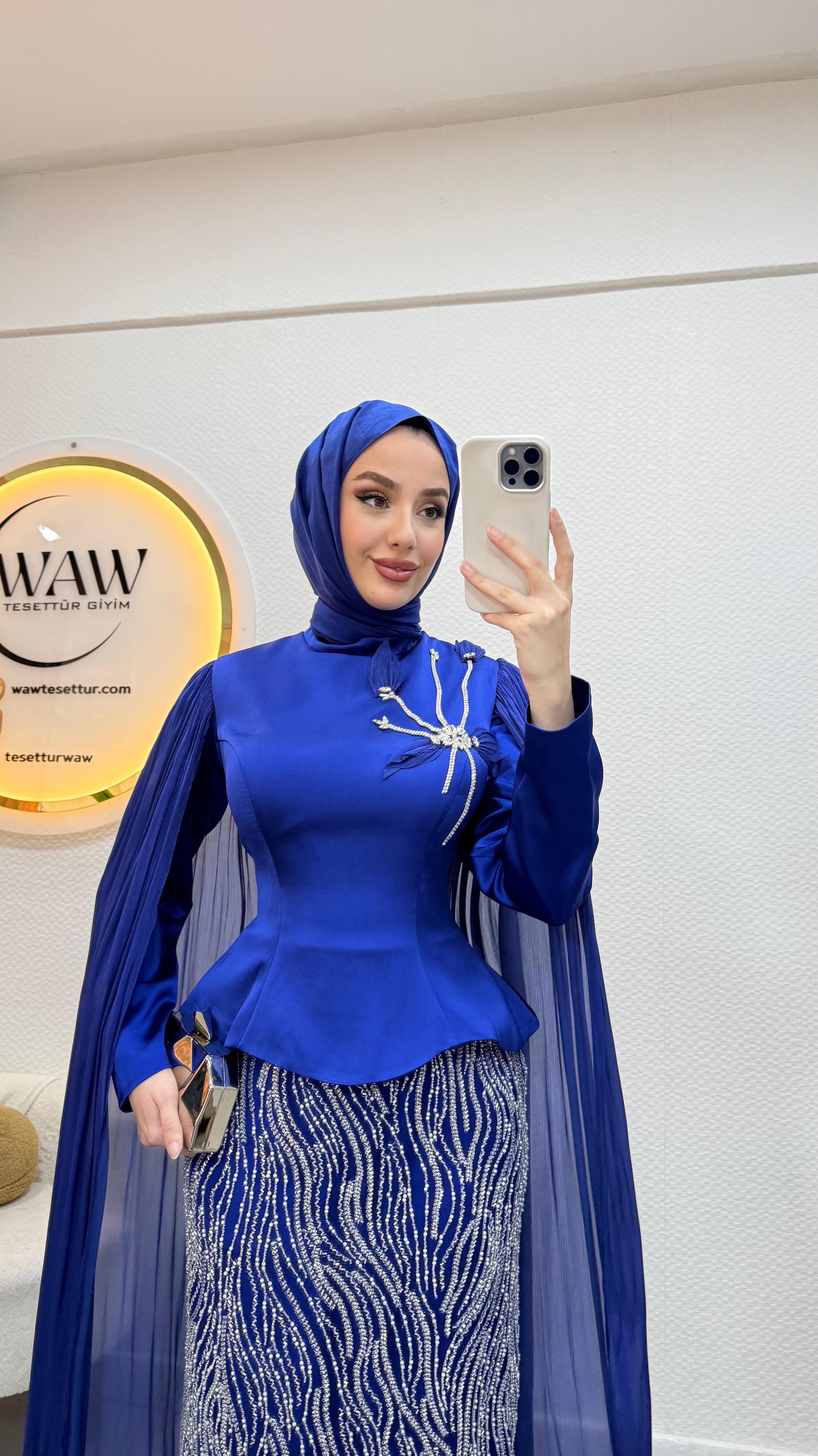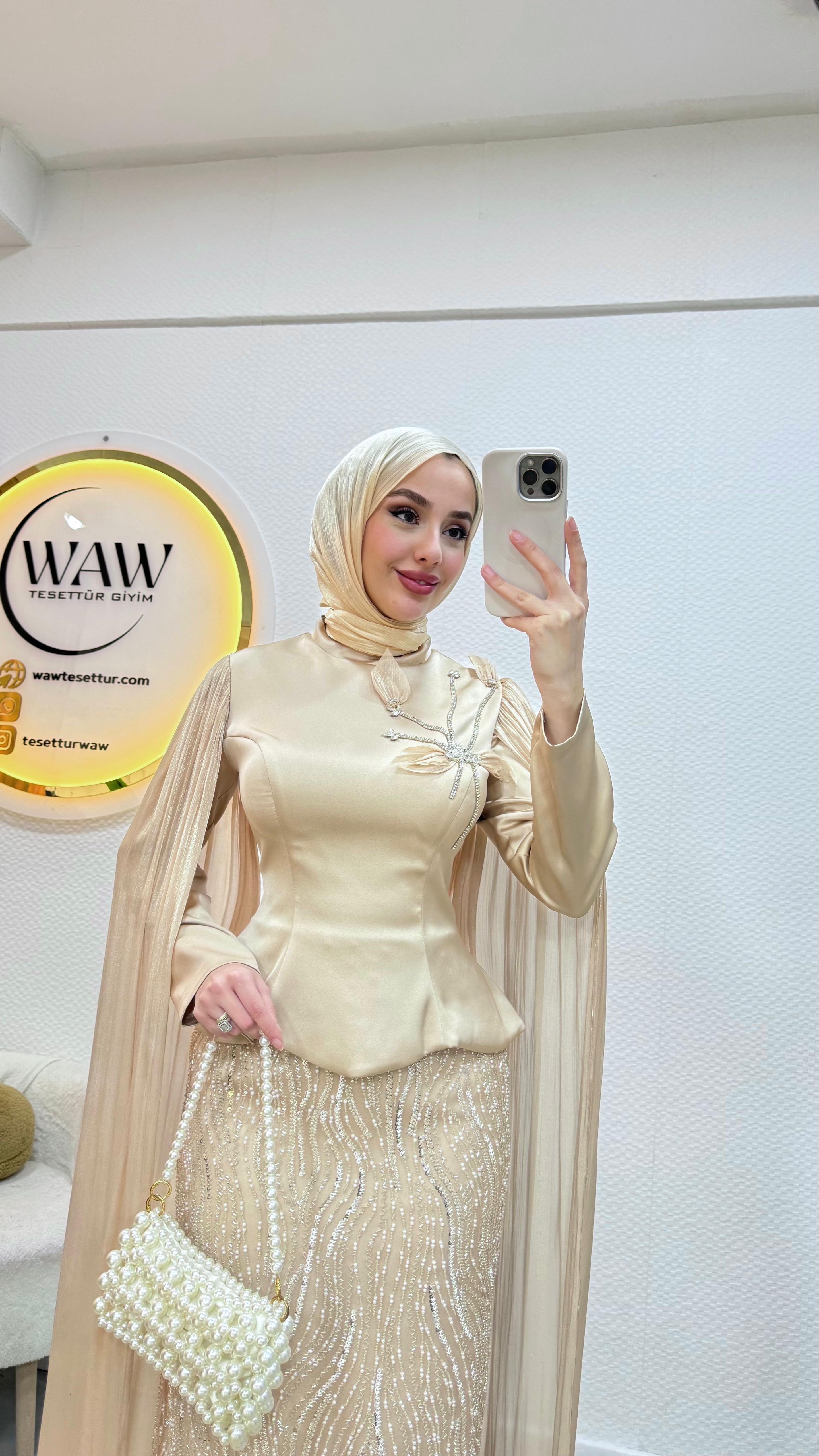 Üst saten, alt taş işleme kumaştan üretilmiştir. Arka orta gizli fermuarlıdır. Pelerini sabittir. Hakim yakadır,göğüs detayı yapıştırmadır. Tam kalıptır. Boy:145cm Bedenler 36/38/40/42/44/46 Manken 170/60kg 38 giymektedir.