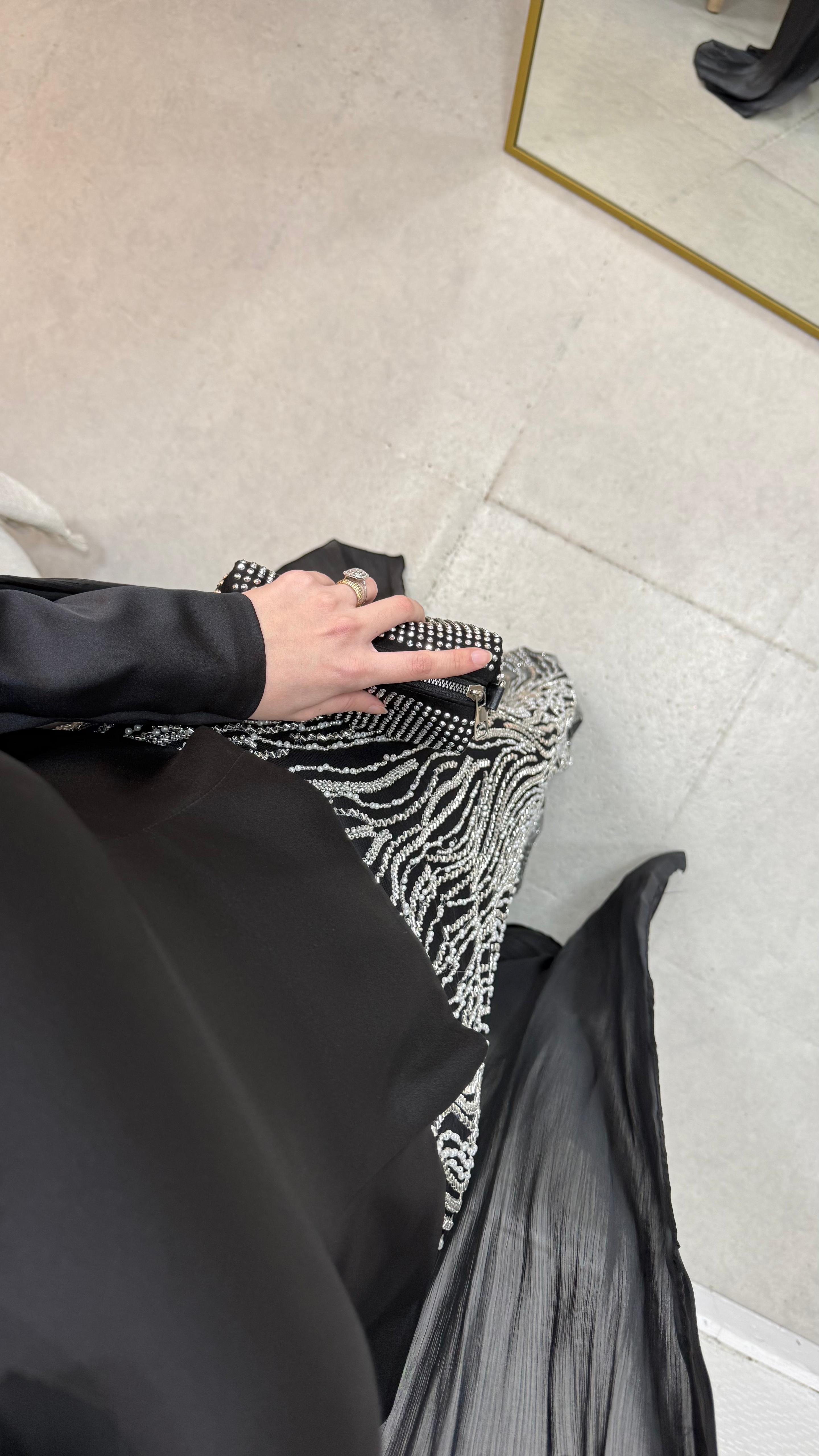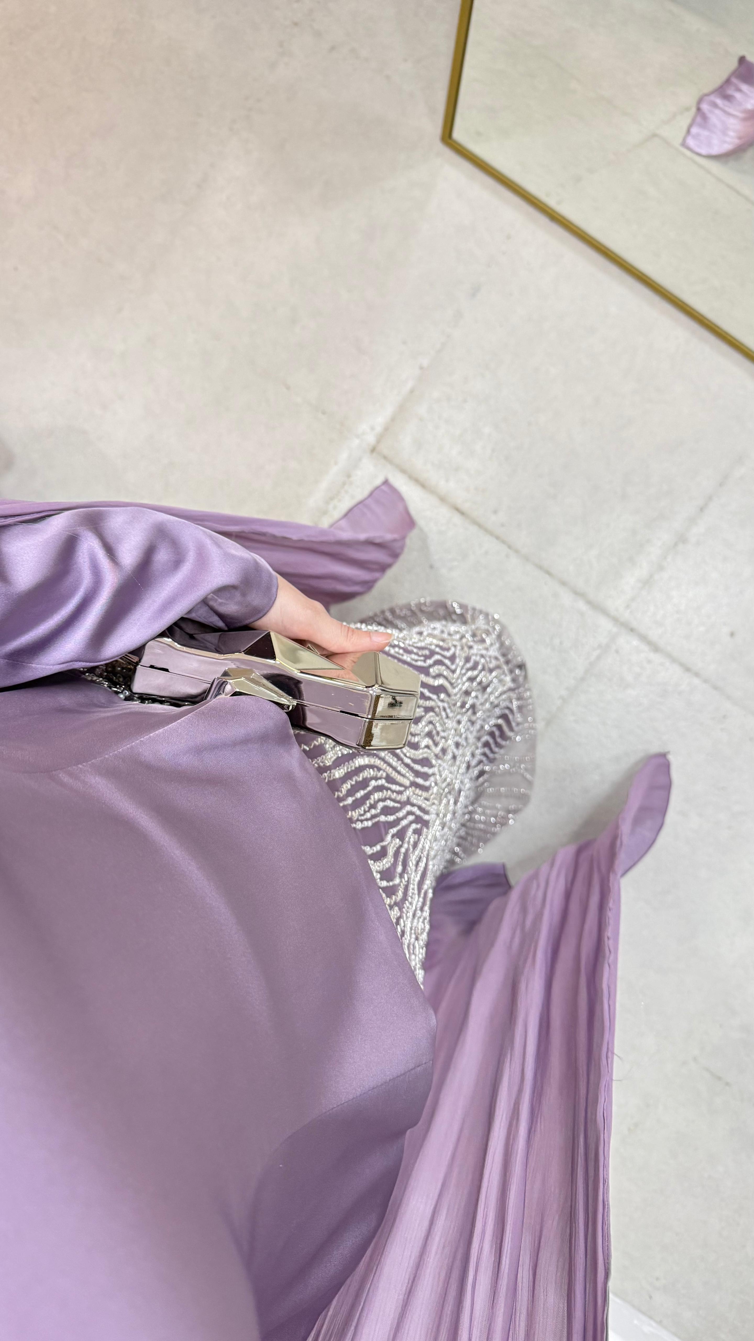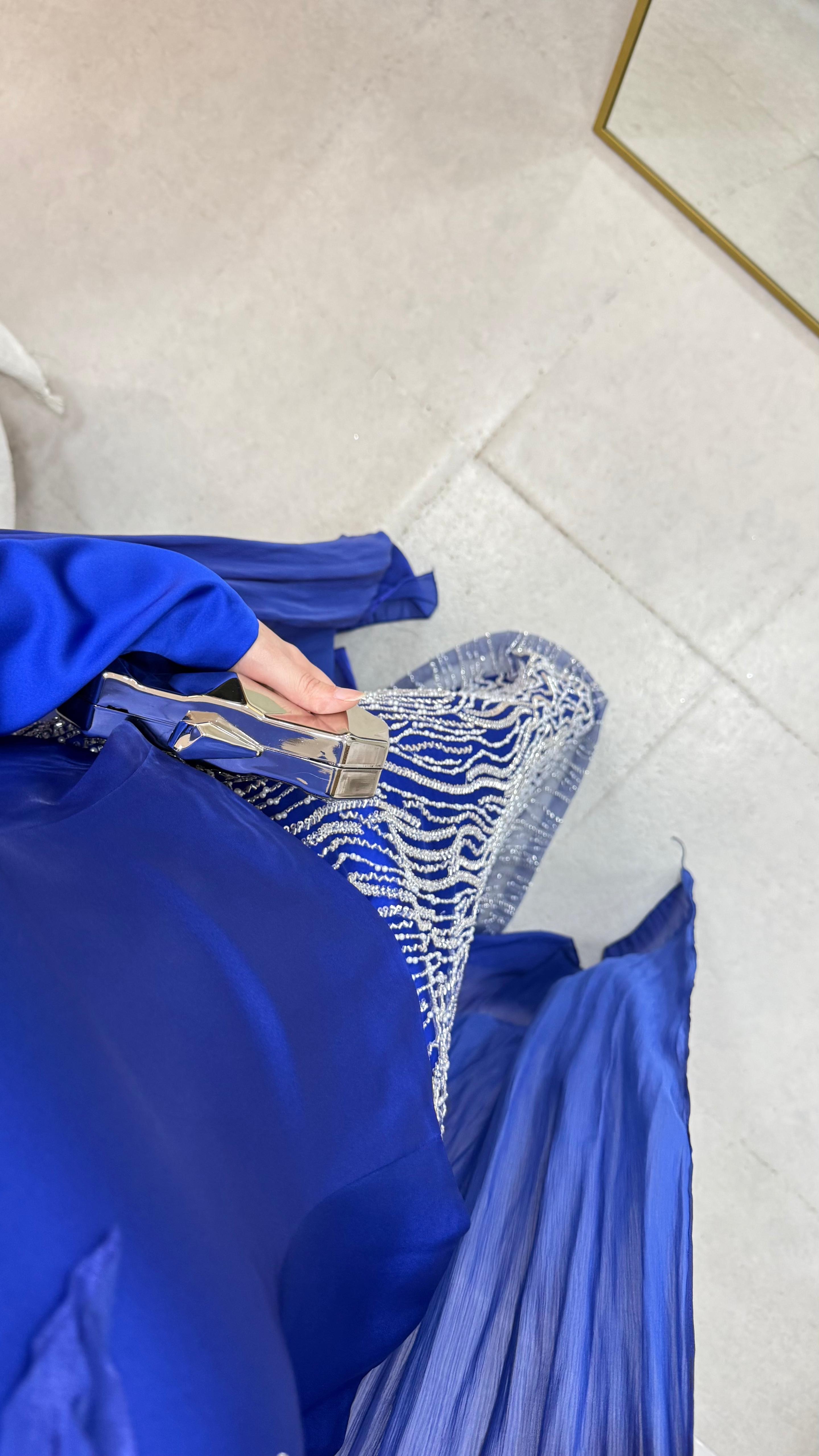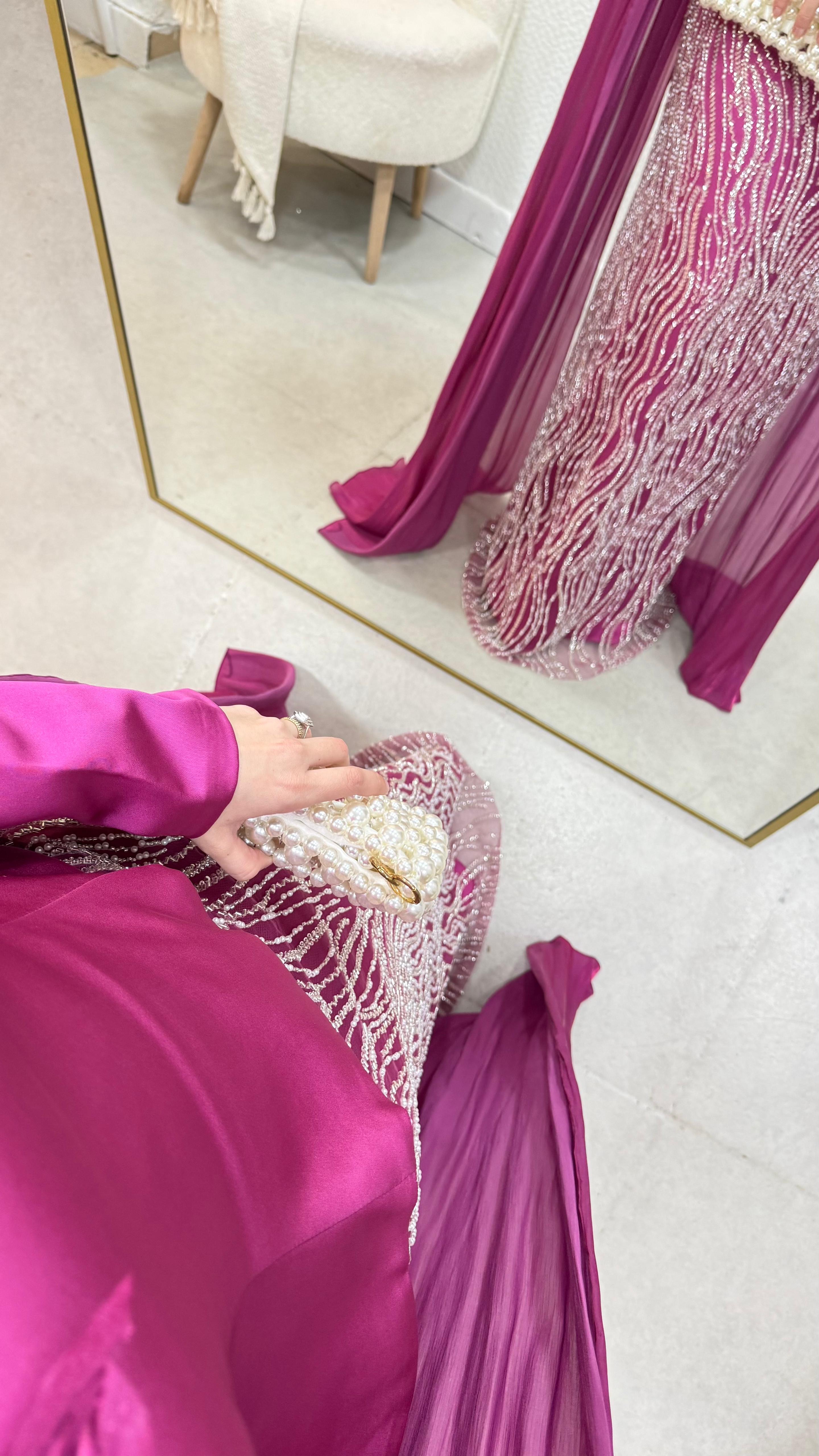 Üst saten, alt taş işleme kumaştan üretilmiştir. Arka orta gizli fermuarlıdır. Pelerini sabittir. Hakim yakadır,göğüs detayı yapıştırmadır. Tam kalıptır. Boy:145cm Bedenler 36/38/40/42/44/46 Manken 170/60kg 38 giymektedir.