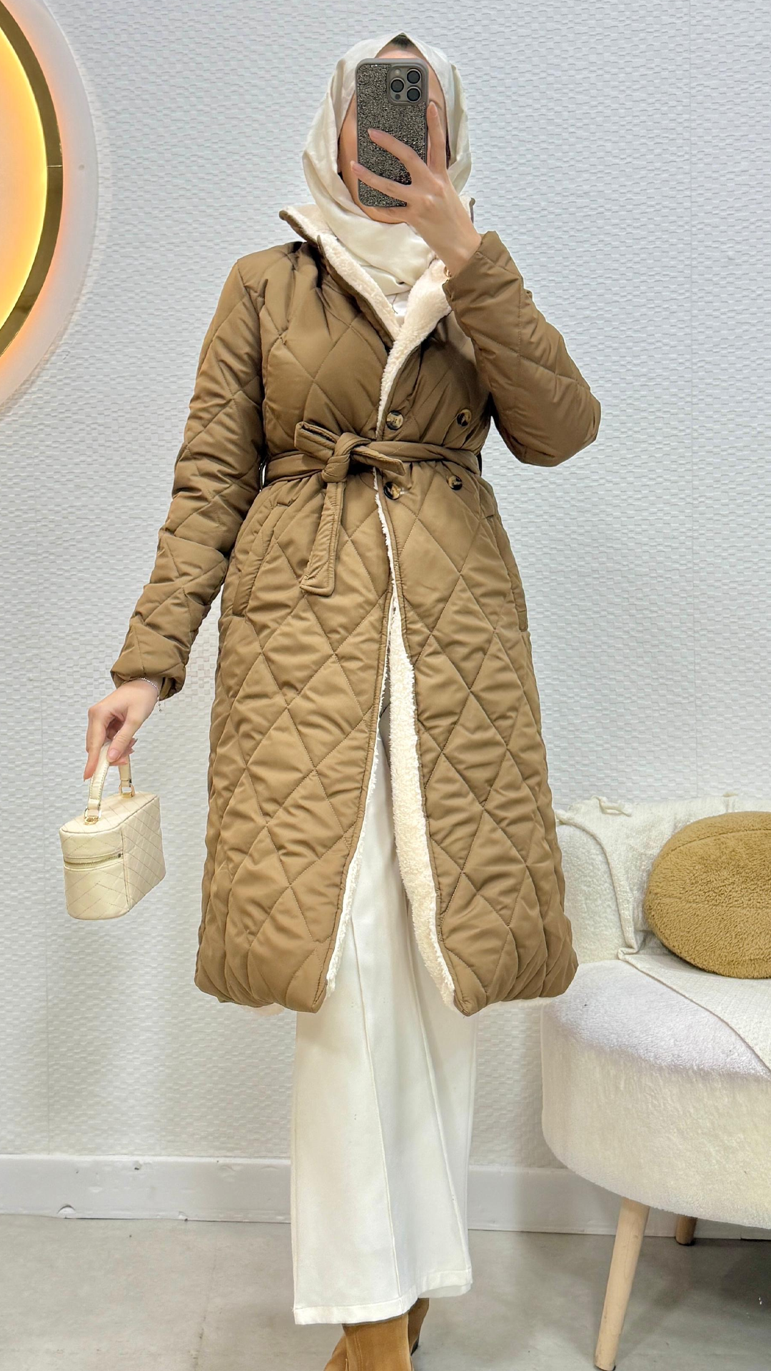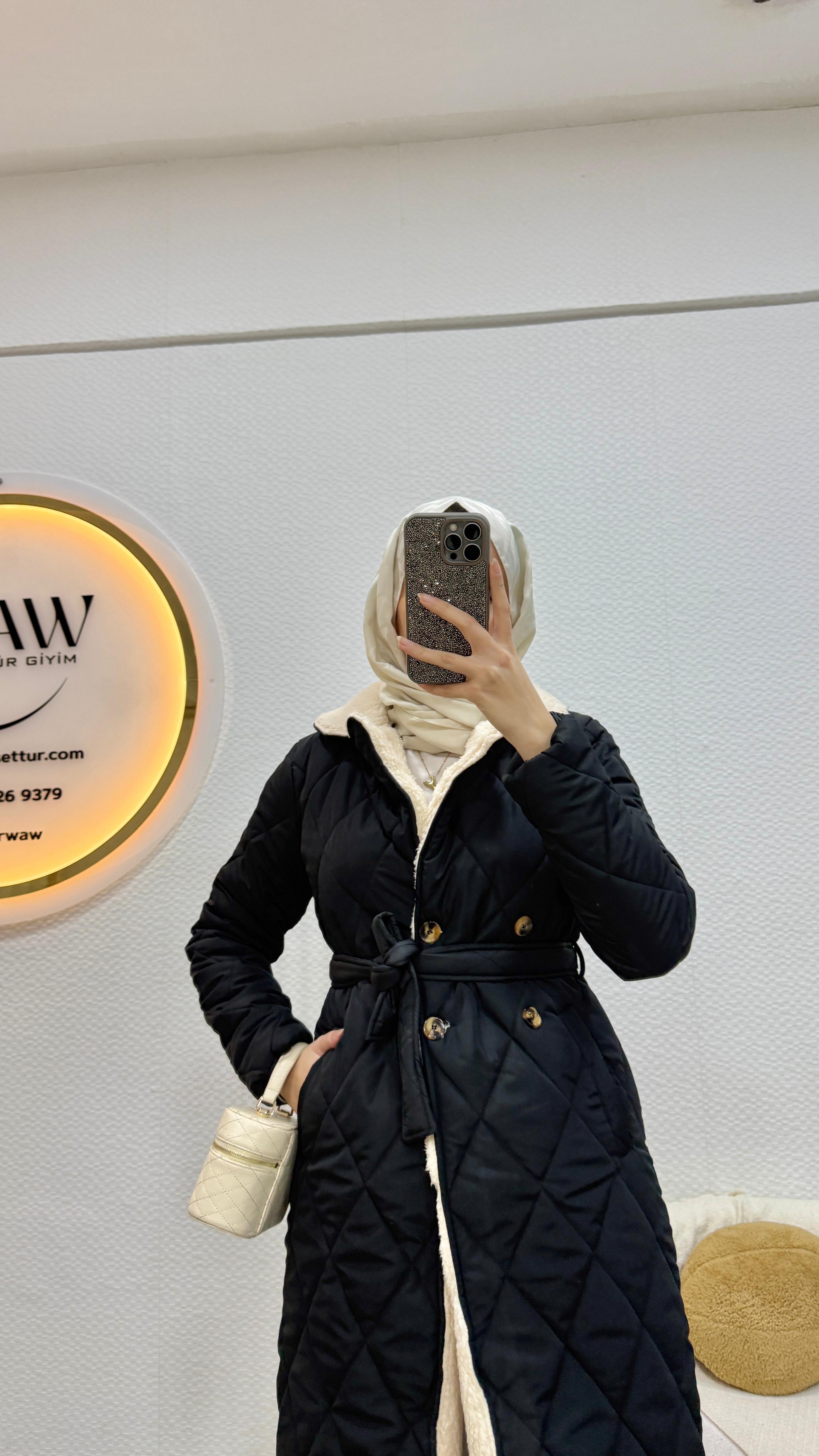İçi dolgulu kapitone kumaştan üretilmiştir. İçi kürklüdür,sıcak tutar. Seyyar kemerlidir. Düğmelidir.