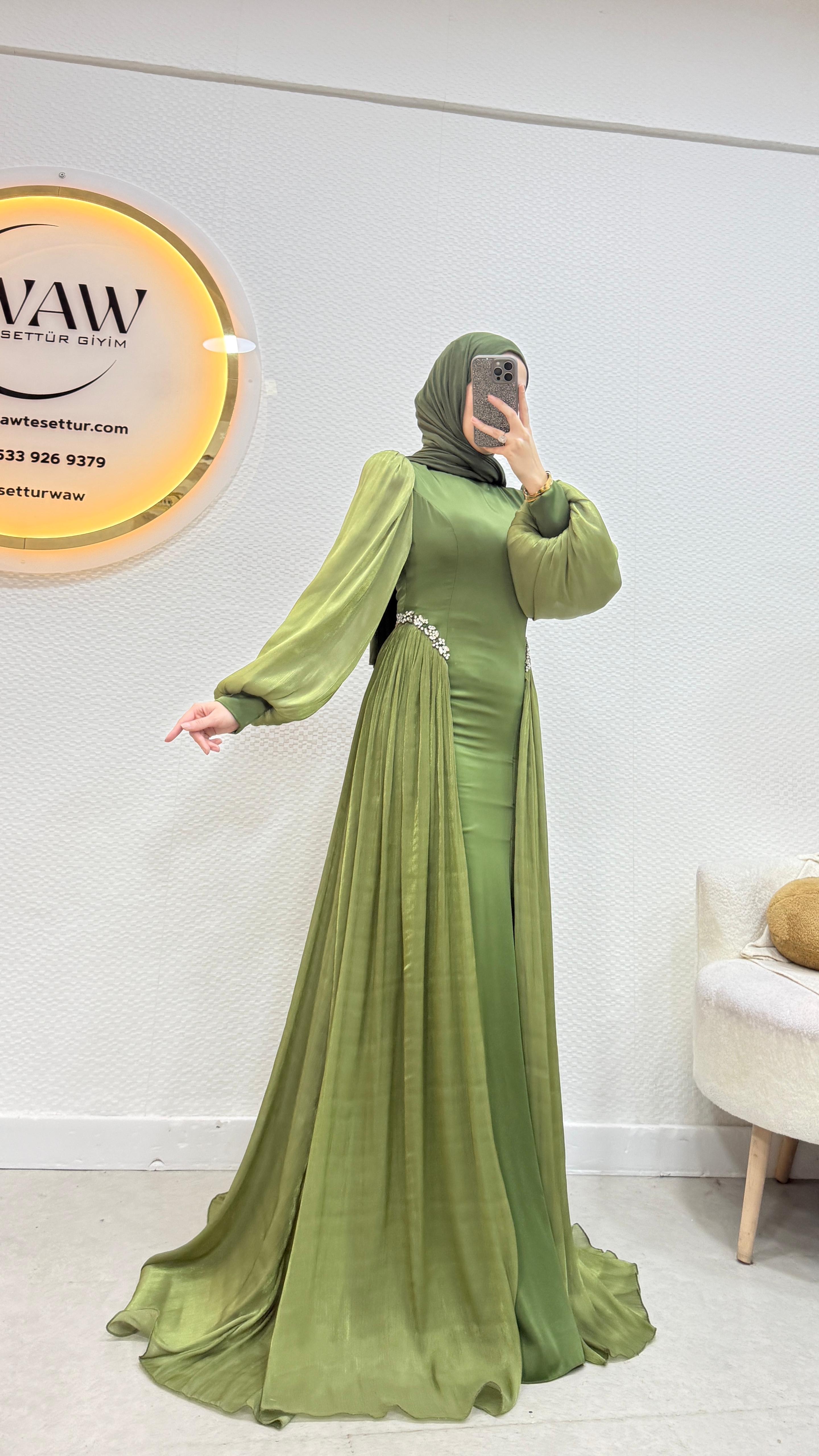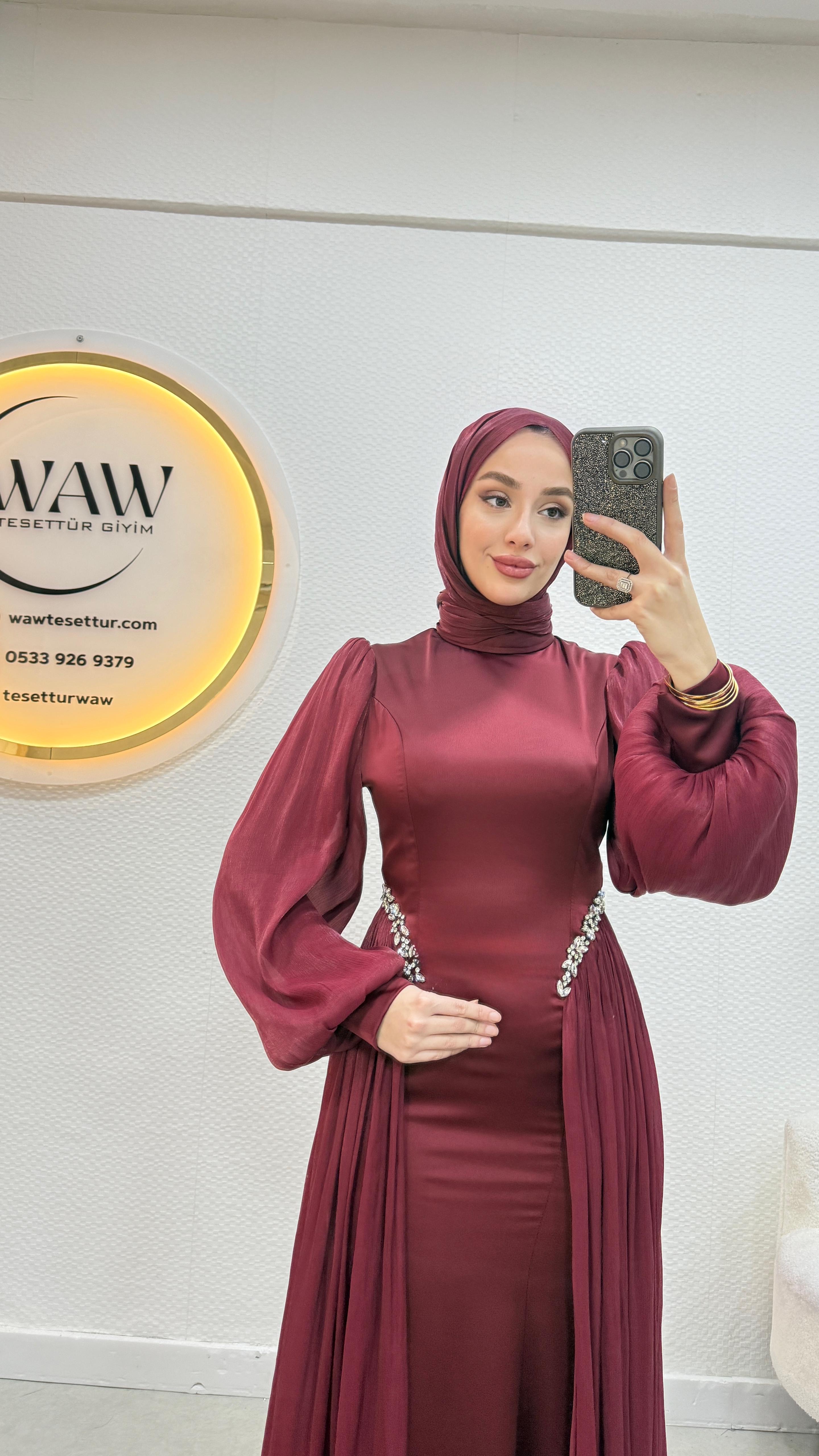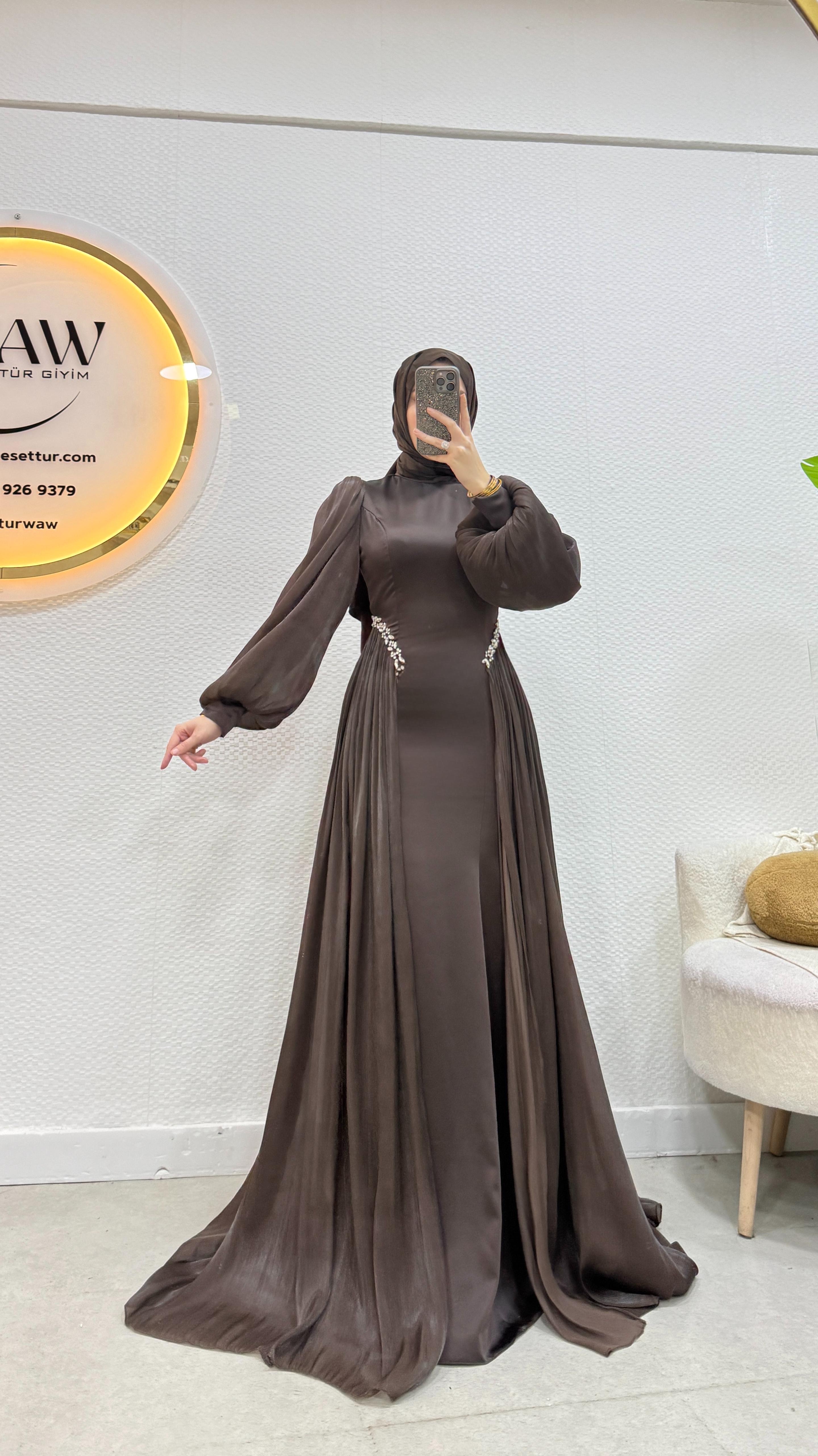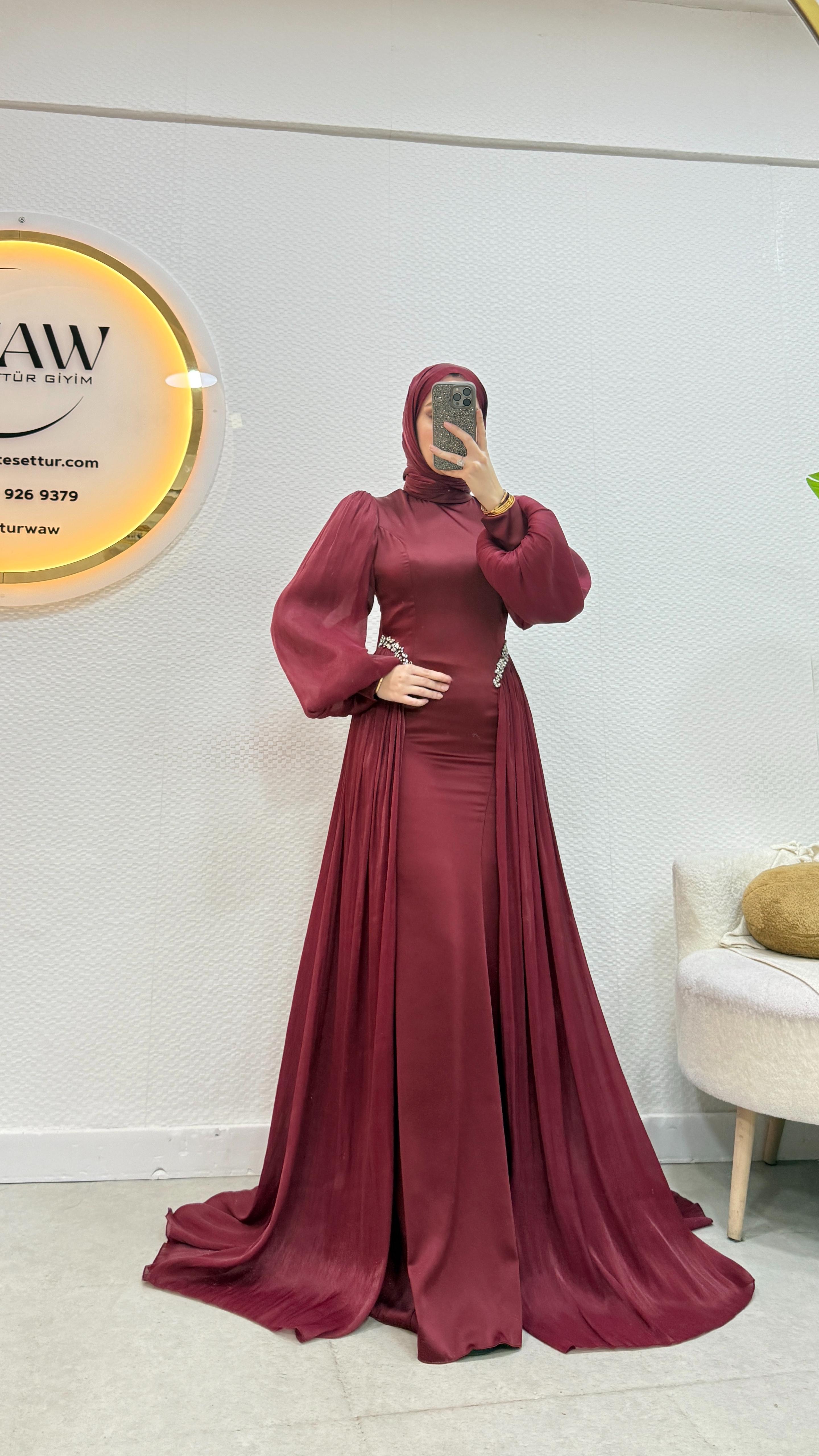 Gelince Haber VerÜrünümüz birinci kalite saten kumaştan üretilmiştir. Kuyruk ve kol sofya kumaştır. 36/38/40/42/44 bedenler mevcuttur. Arka orta gizli fermuarlıdır. Taş işlemelidir. Ürün boyu 145cm’dir. Kalem formdadır. Manken 170/60kg 38 giymektedir.