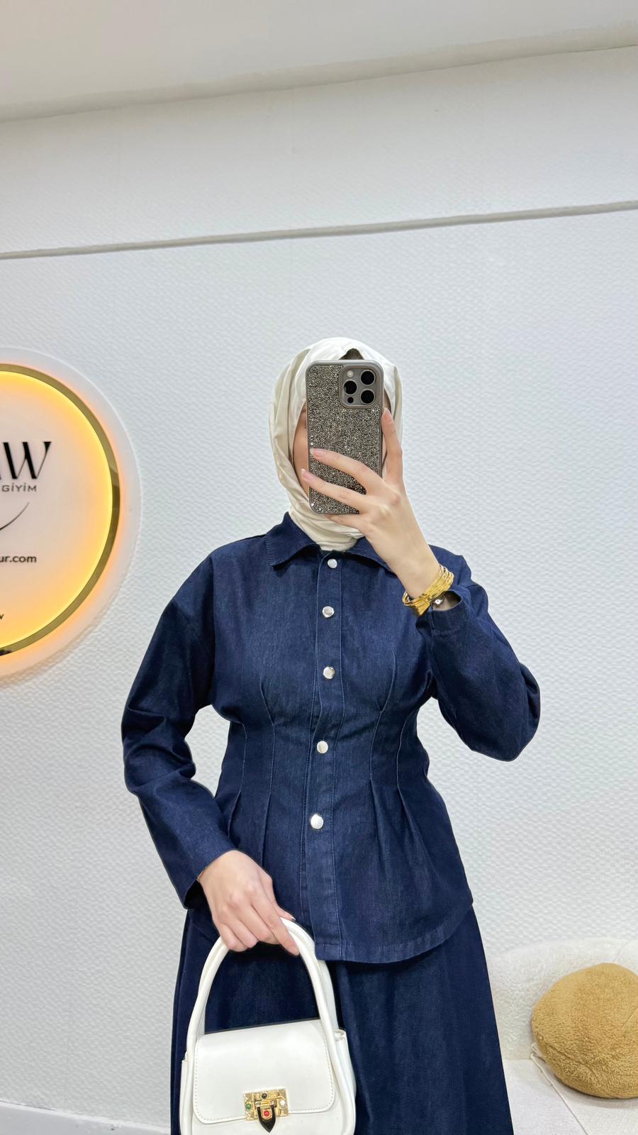 Etek/gömlek şeklinde ikili takımdır.