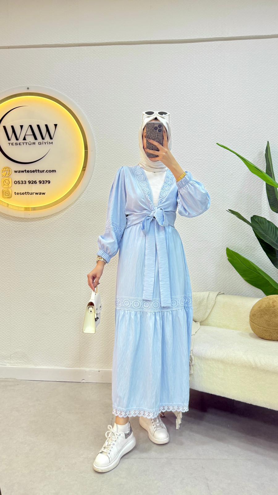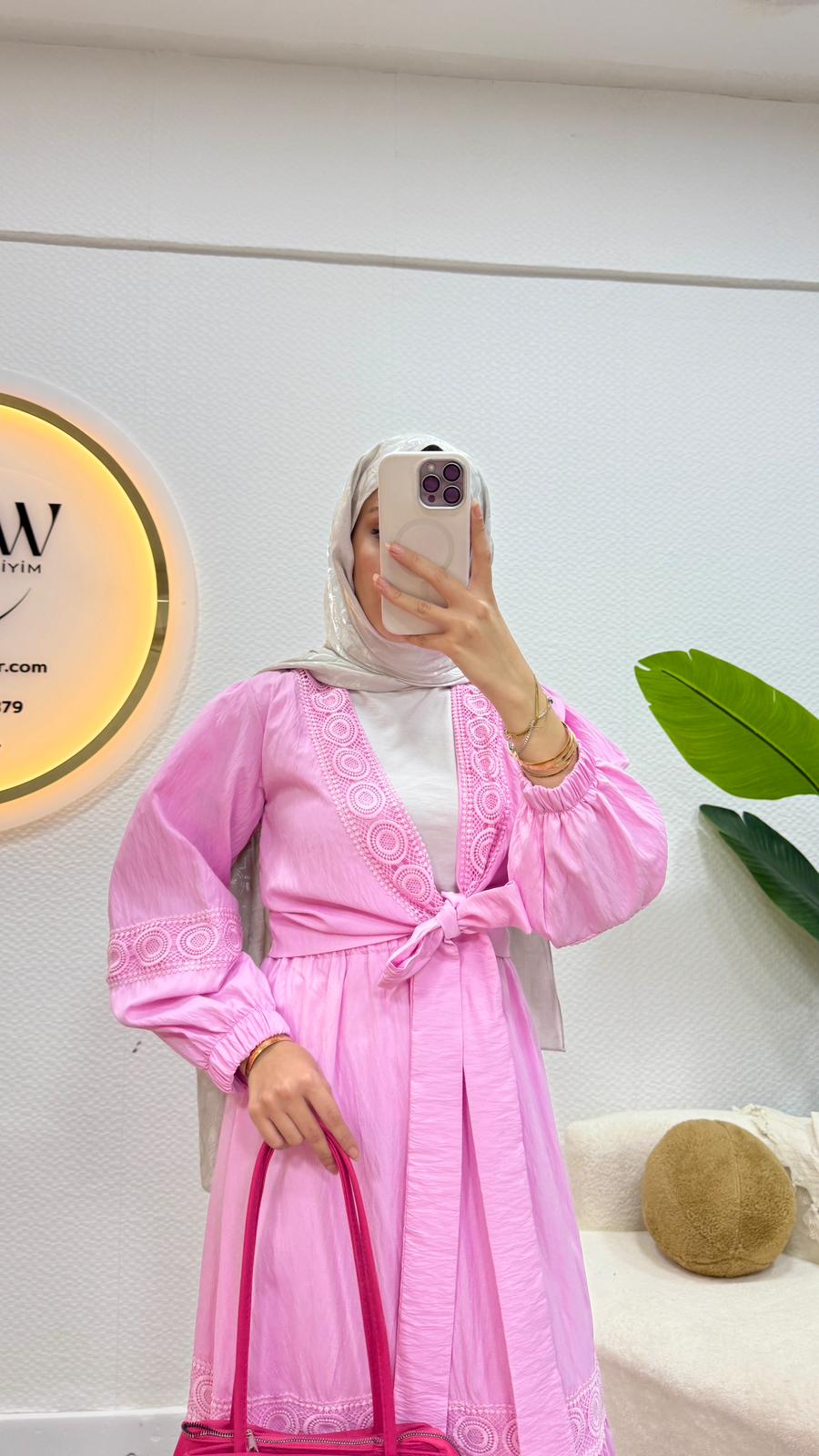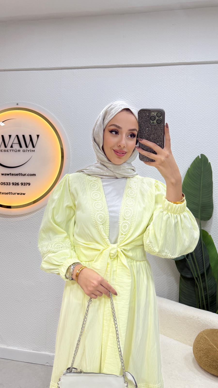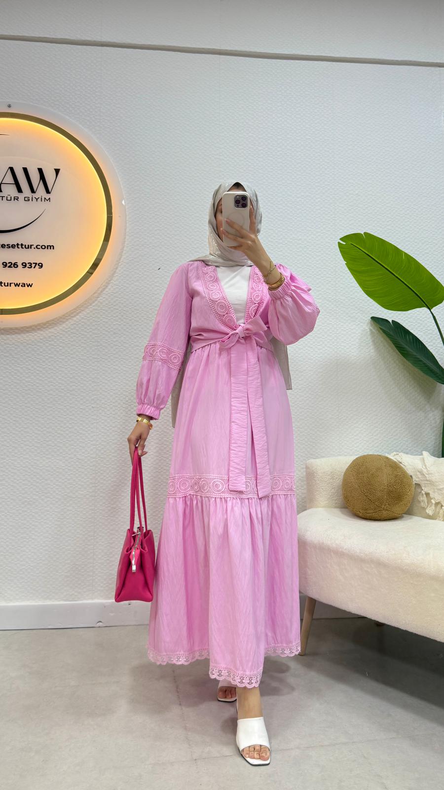 Eteğinde, kolunda, ve yakasında çiçek desenleri vardır.