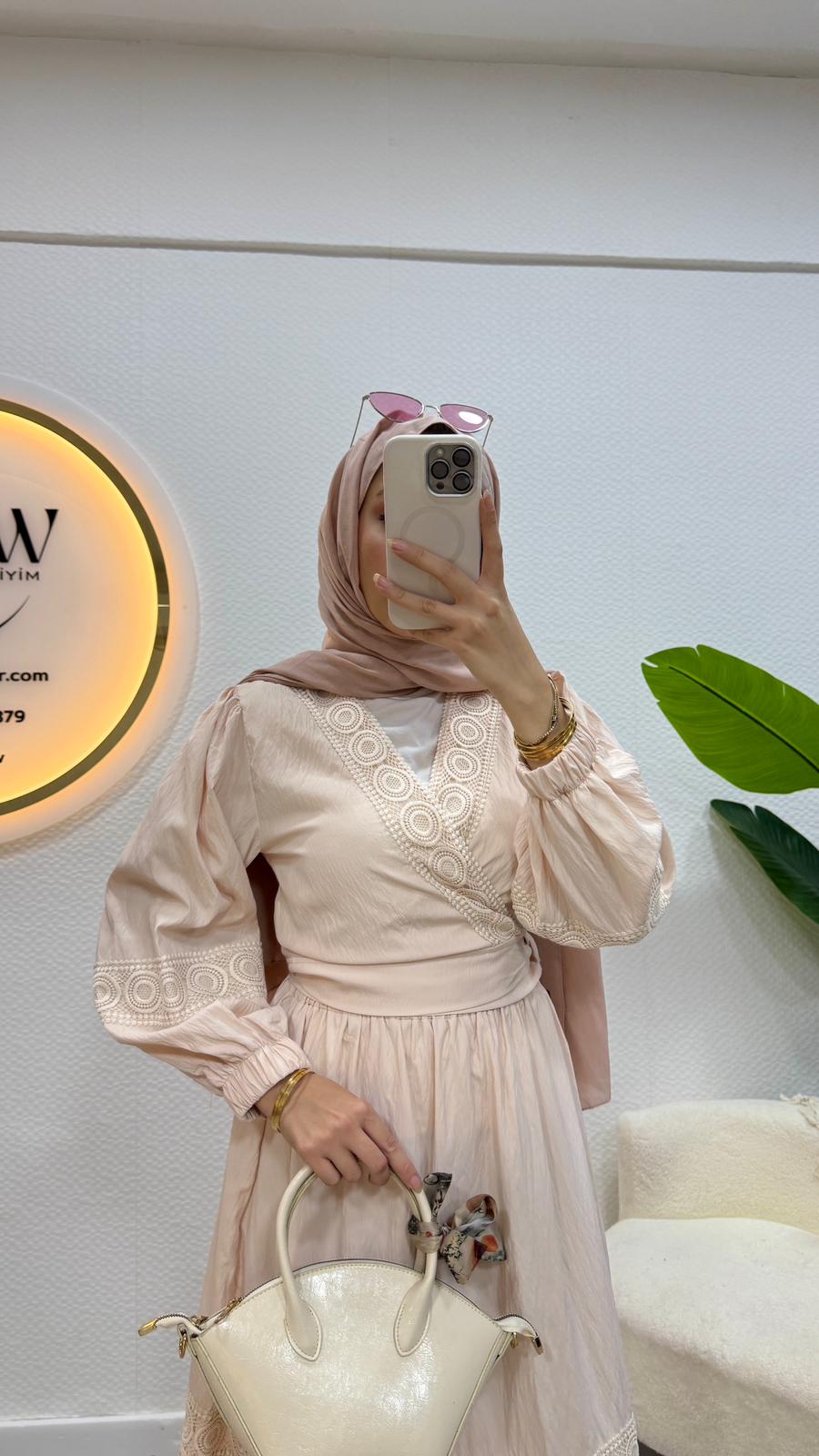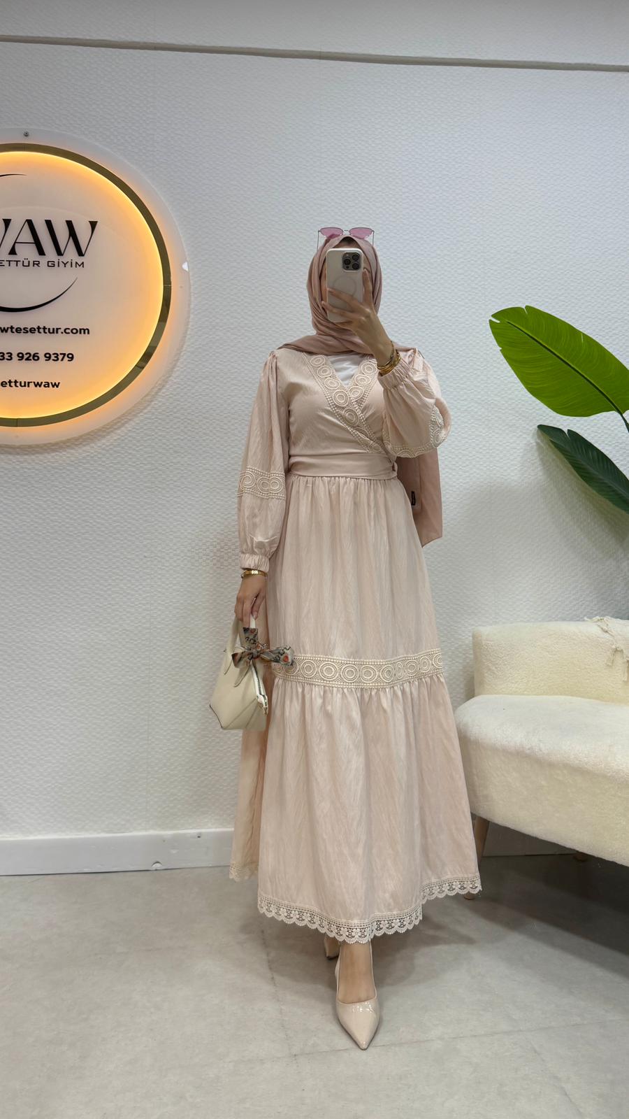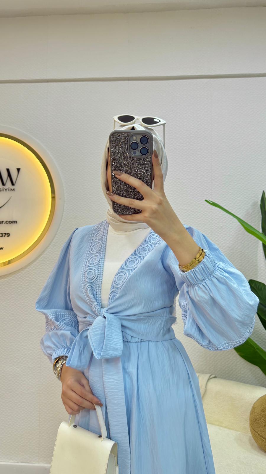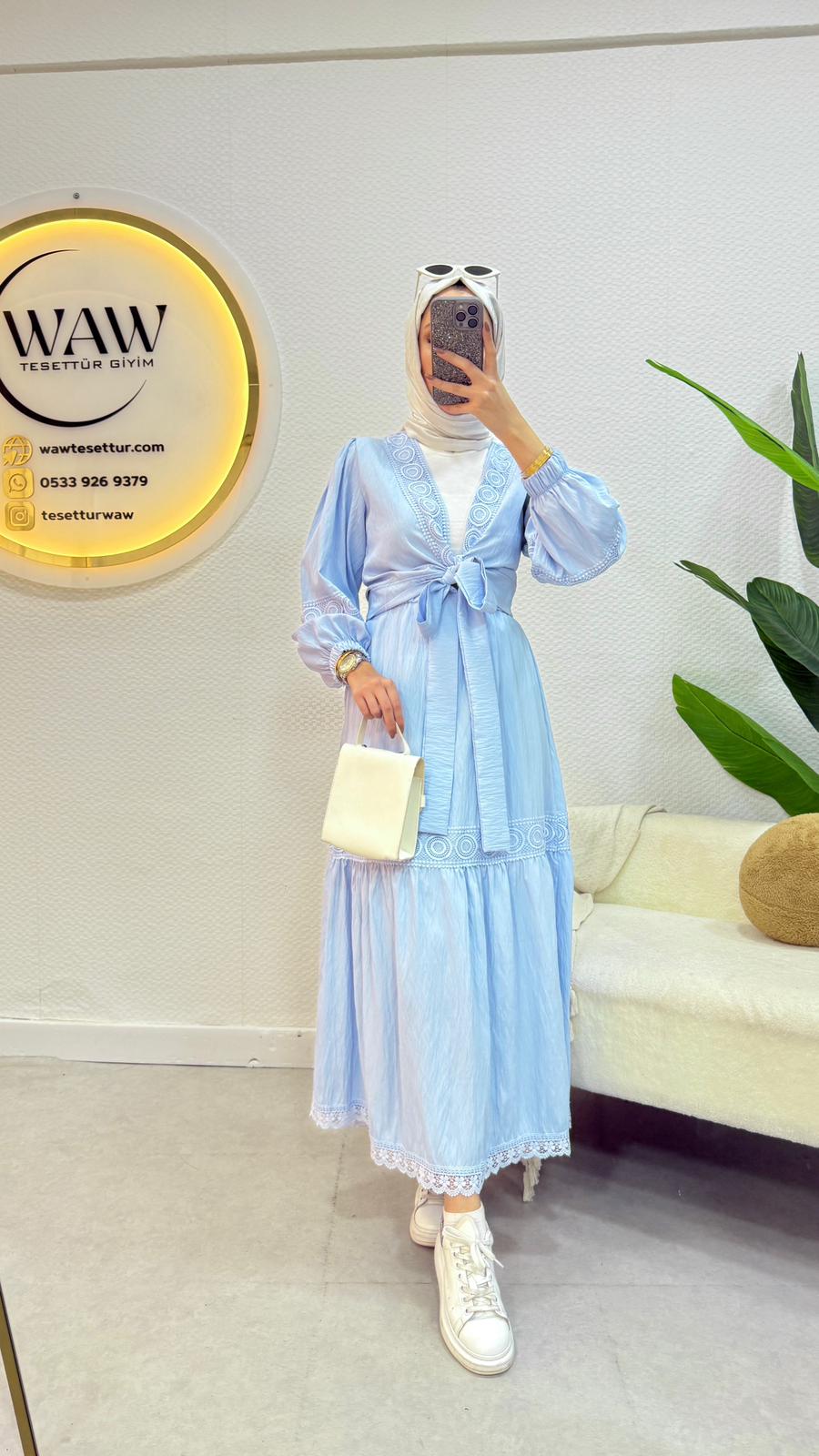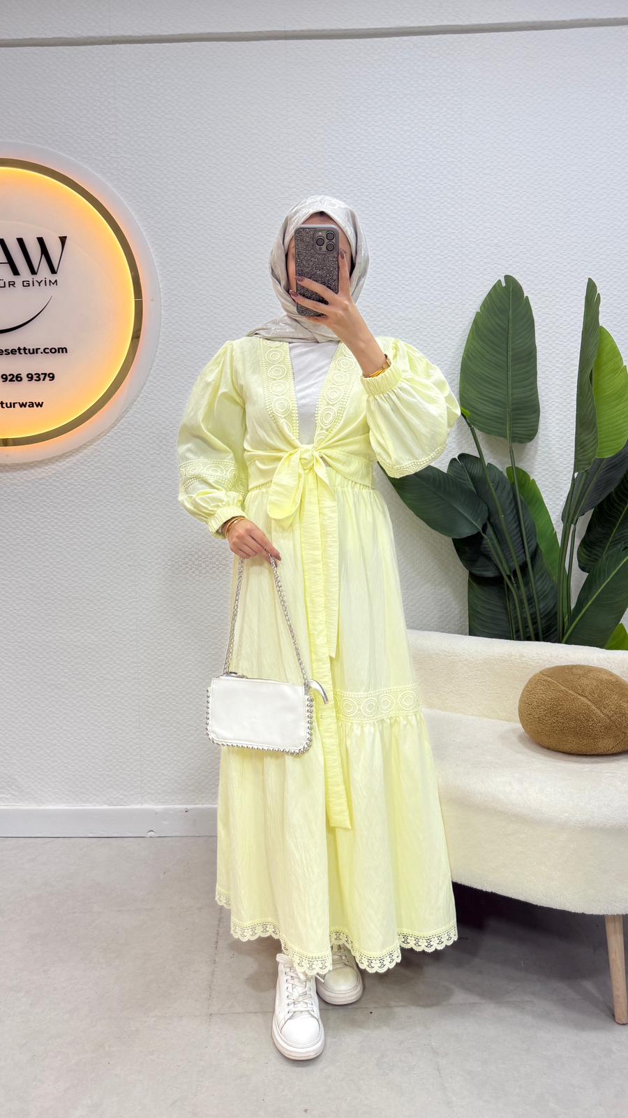 Eteğinde, kolunda, ve yakasında çiçek desenleri vardır.