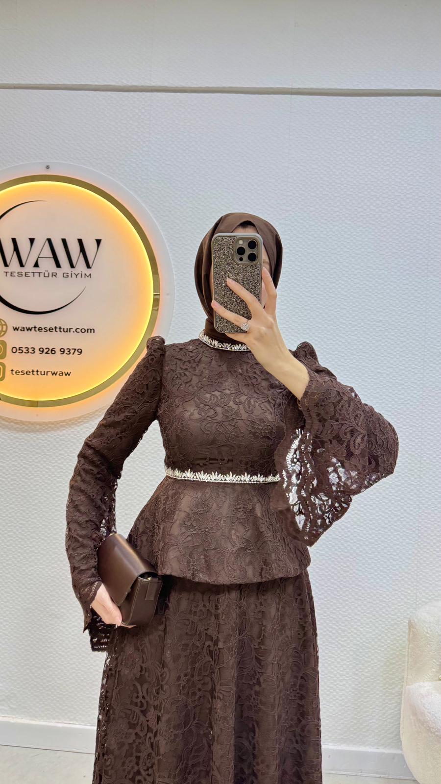 Etek ve bluz şeklinde ikili takımdır.