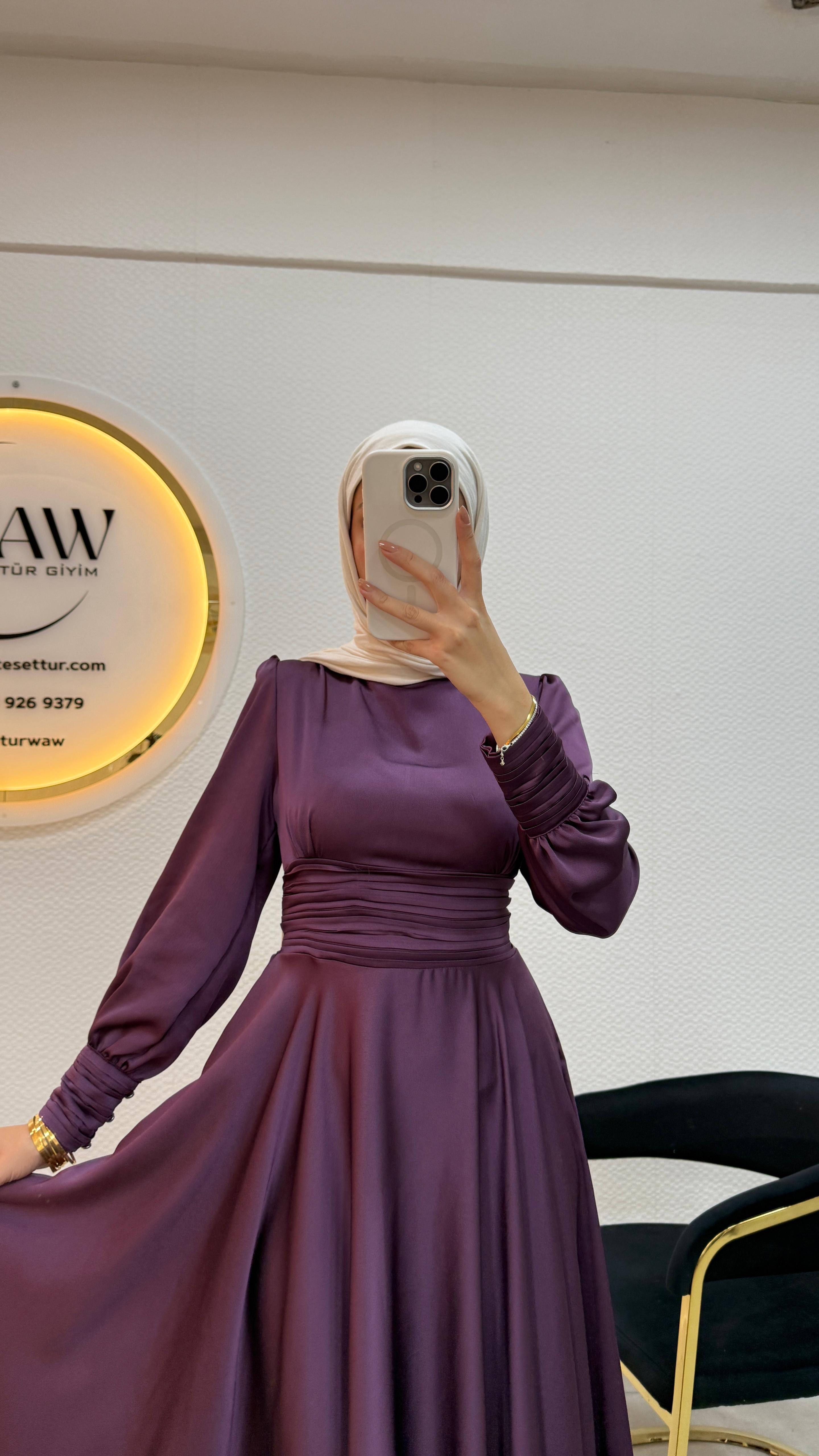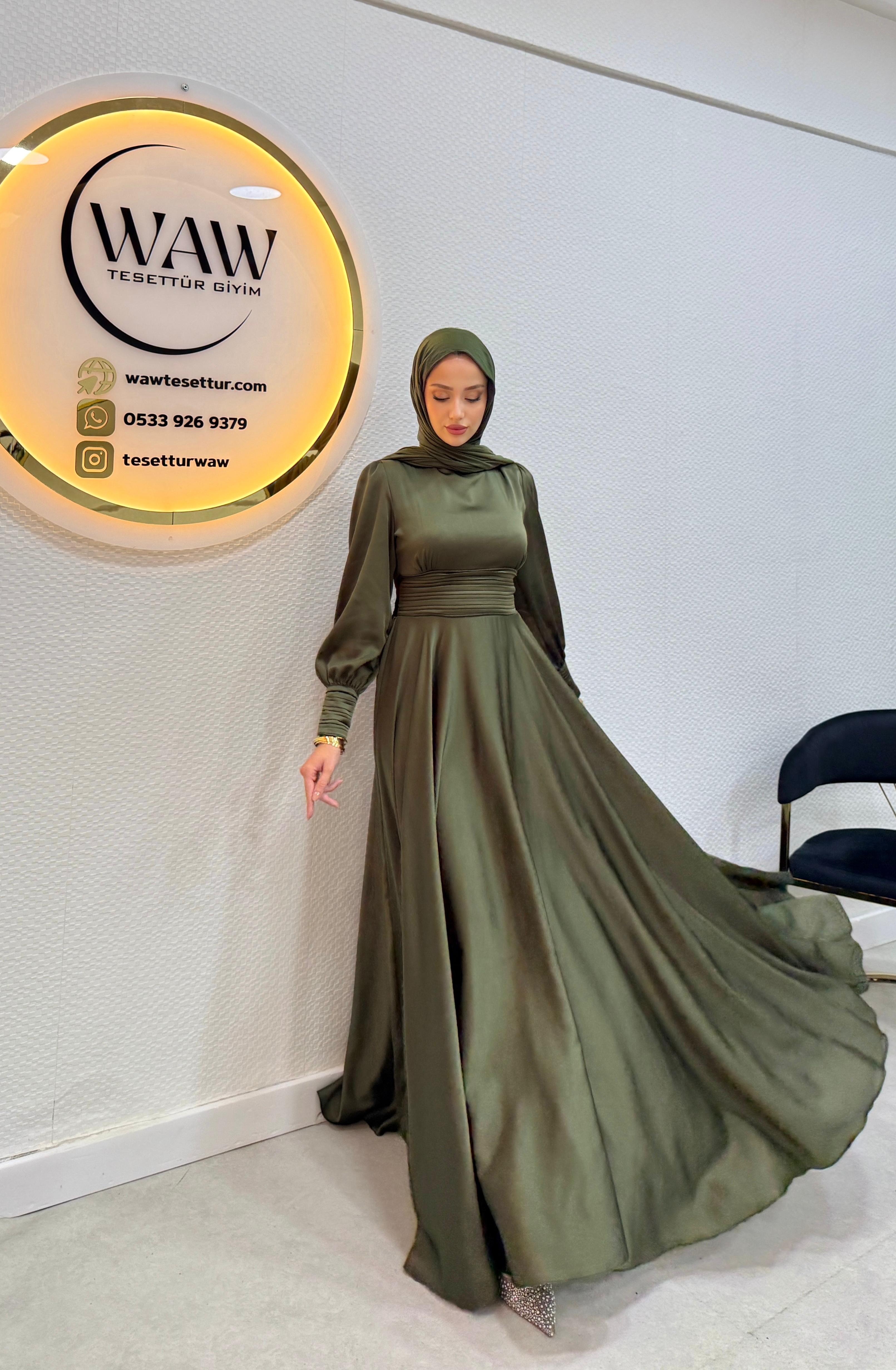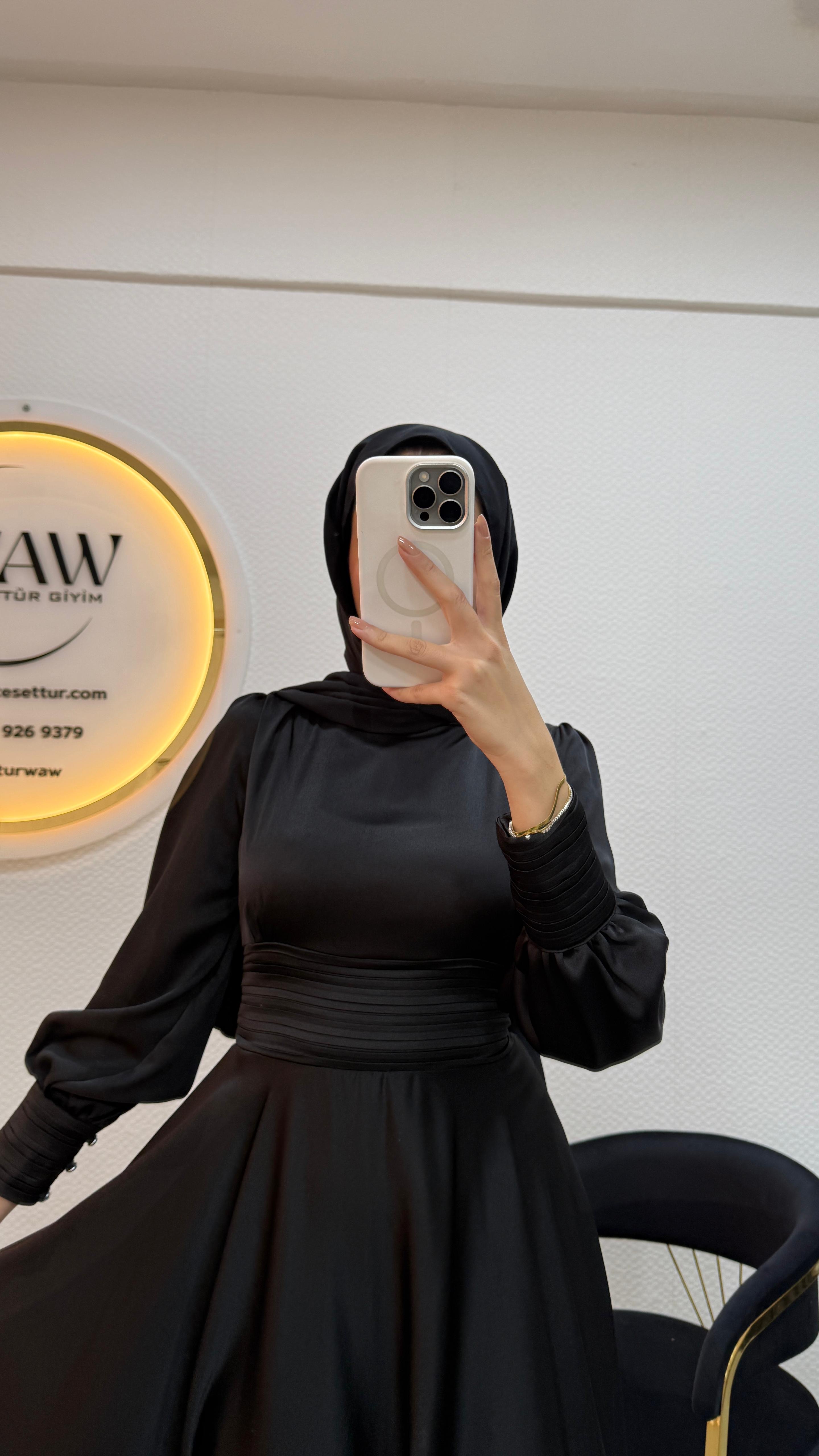 Ürünümüz 1.kalite saten kumaştan üretilmiştir. 36/38/40/42/44/46 bedenler mevcuttur. Ürün boyu 140cm’dir. Arka orta gizli fermuarlıdır. Manşet düğmelidir. Mevlana kesimdir. Hakim yakadır. Manken 170/60kg 38 beden tercih etmektedir.