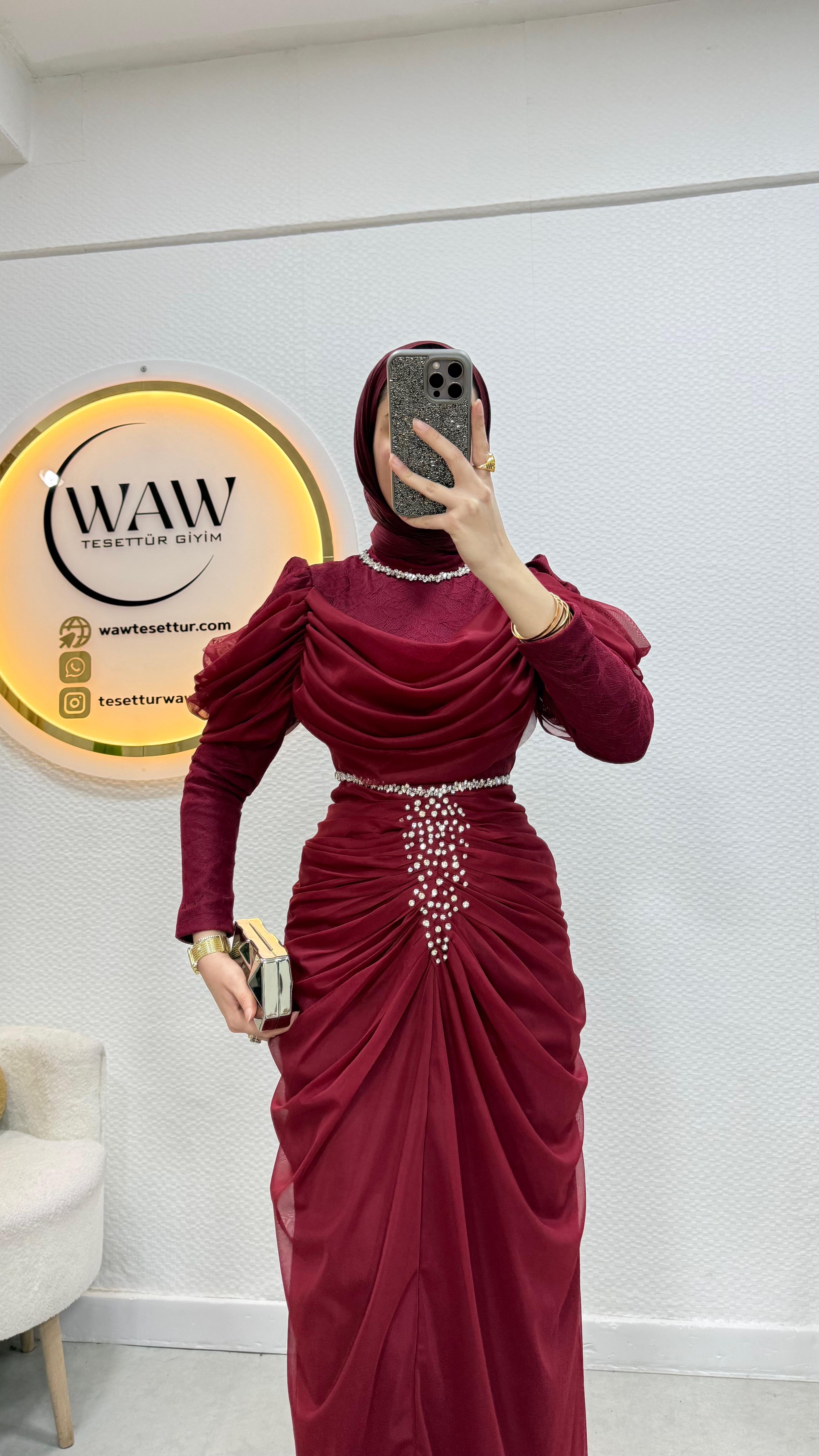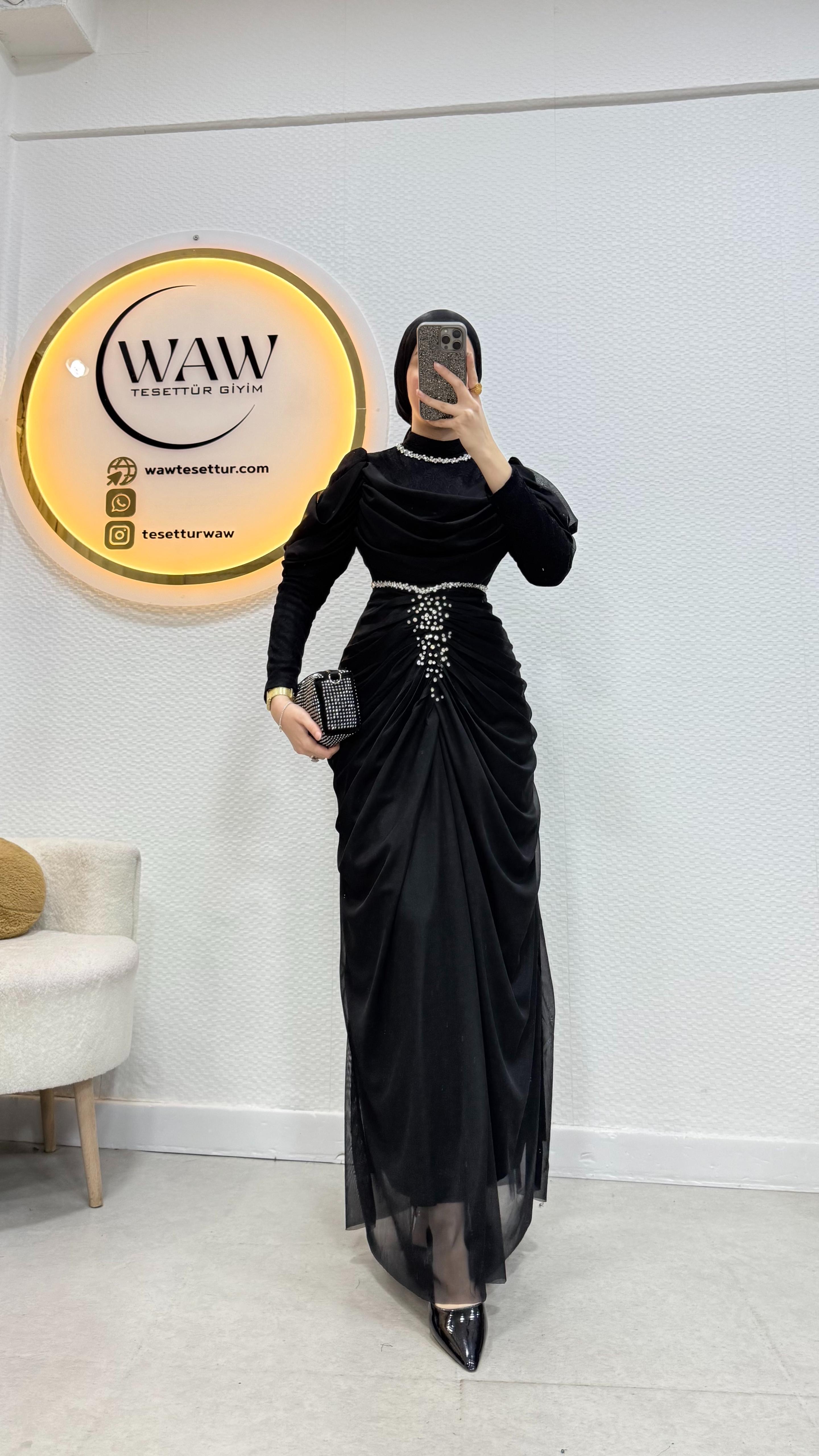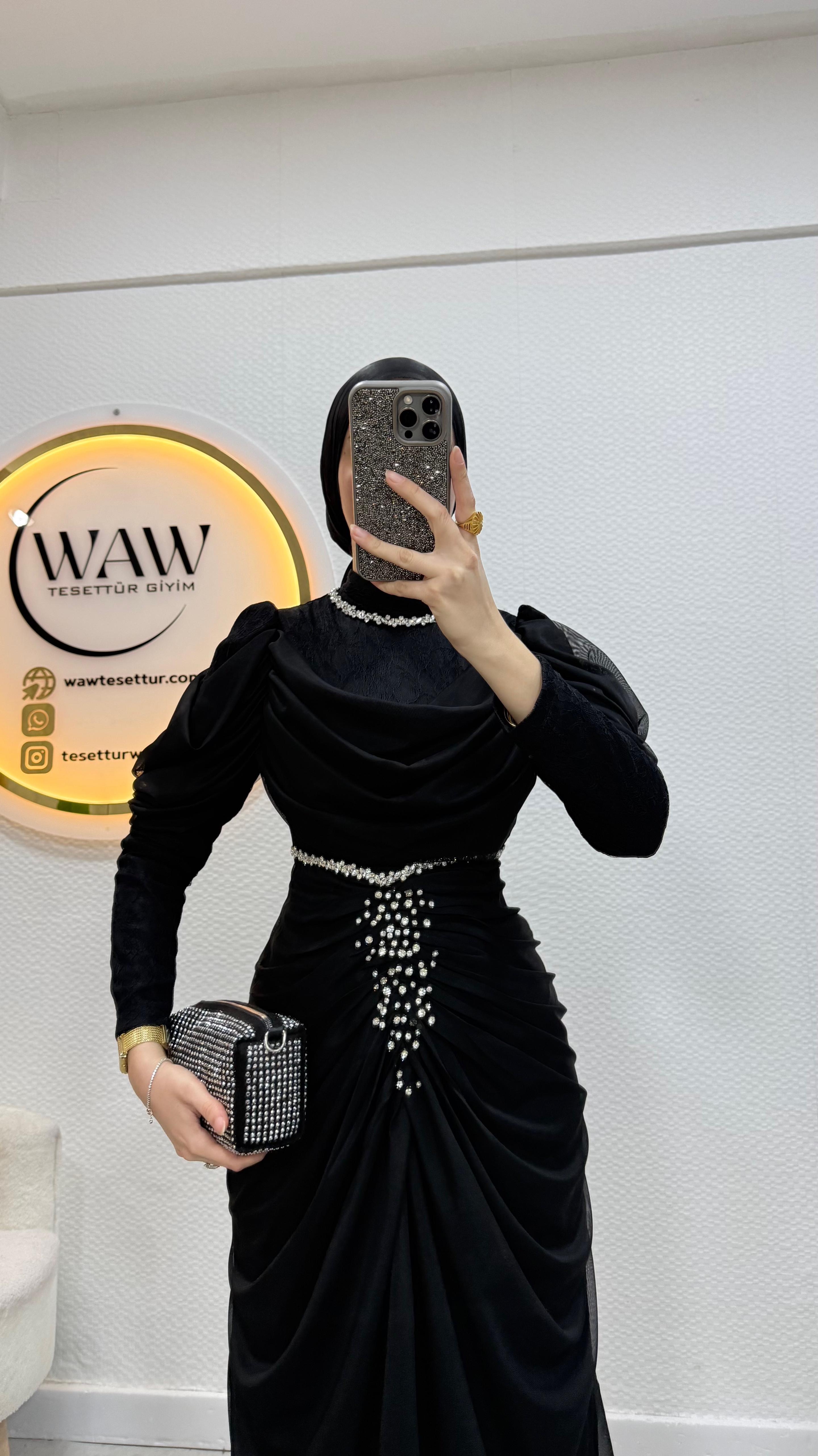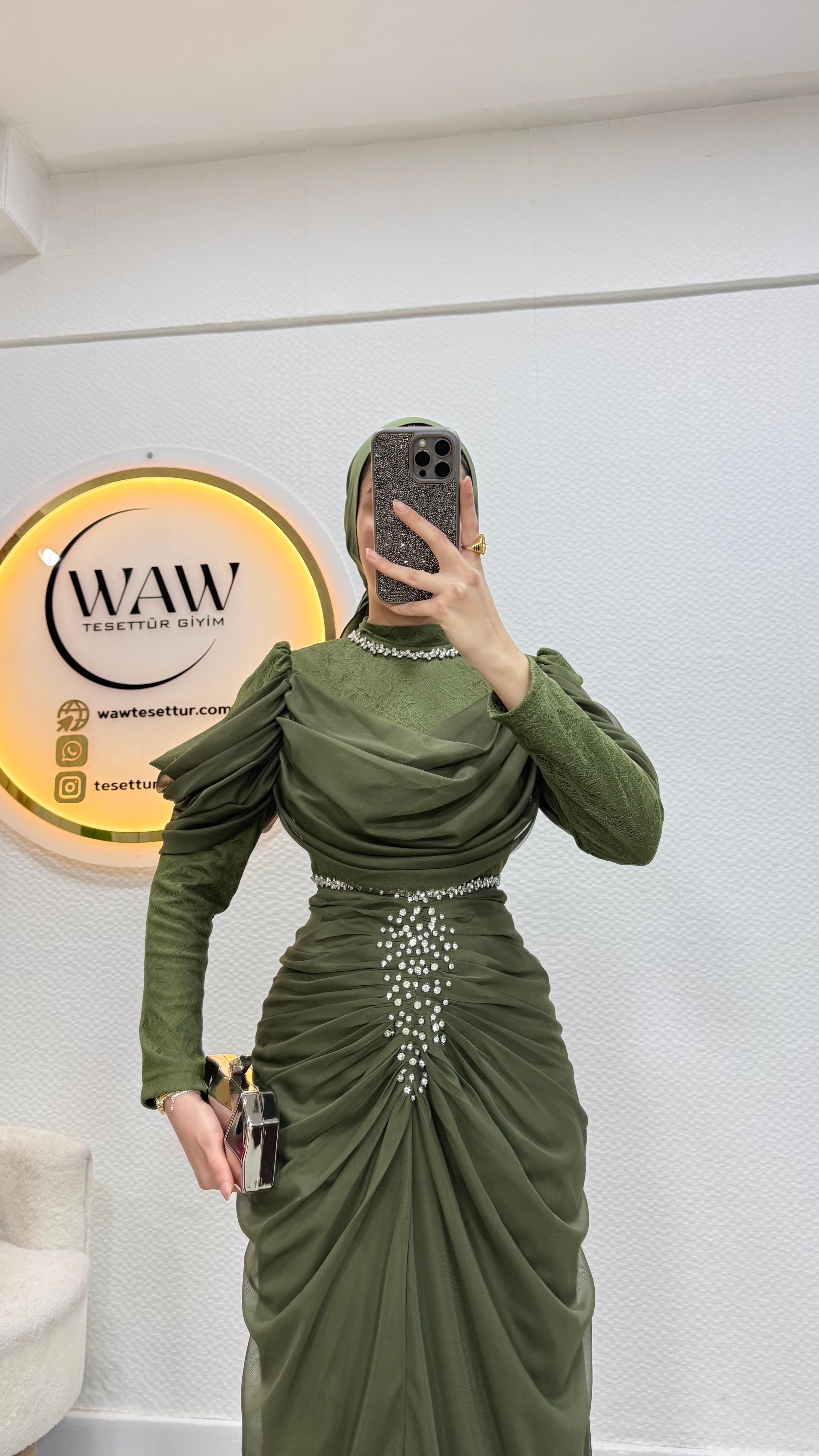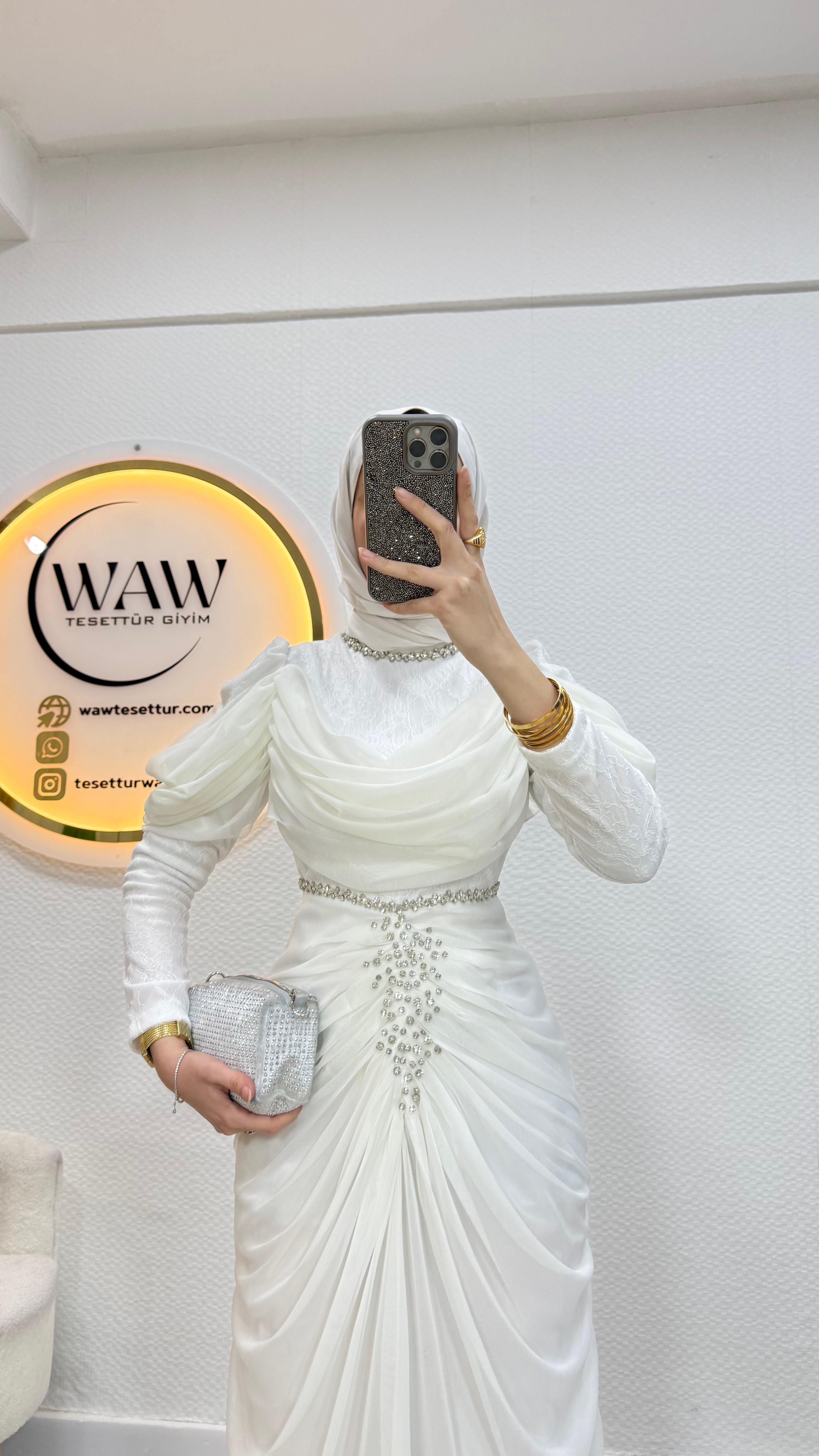 Dantel ve şifon kumaştan üretilmiştir.Astarlıdır.Bel ve boyun kısımlarında taş işlemeleri mevcuttur.Hakim yakadır.Tam kalıptır.Boy:145cmBedenler 36/38/40/42/44/46