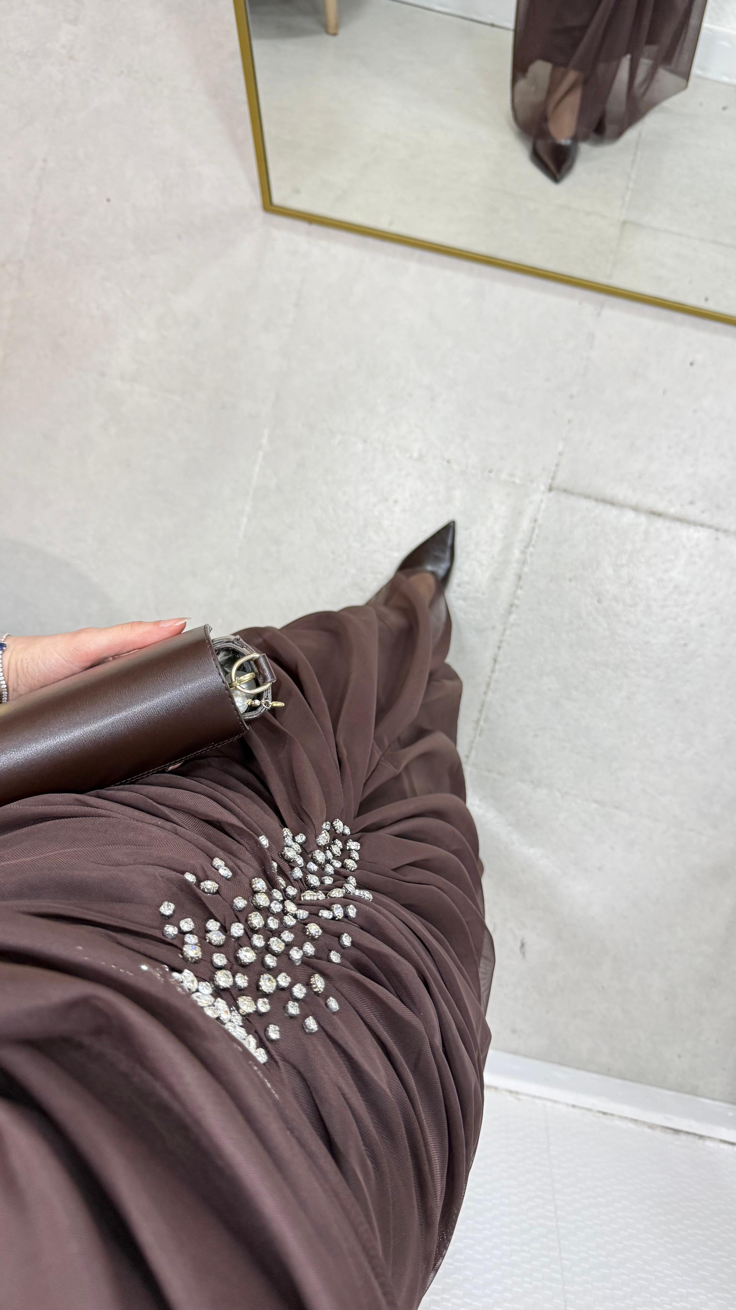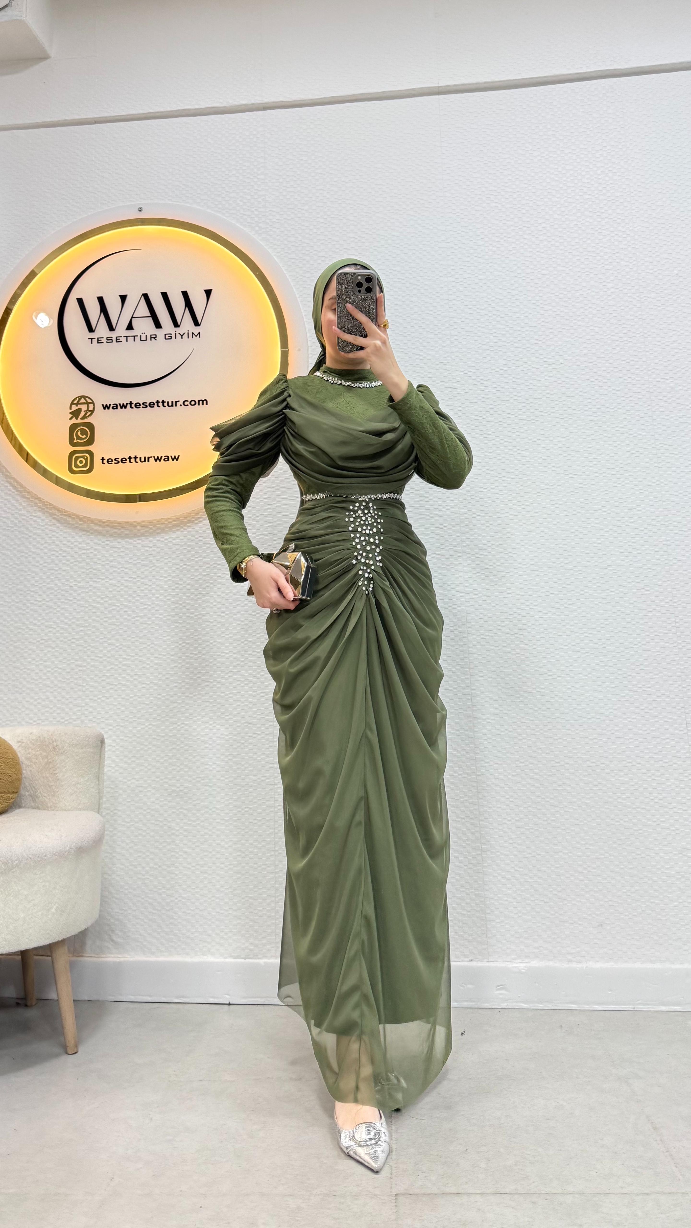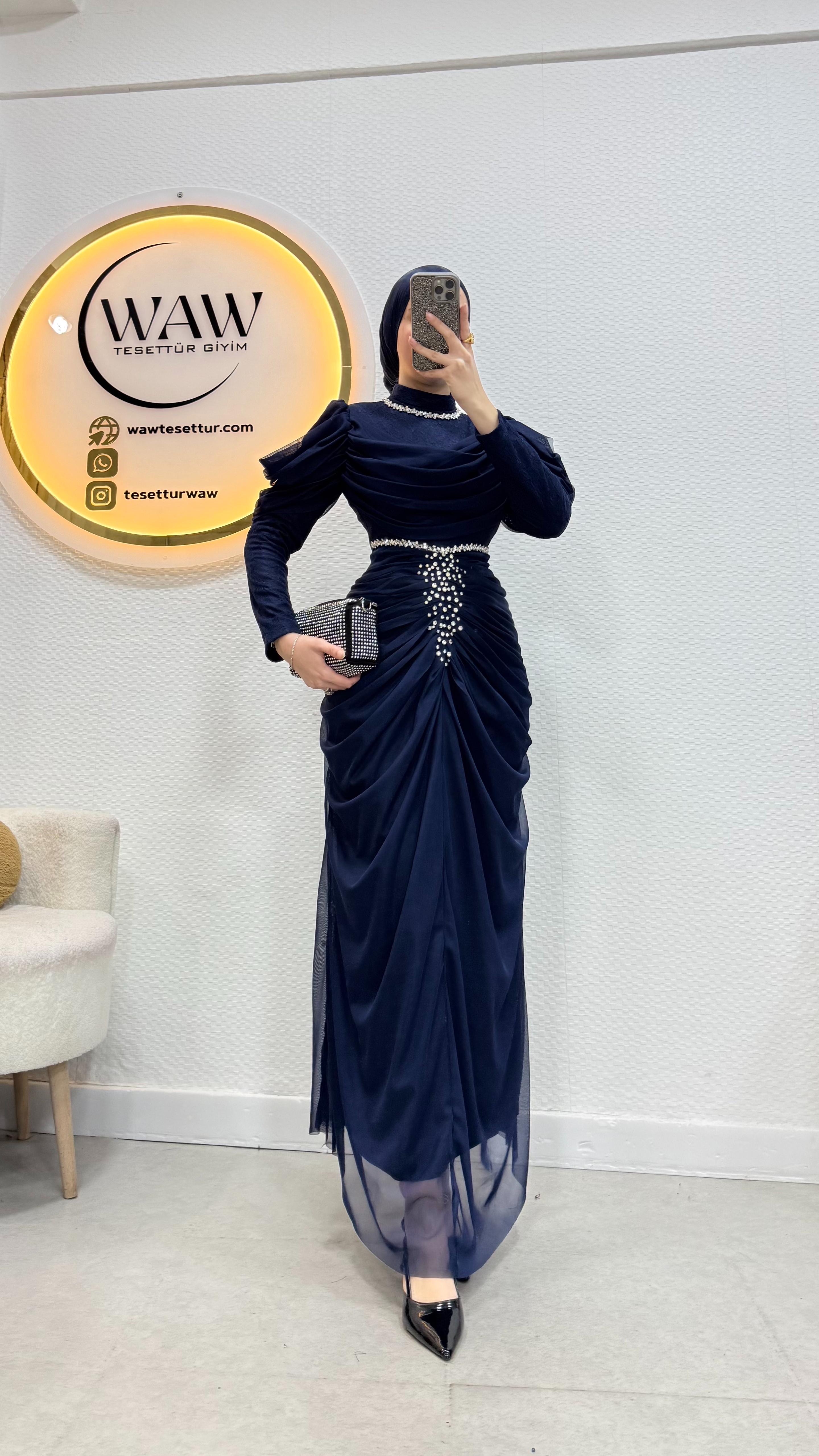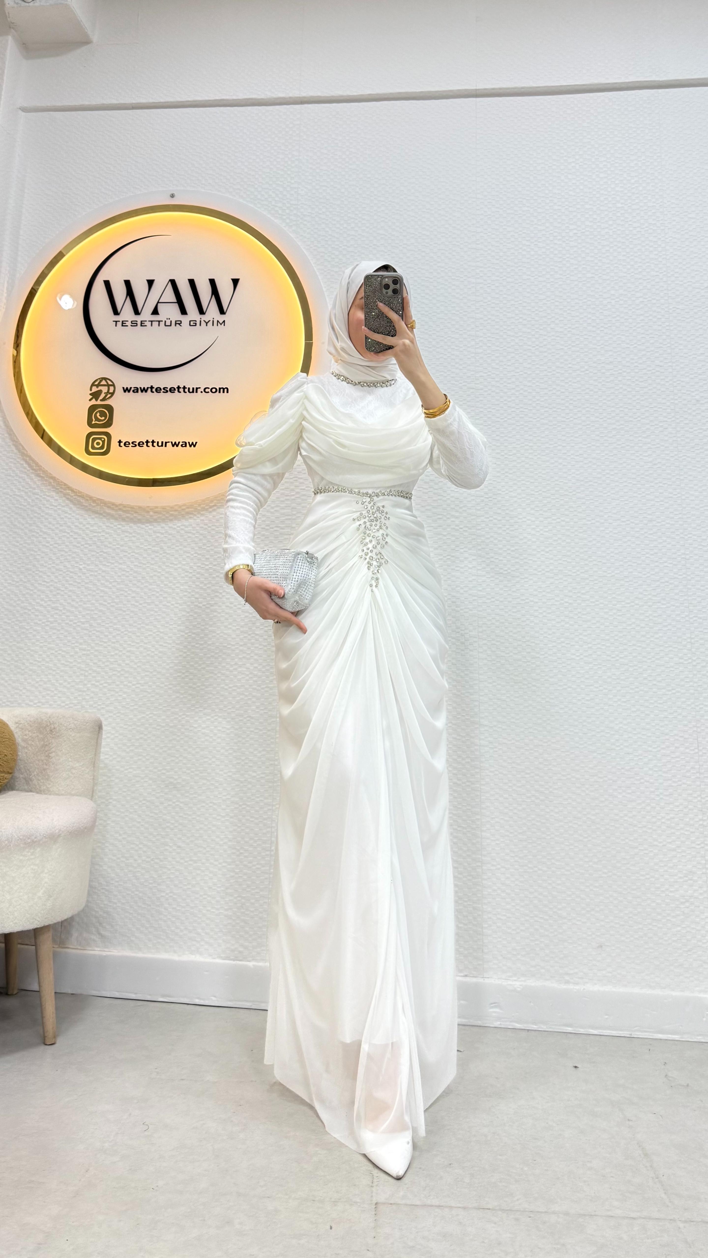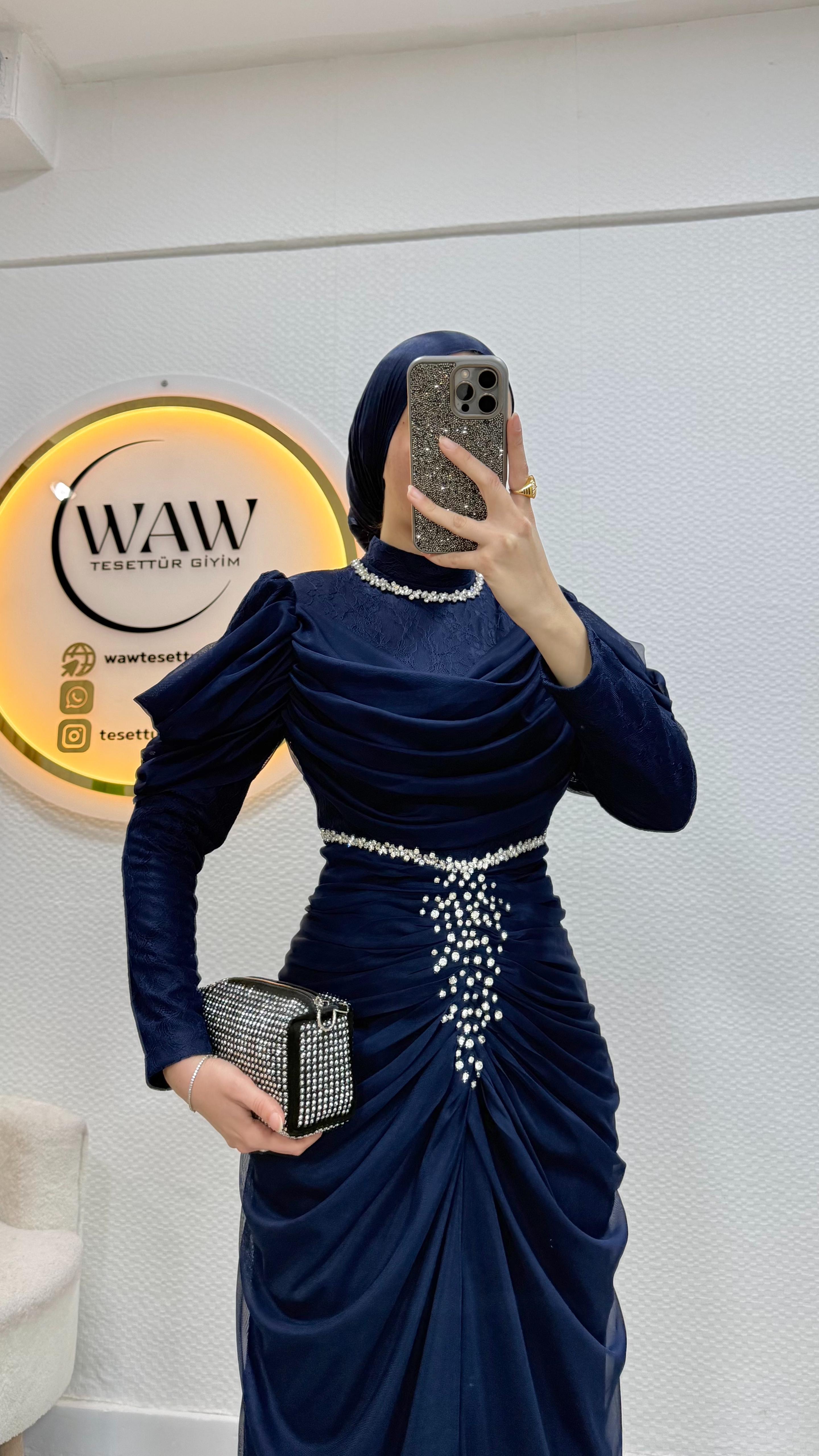 Dantel ve şifon kumaştan üretilmiştir.Astarlıdır.Bel ve boyun kısımlarında taş işlemeleri mevcuttur.Hakim yakadır.Tam kalıptır.Boy:145cmBedenler 36/38/40/42/44/46