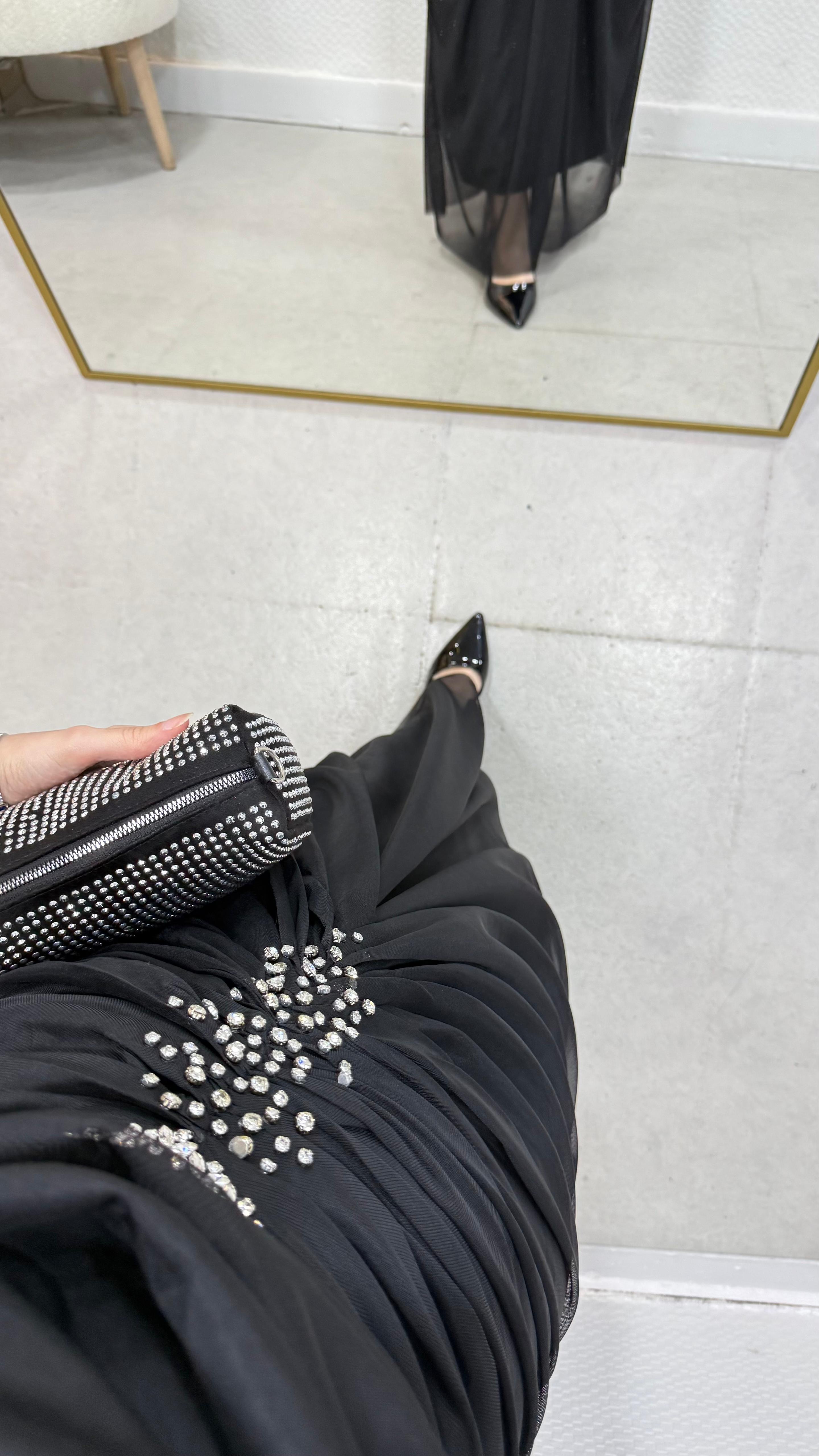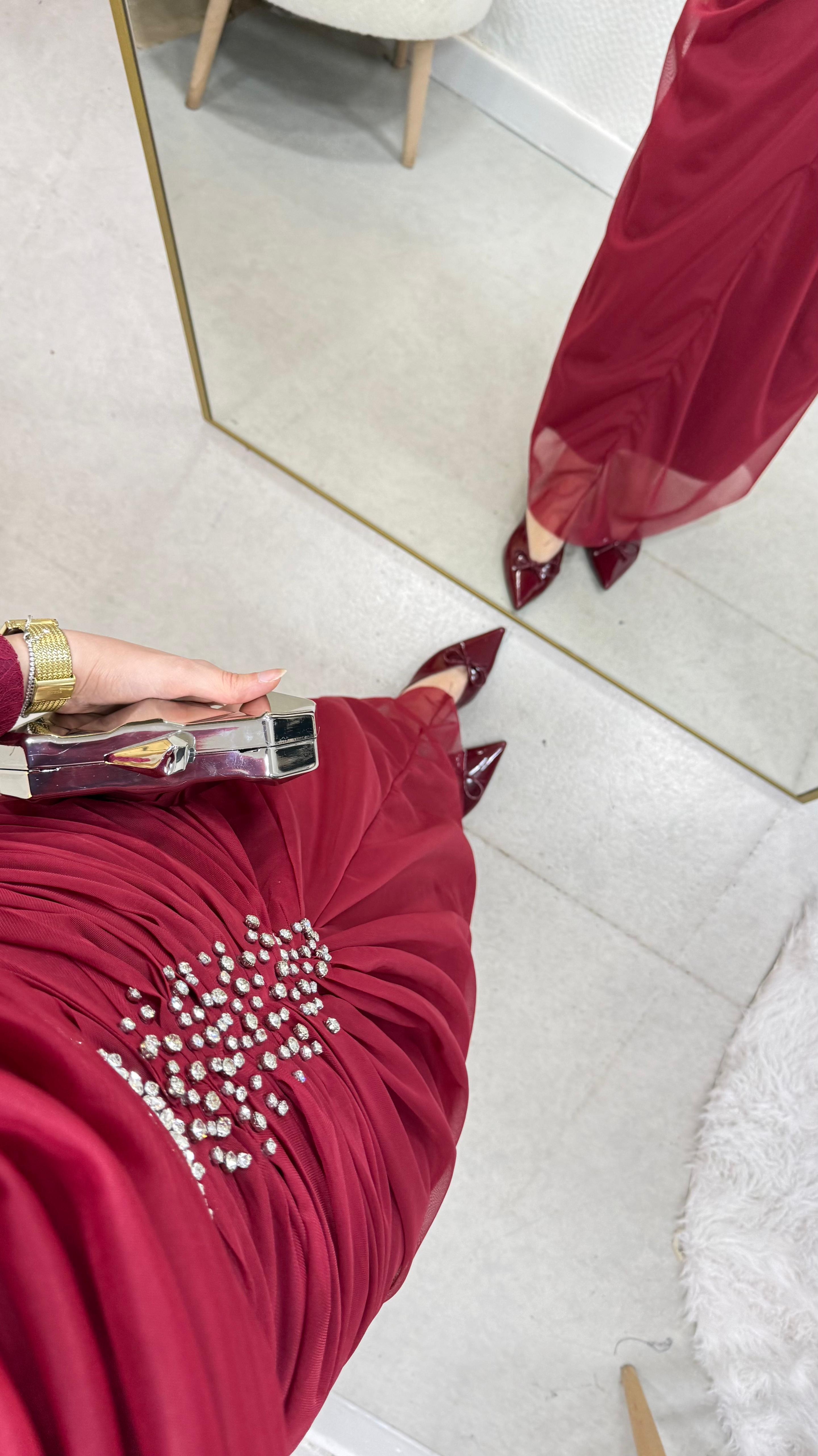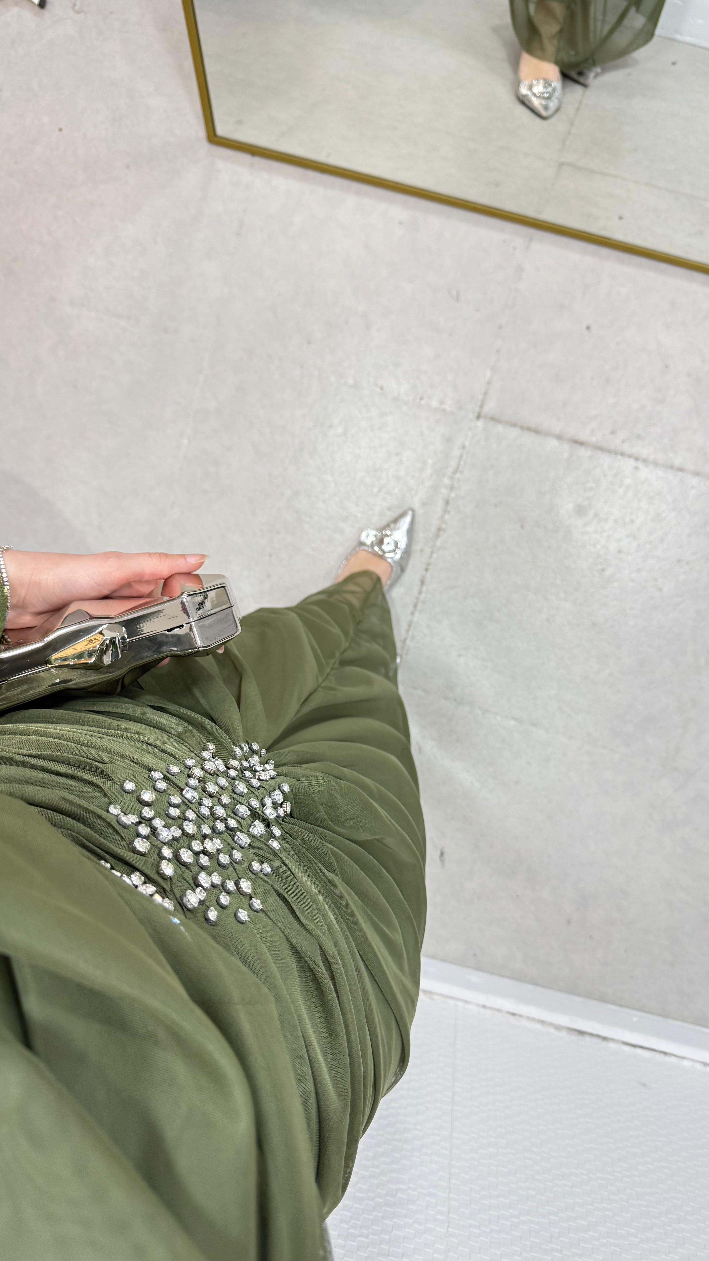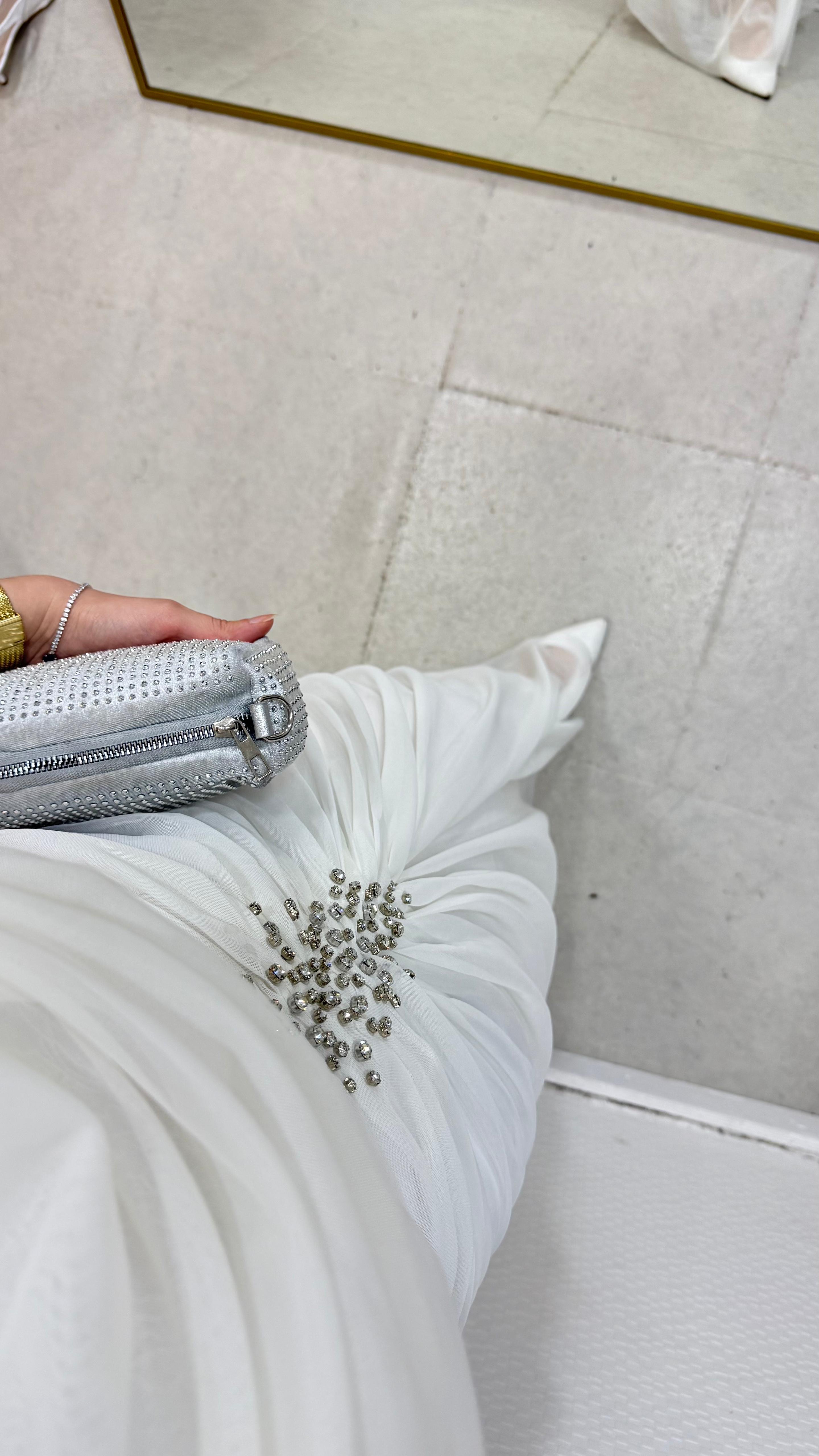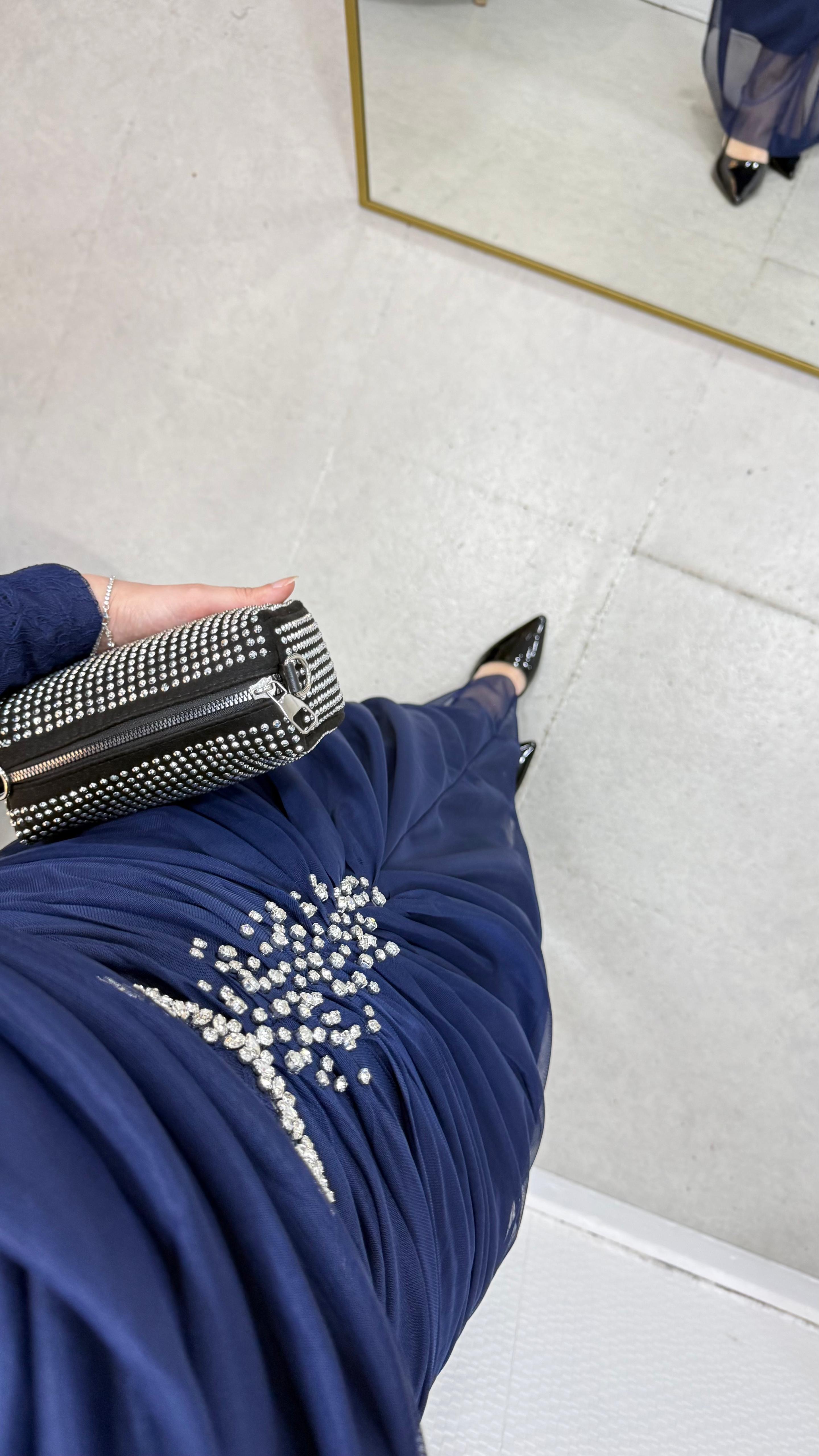 Dantel ve şifon kumaştan üretilmiştir.Astarlıdır.Bel ve boyun kısımlarında taş işlemeleri mevcuttur.Hakim yakadır.Tam kalıptır.Boy:145cmBedenler 36/38/40/42/44/46