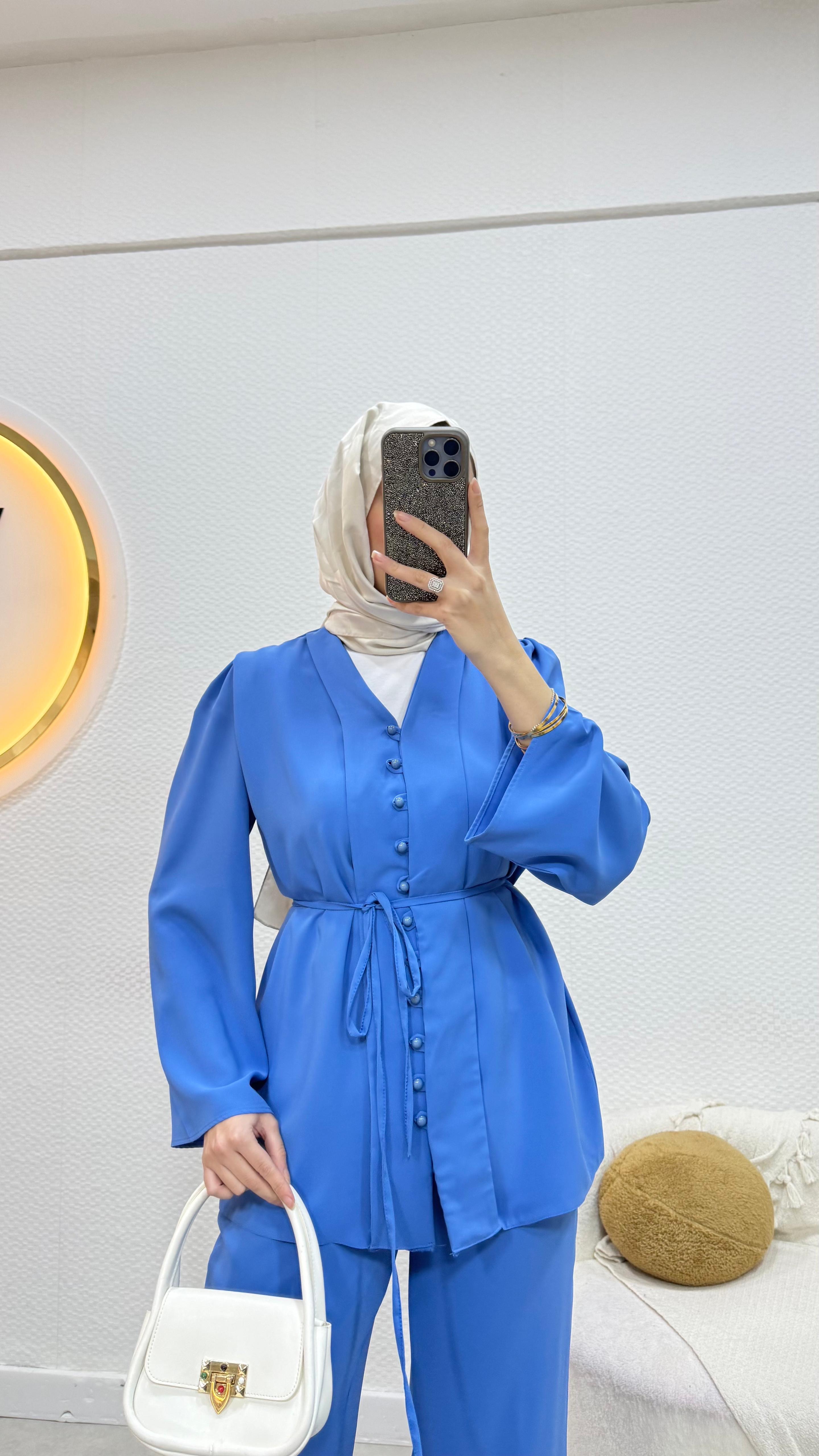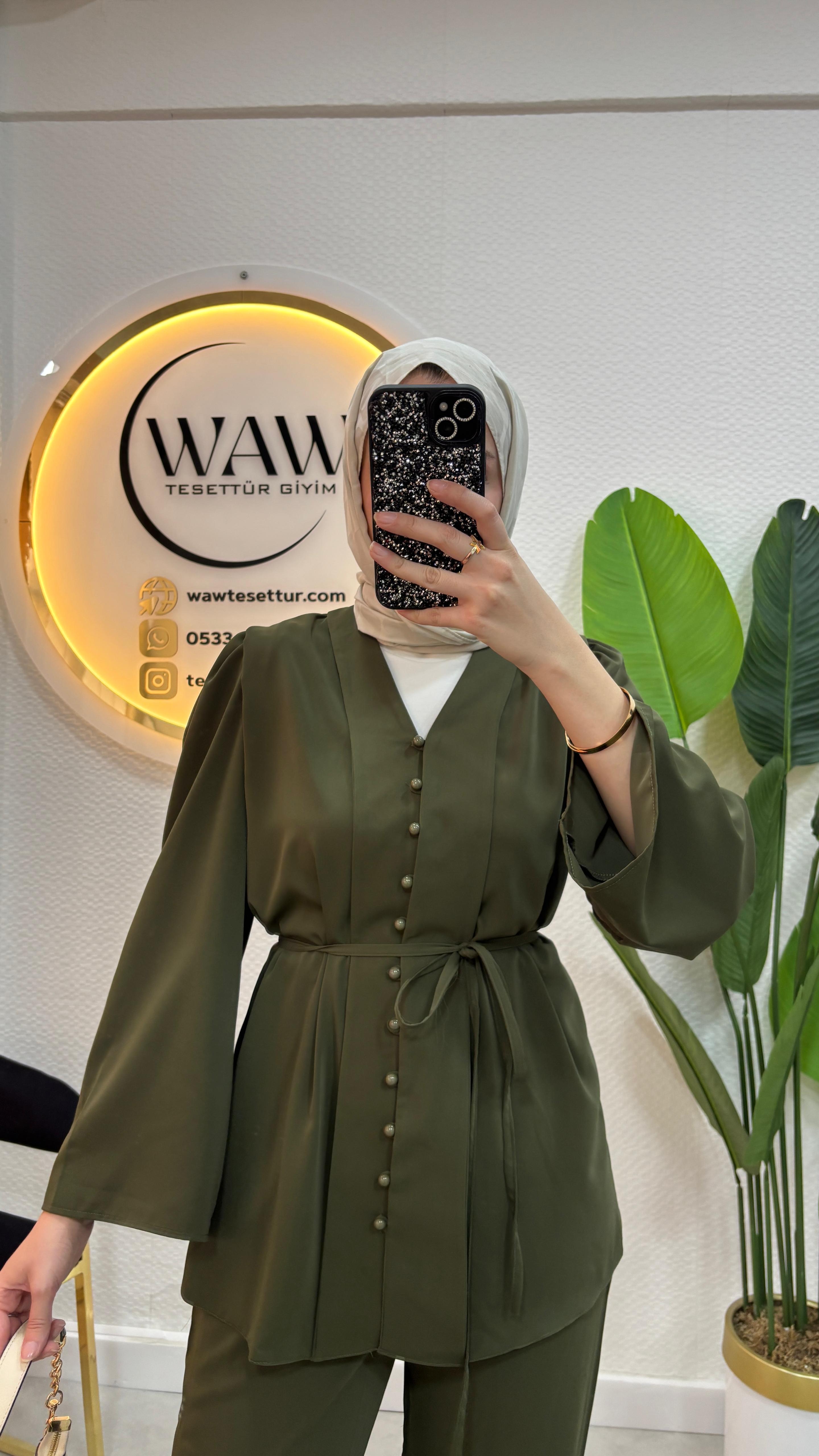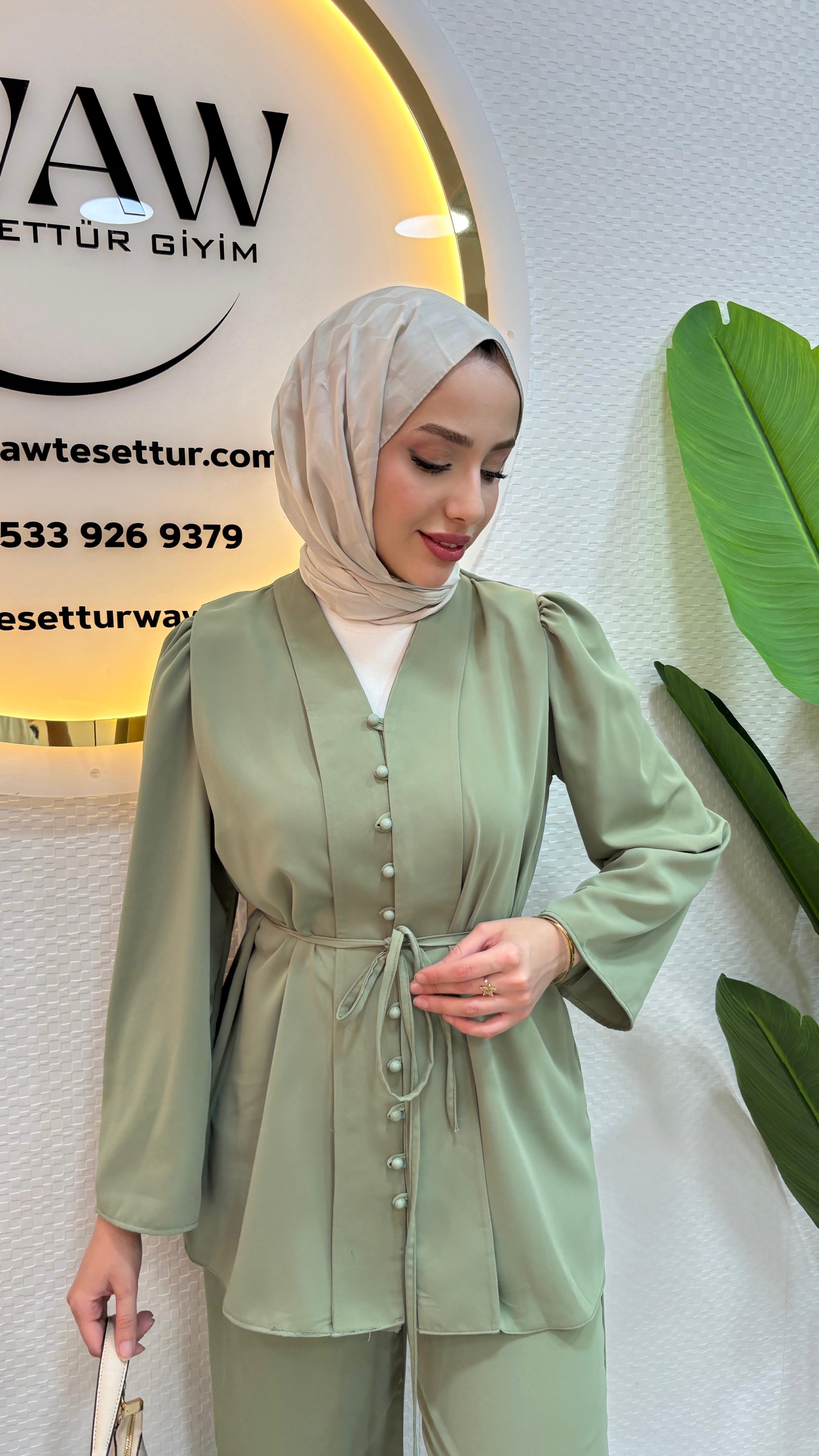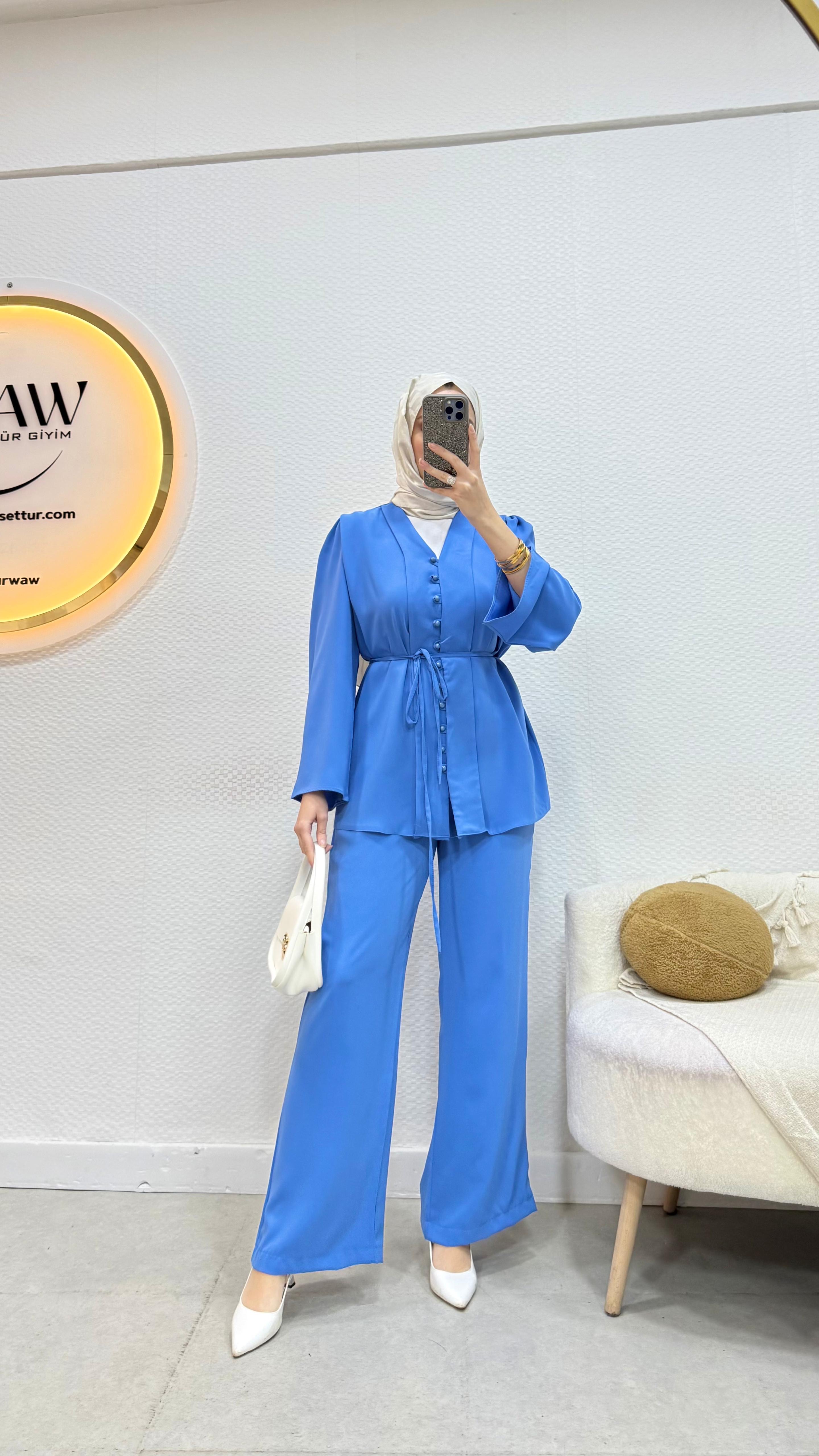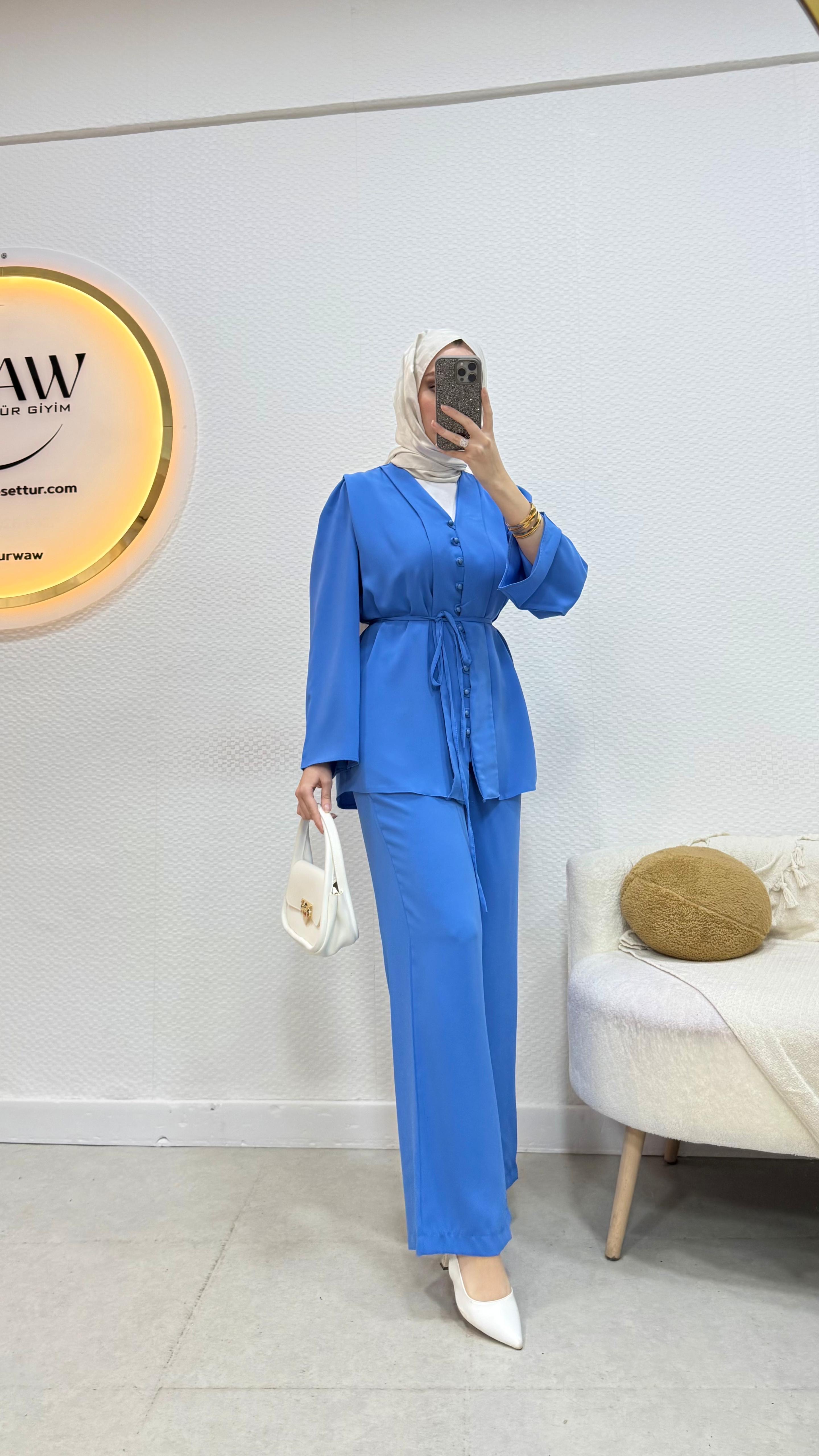 Ürünümüz dubai krep kumaştan üretilmiştir.Pantolon/tunik şeklinde ikili takımdır.Seyyar kemerlidir.36/38/40/42/44 bedenler mevcuttur. Pantolon bel lastiklidir.Manken 170/60kg 38 giymektedir.