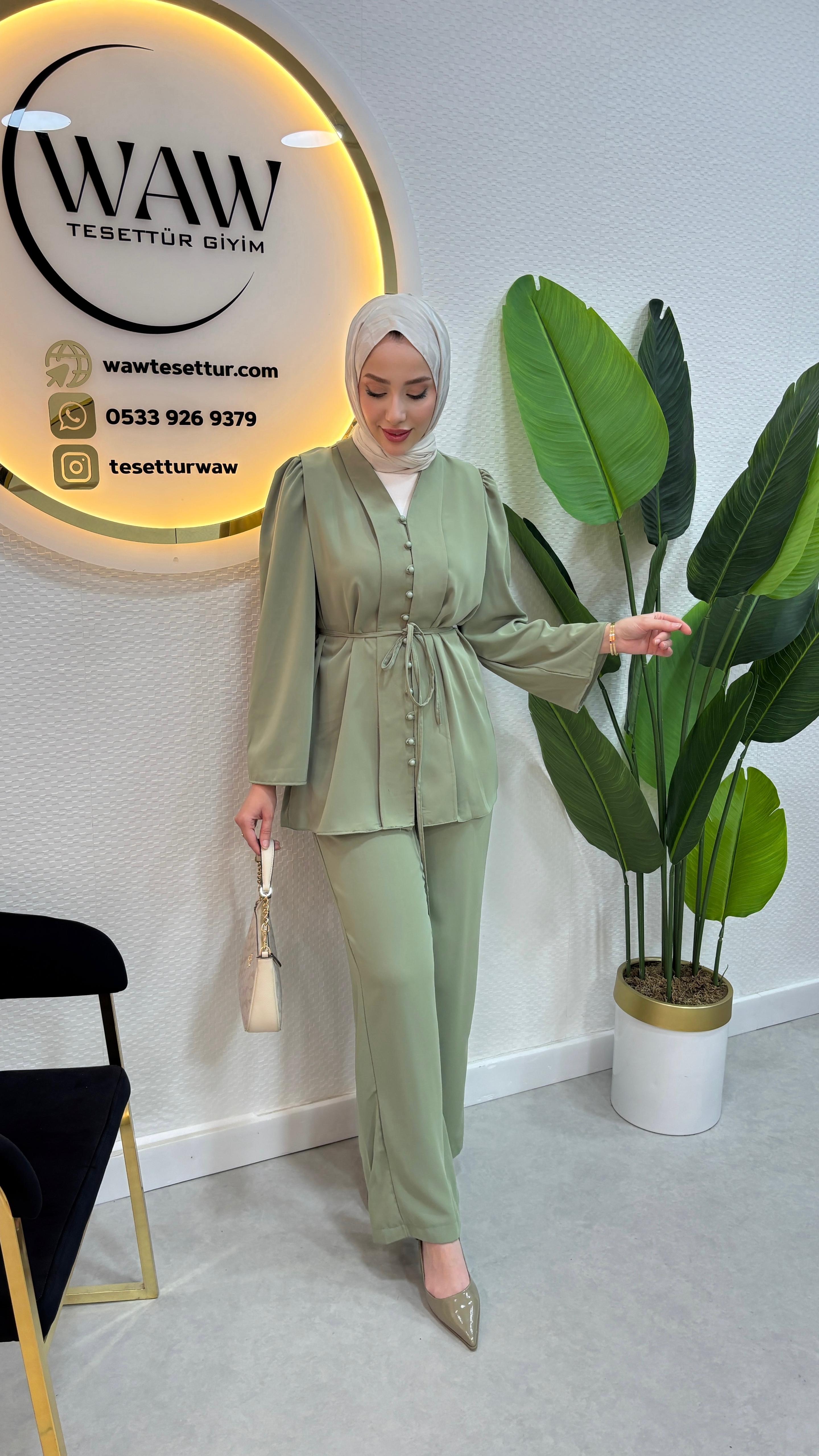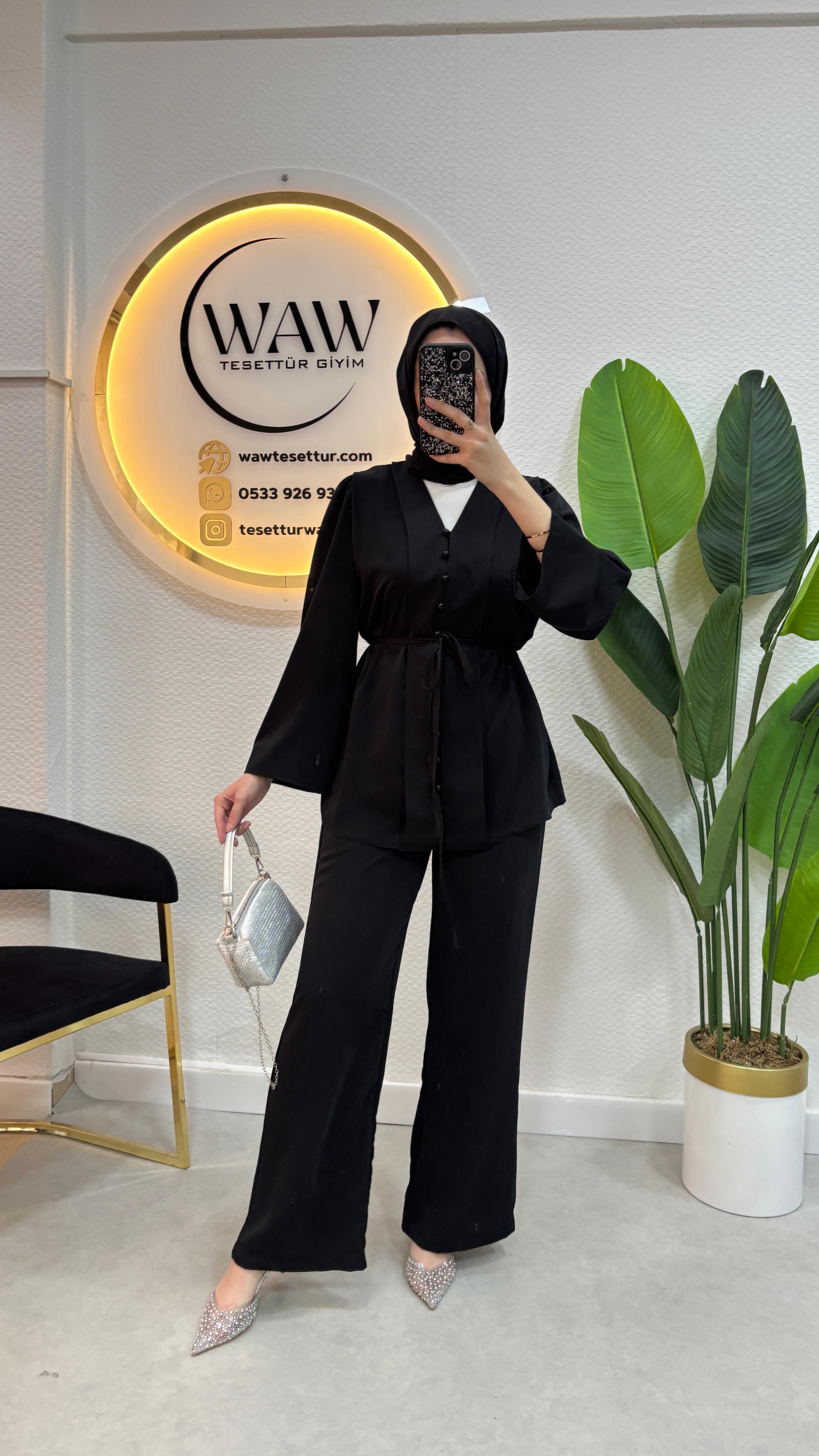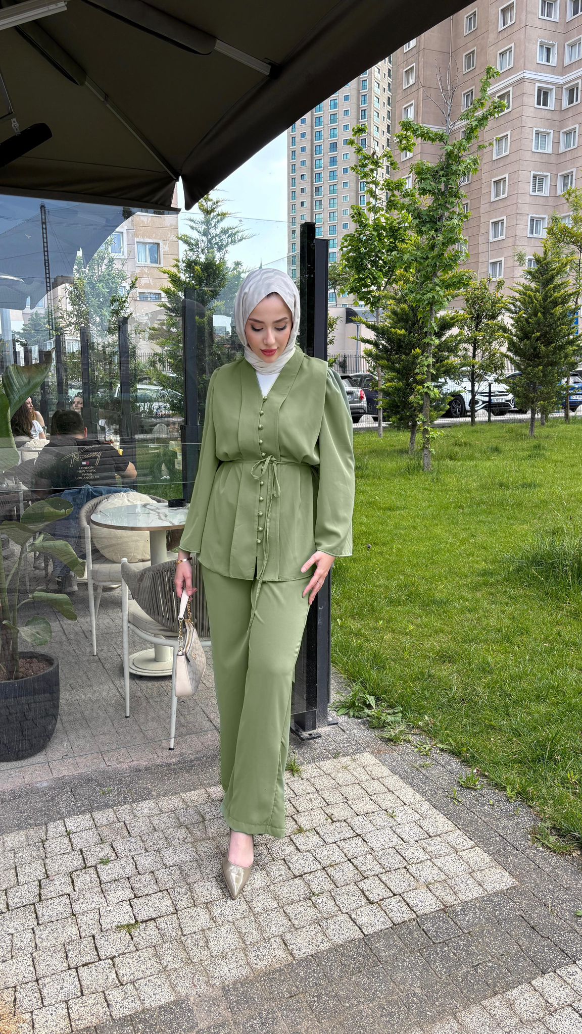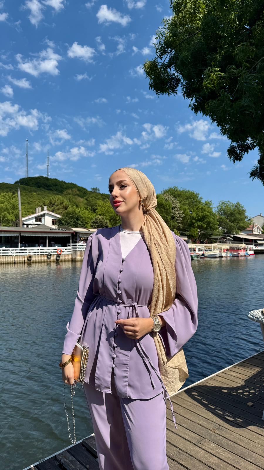 Ürünümüz dubai krep kumaştan üretilmiştir.Pantolon/tunik şeklinde ikili takımdır.Seyyar kemerlidir.36/38/40/42/44 bedenler mevcuttur. Pantolon bel lastiklidir.Manken 170/60kg 38 giymektedir.