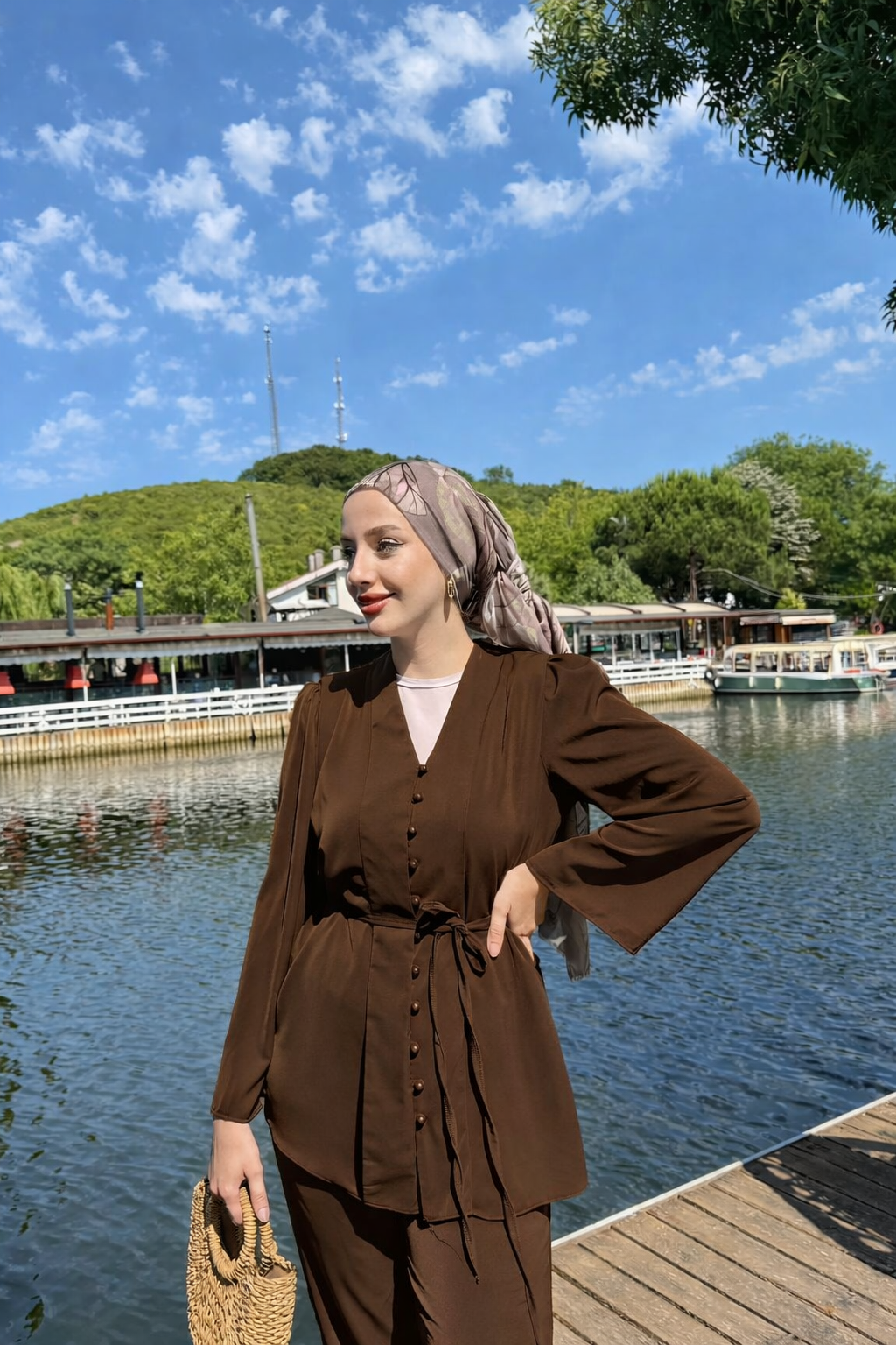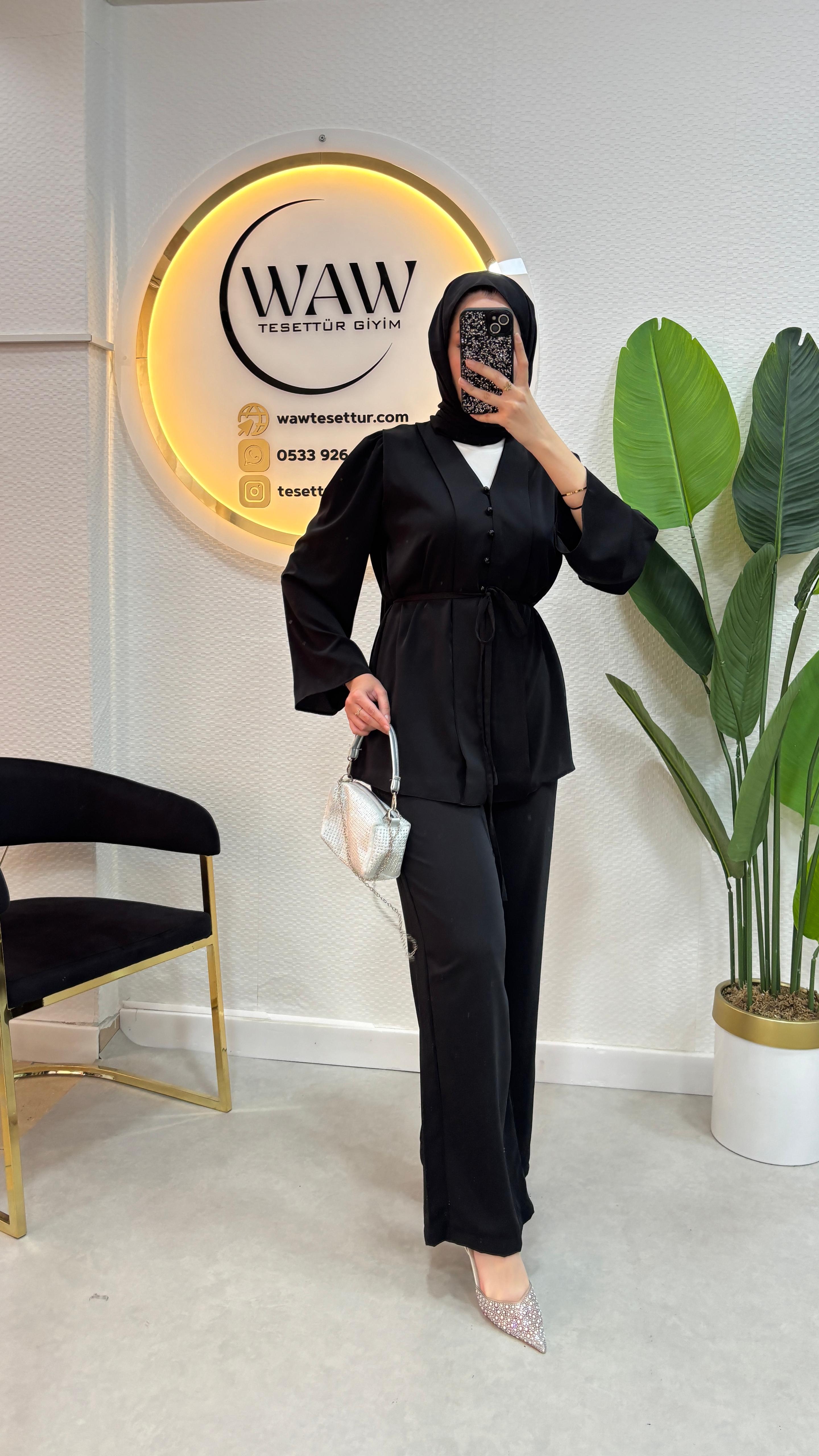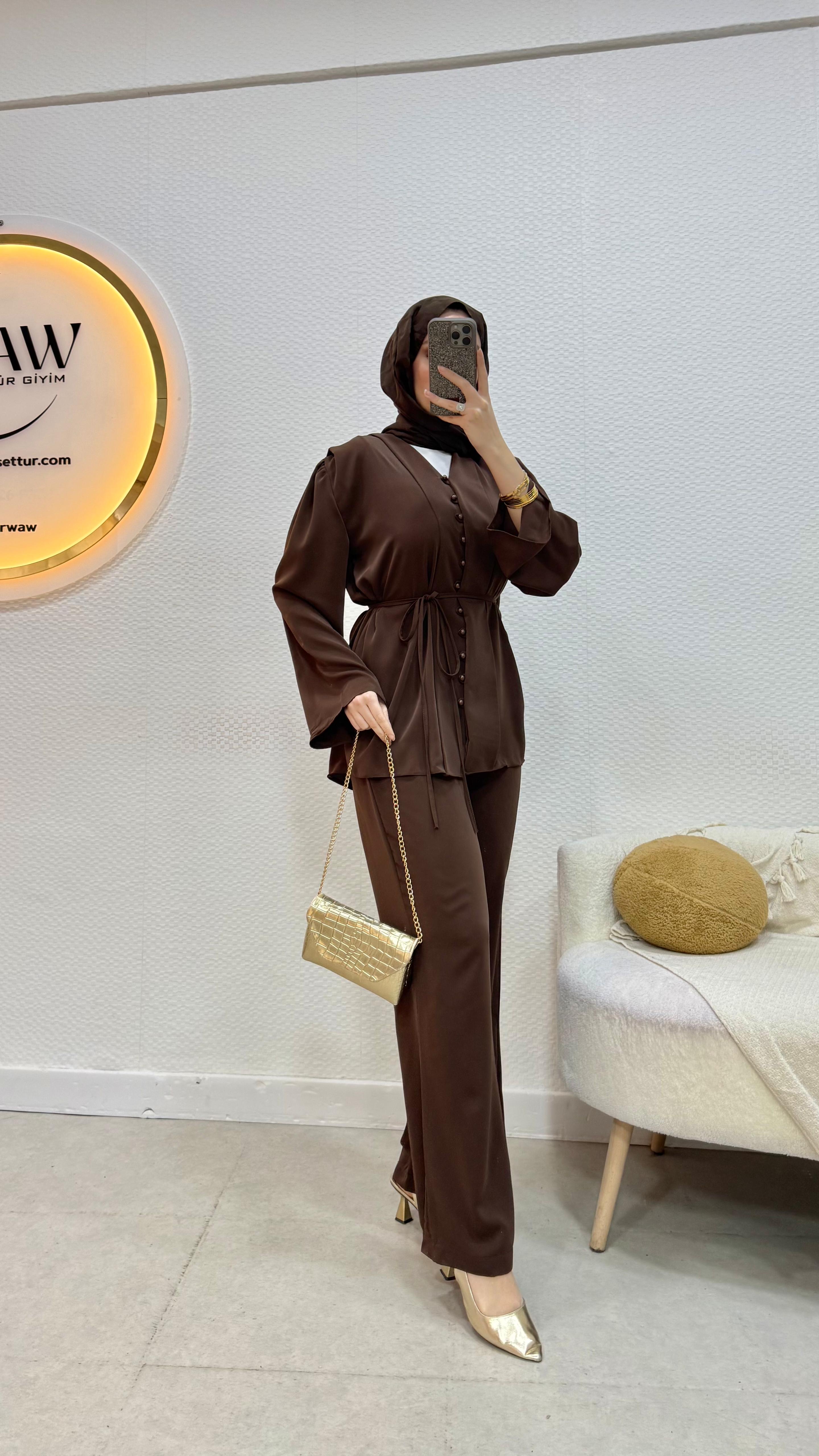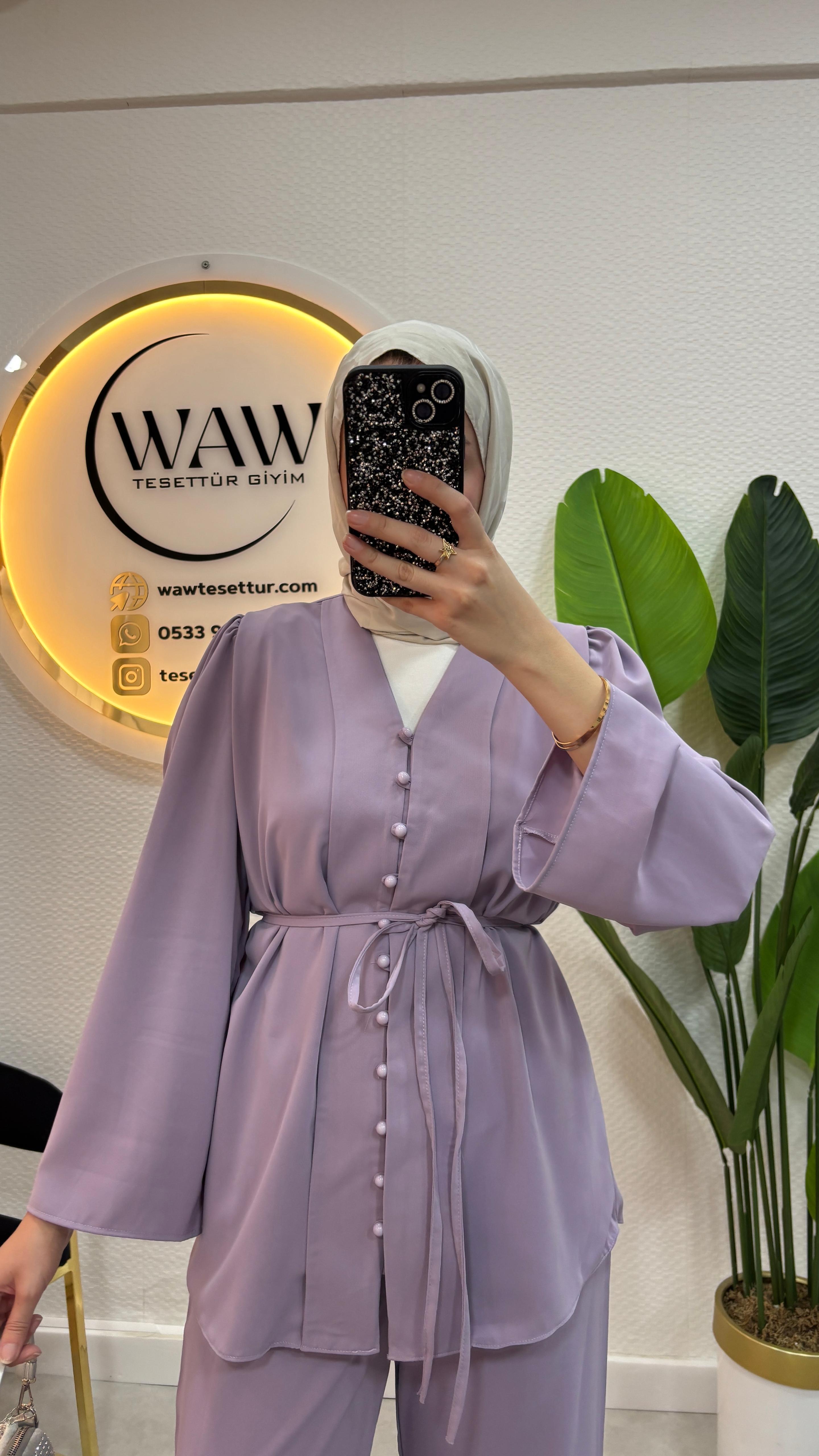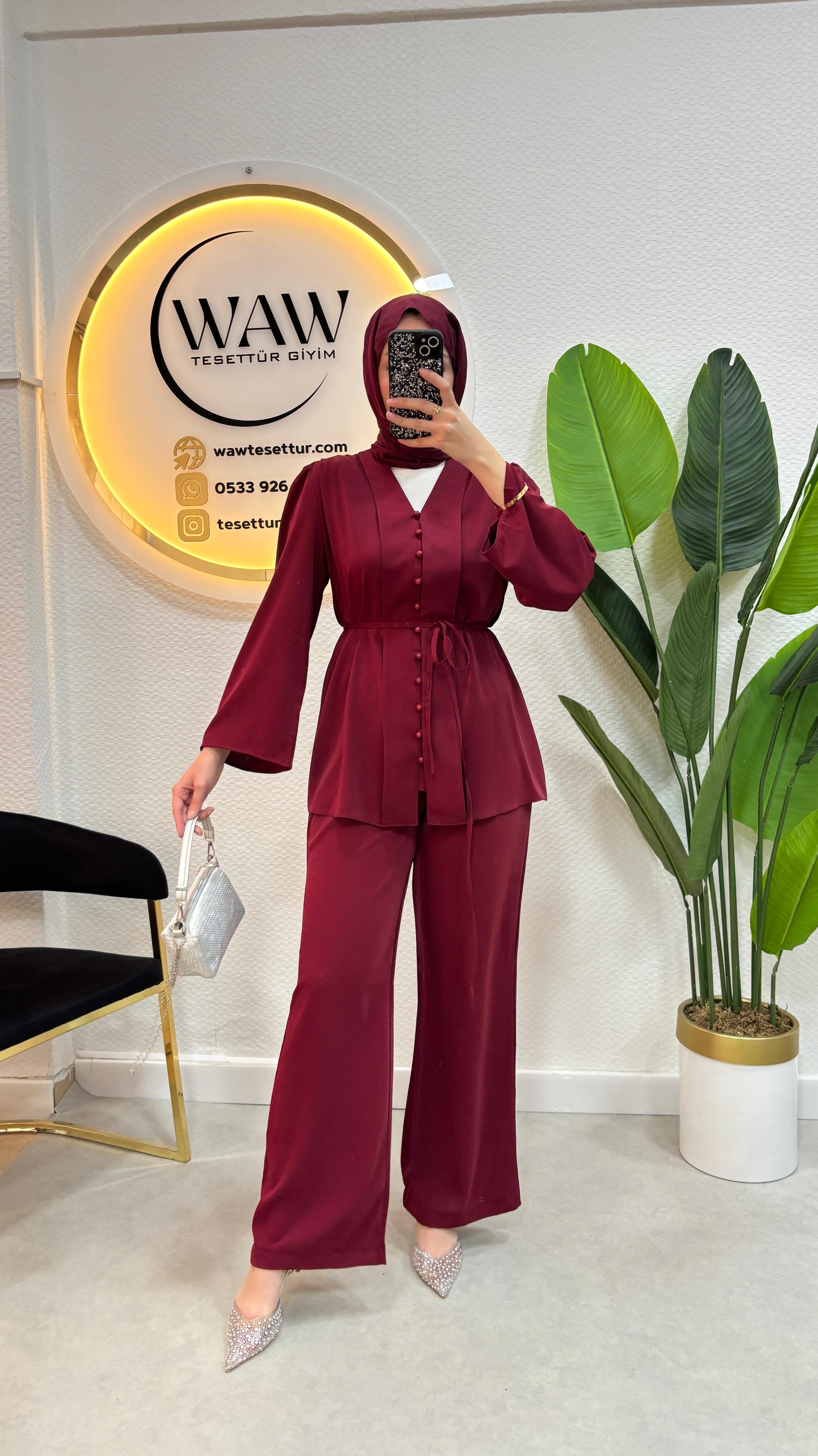 Ürünümüz dubai krep kumaştan üretilmiştir.Pantolon/tunik şeklinde ikili takımdır.Seyyar kemerlidir.36/38/40/42/44 bedenler mevcuttur. Pantolon bel lastiklidir.Manken 170/60kg 38 giymektedir.
