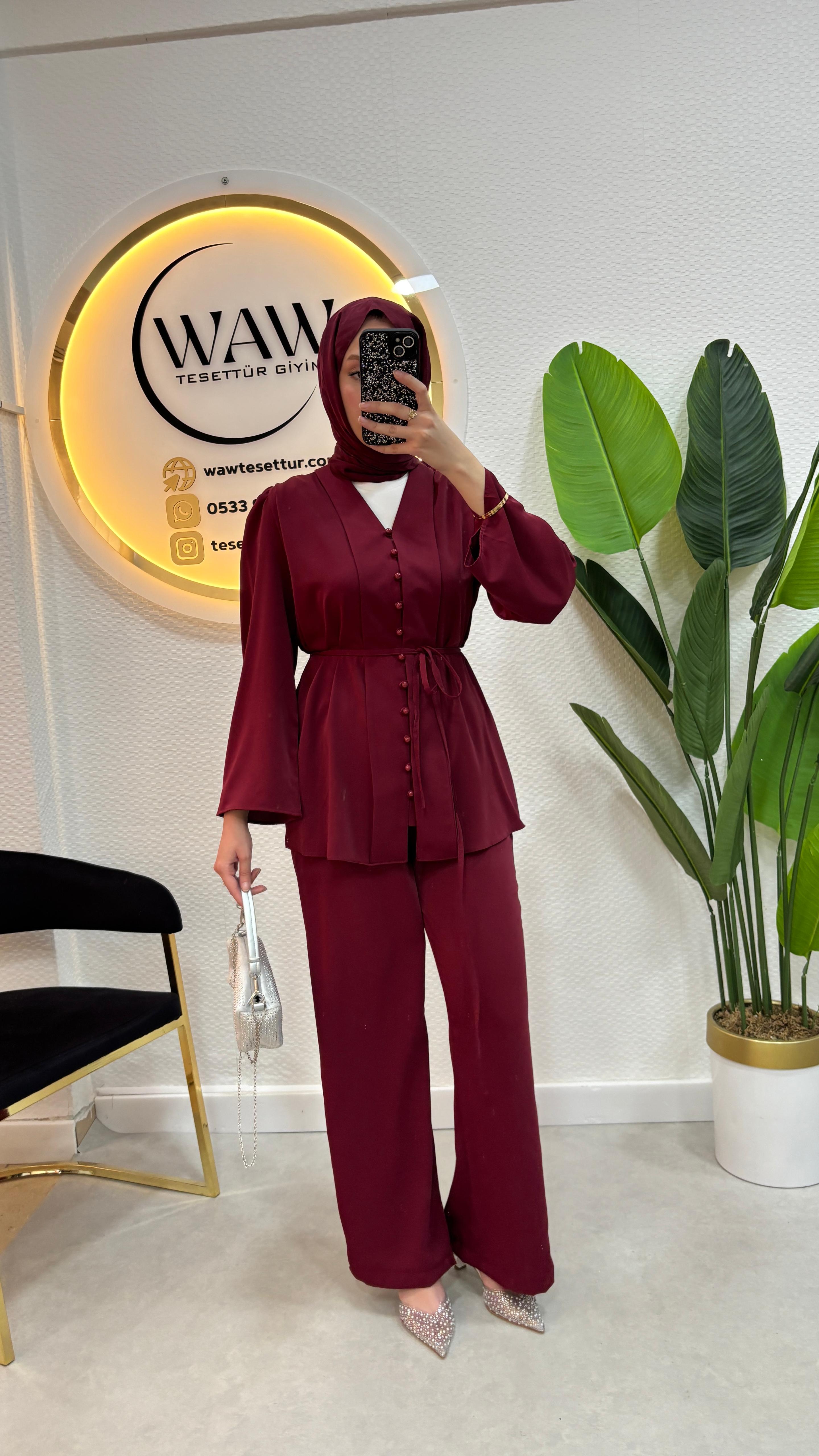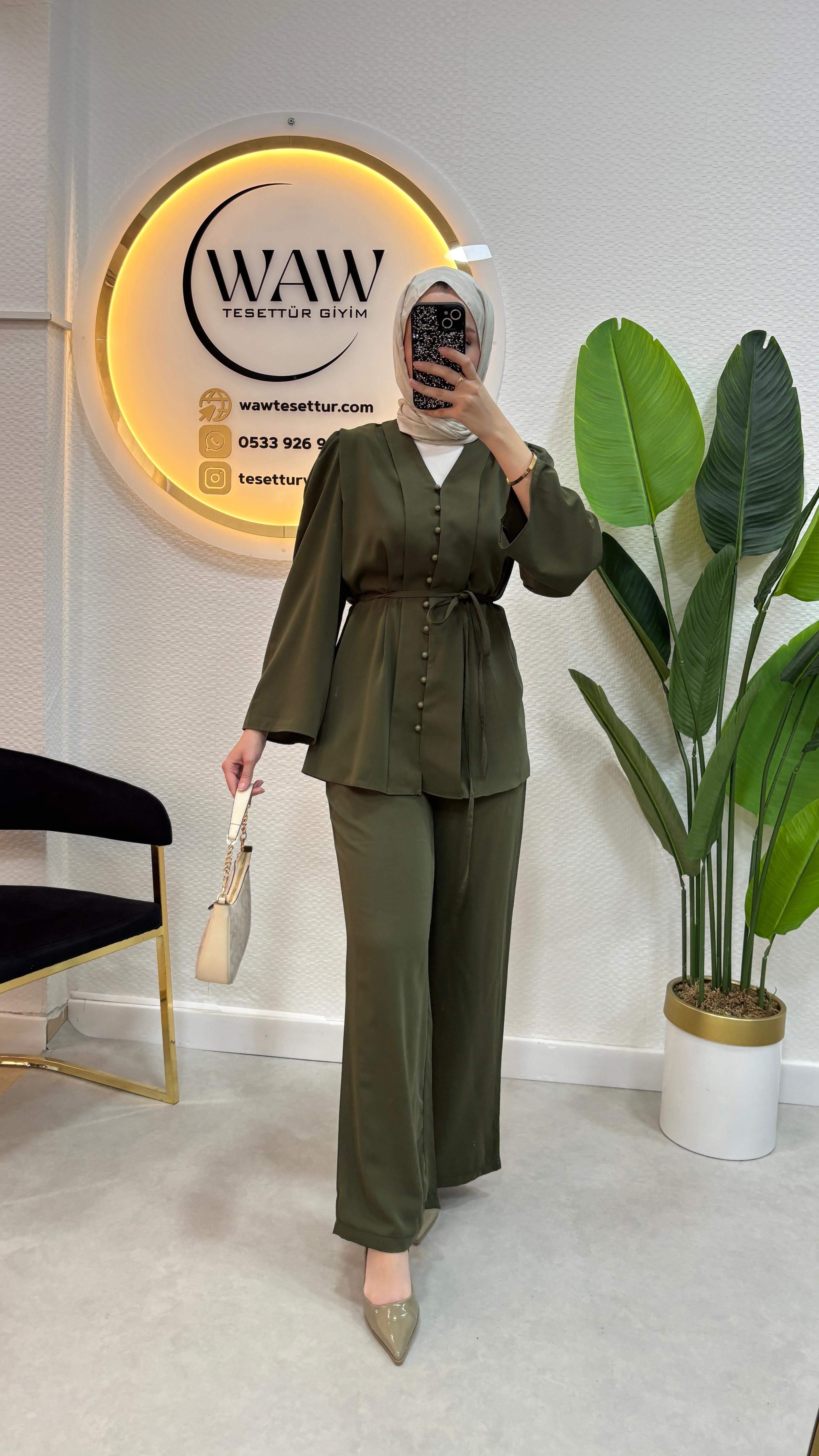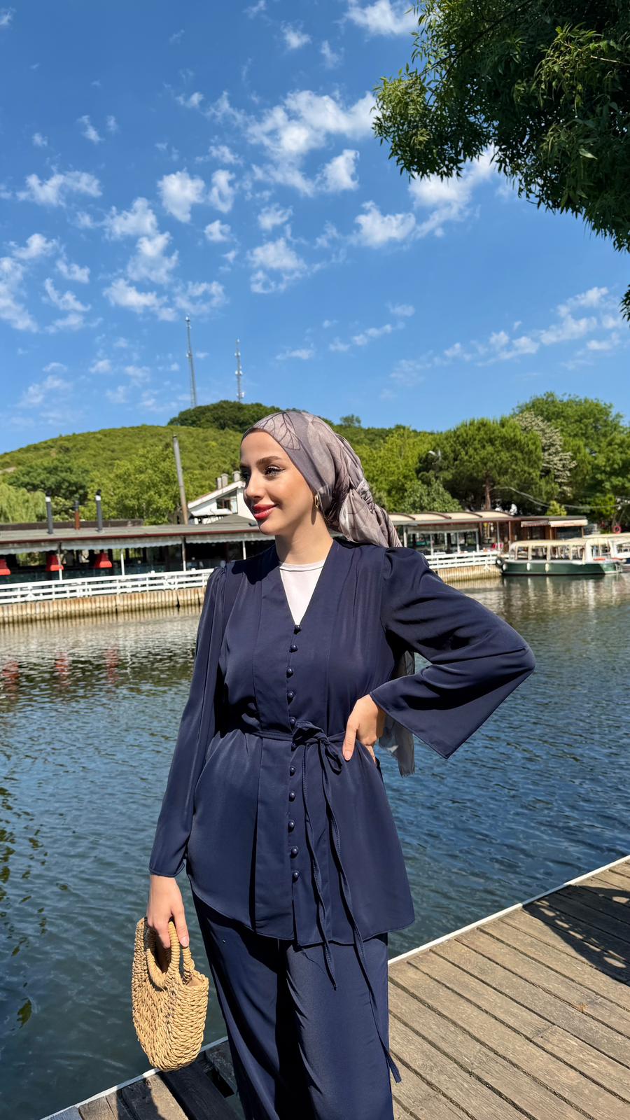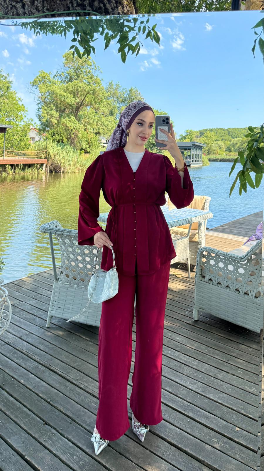 Ürünümüz dubai krep kumaştan üretilmiştir.Pantolon/tunik şeklinde ikili takımdır.Seyyar kemerlidir.36/38/40/42/44 bedenler mevcuttur. Pantolon bel lastiklidir.Manken 170/60kg 38 giymektedir.