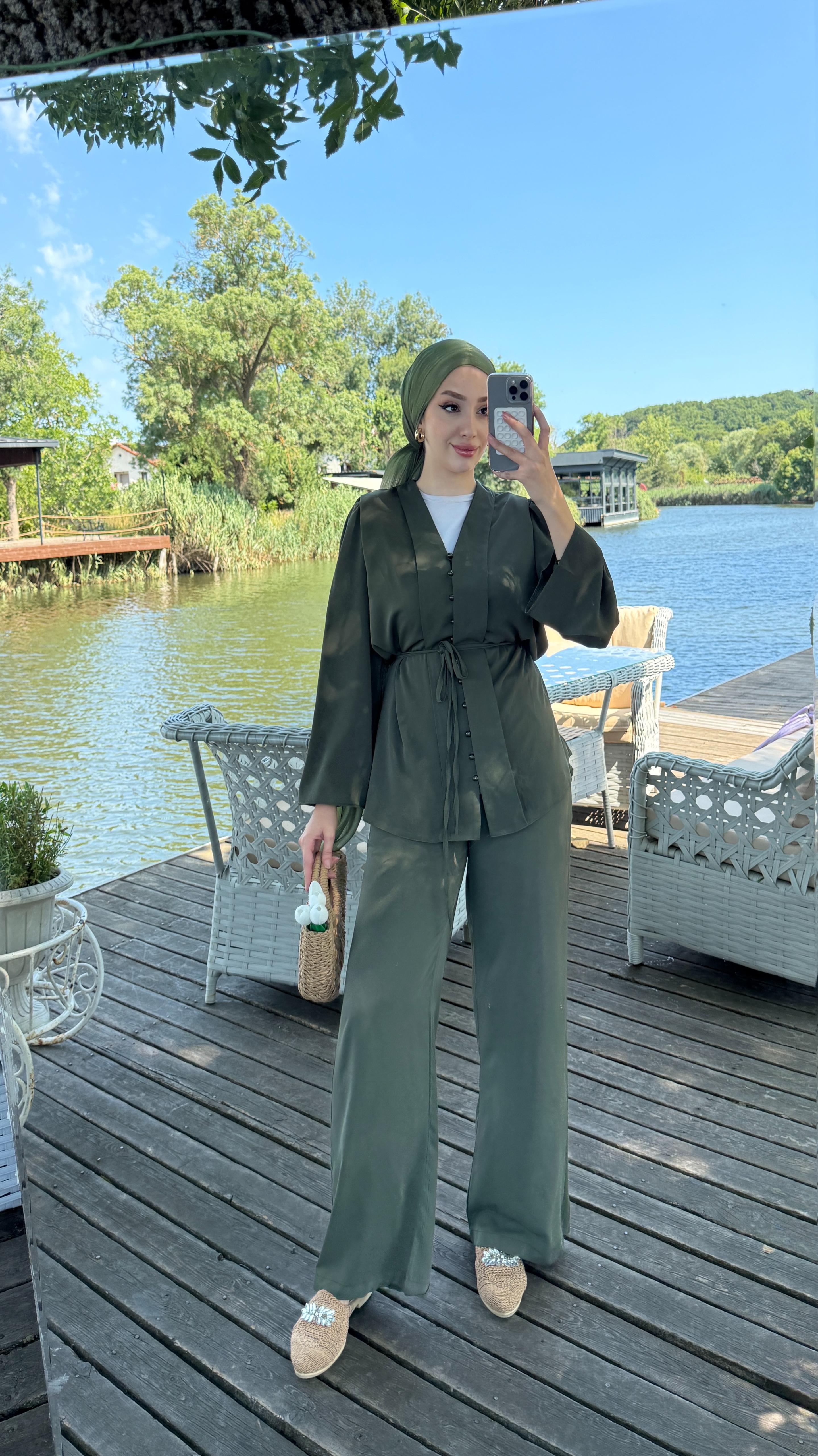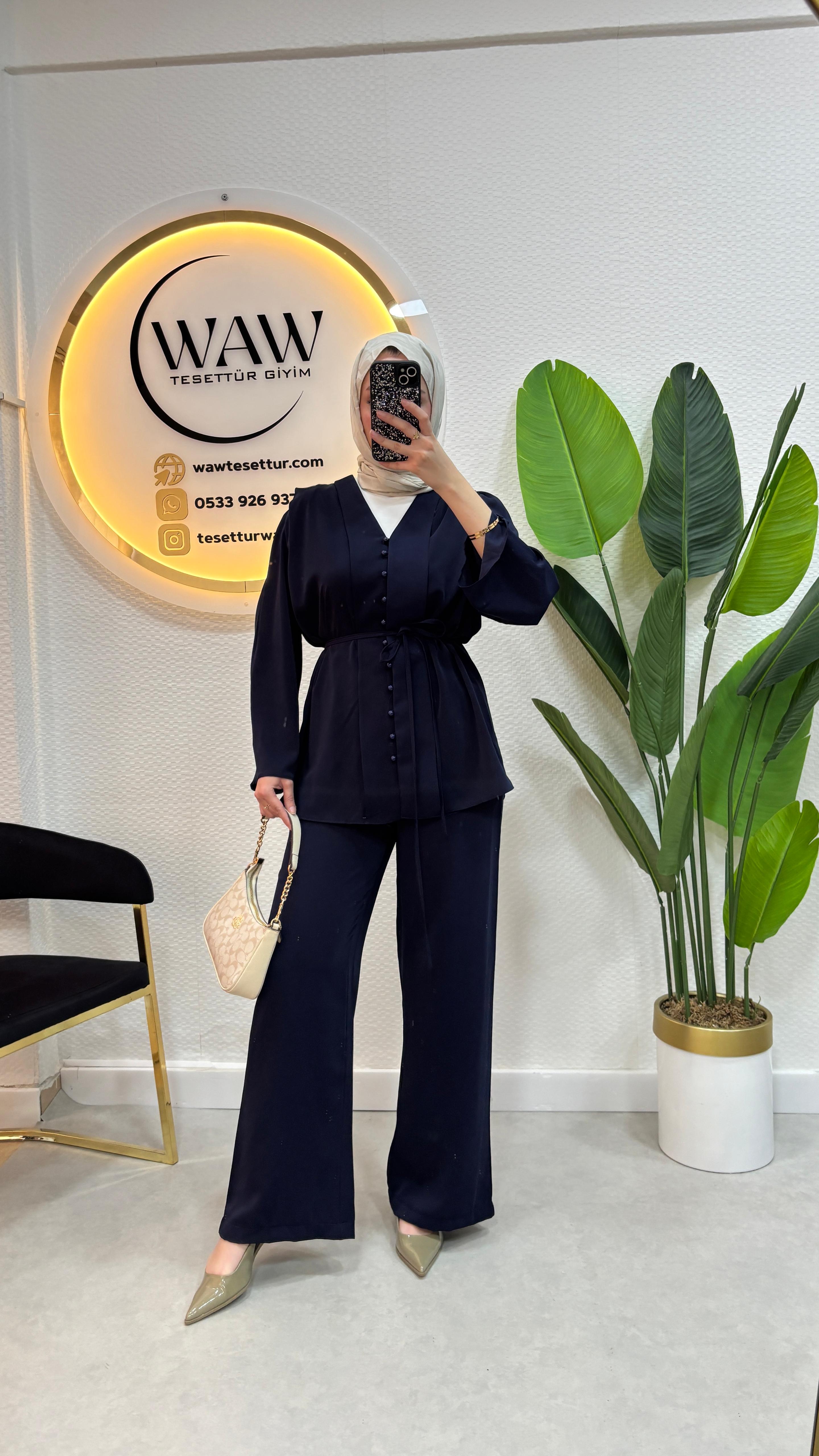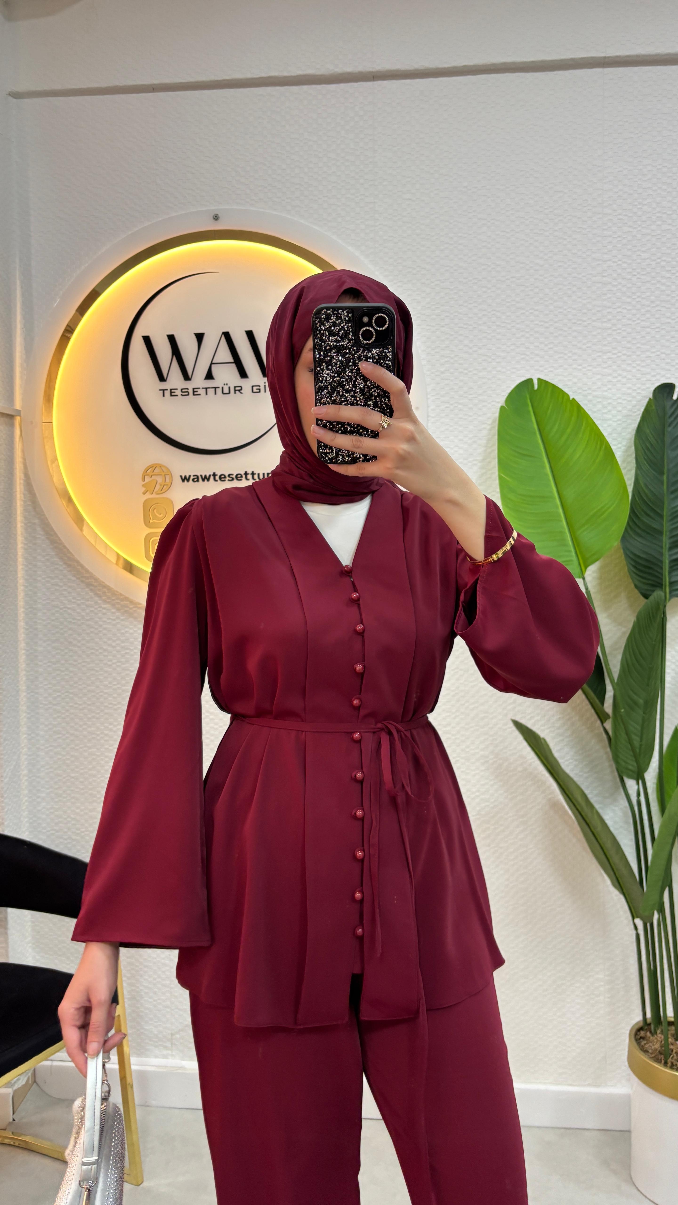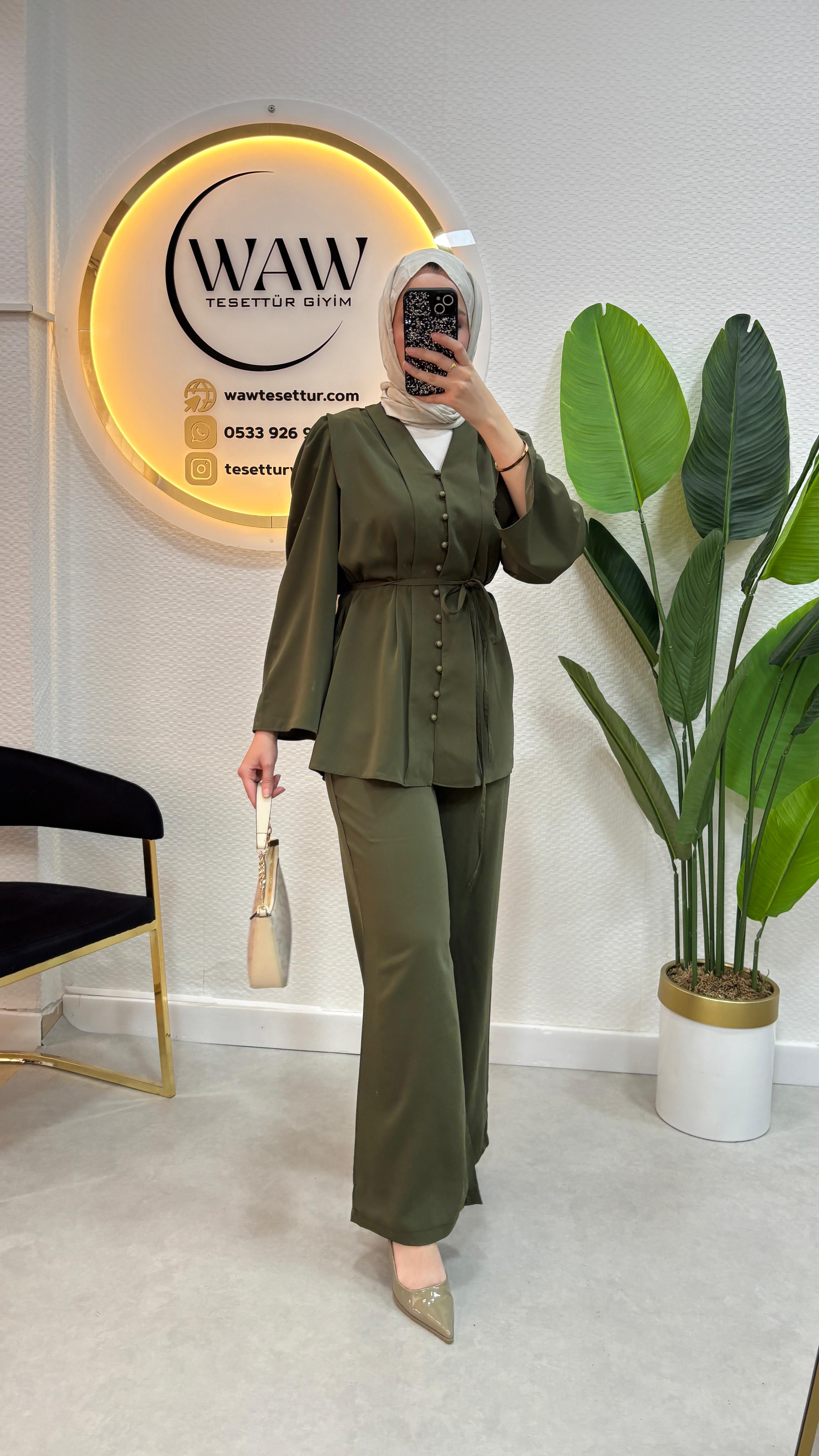Ürünümüz dubai krep kumaştan üretilmiştir.Pantolon/tunik şeklinde ikili takımdır.Seyyar kemerlidir.36/38/40/42/44 bedenler mevcuttur. Pantolon bel lastiklidir.Manken 170/60kg 38 giymektedir.