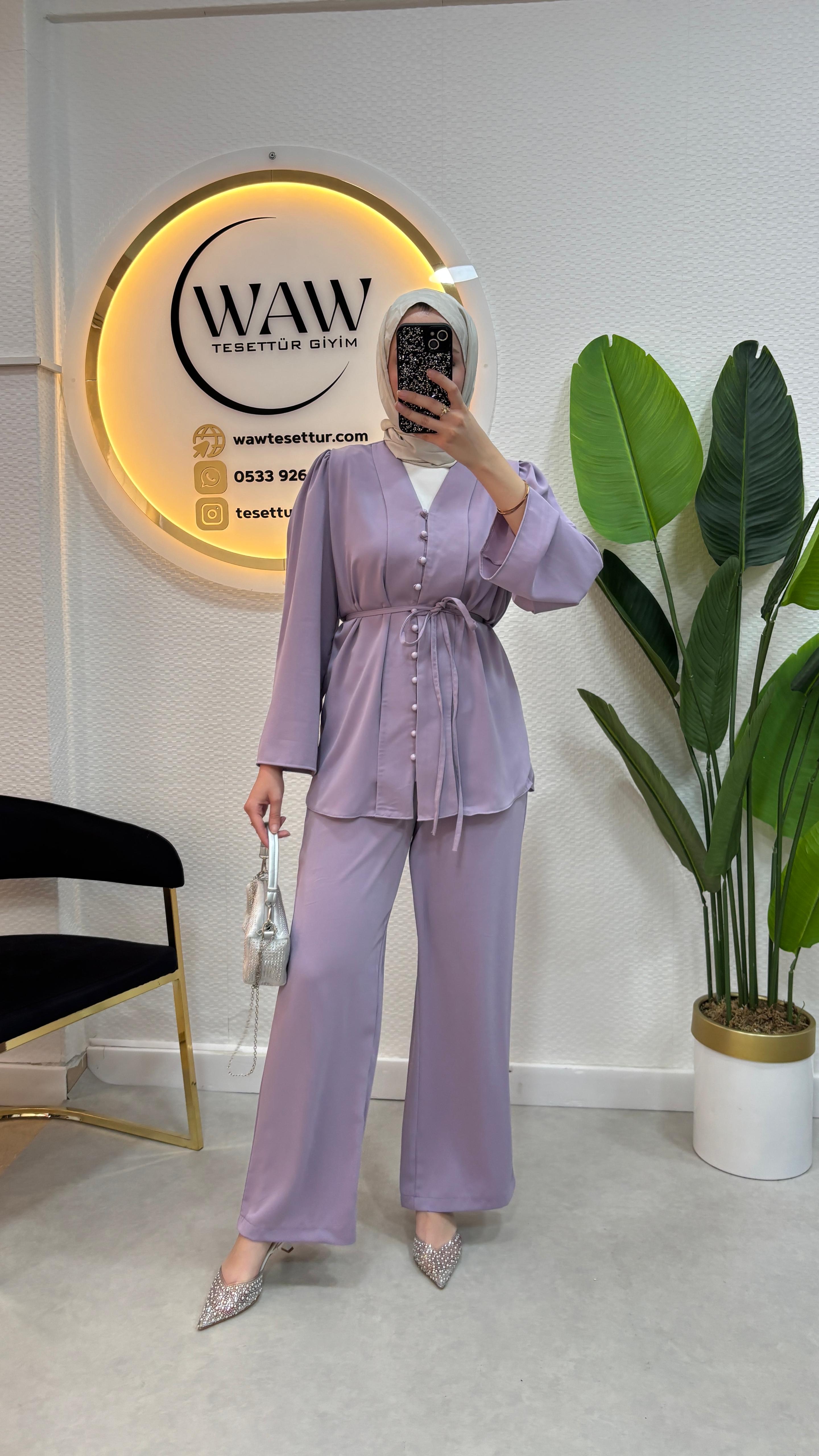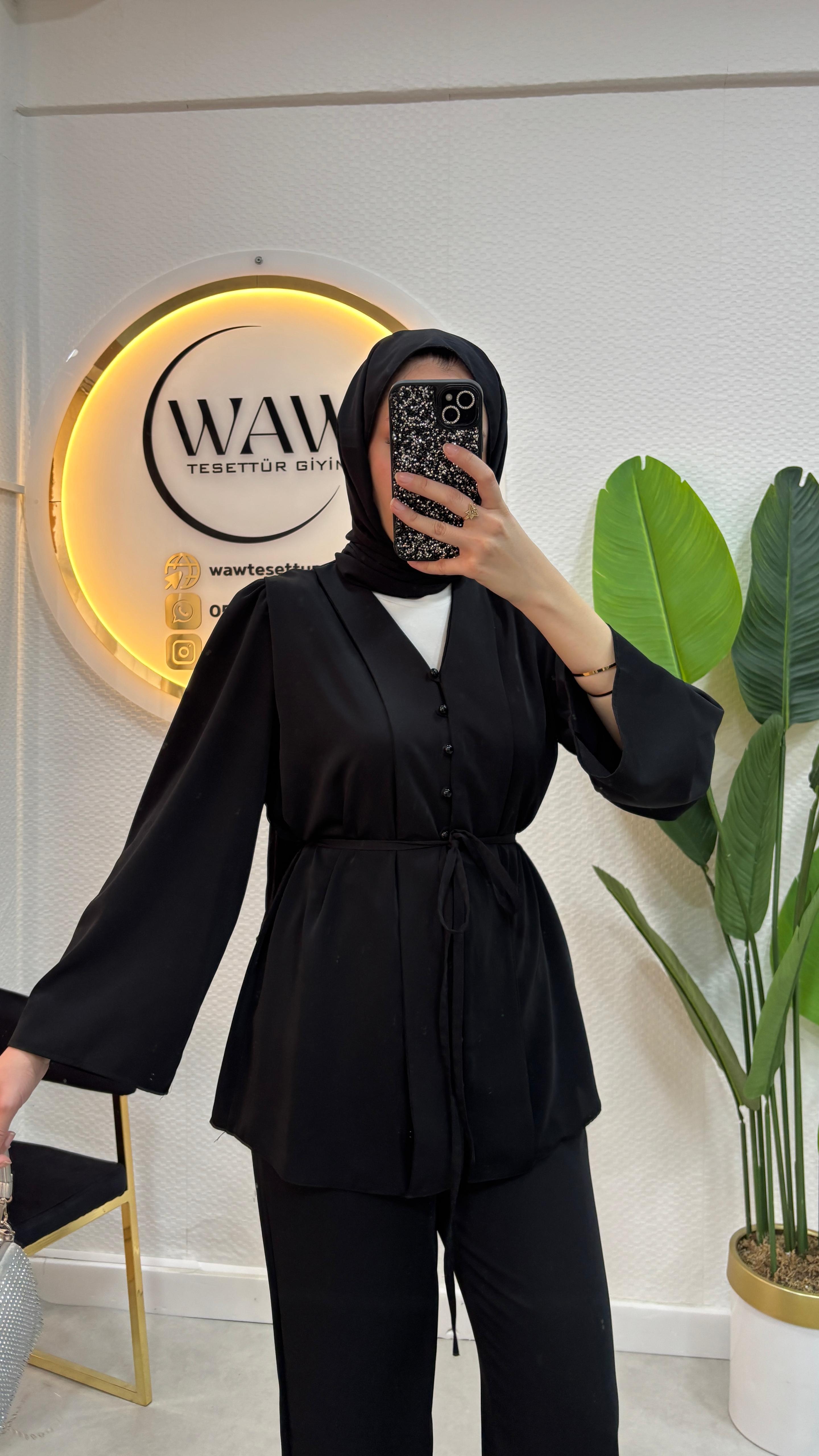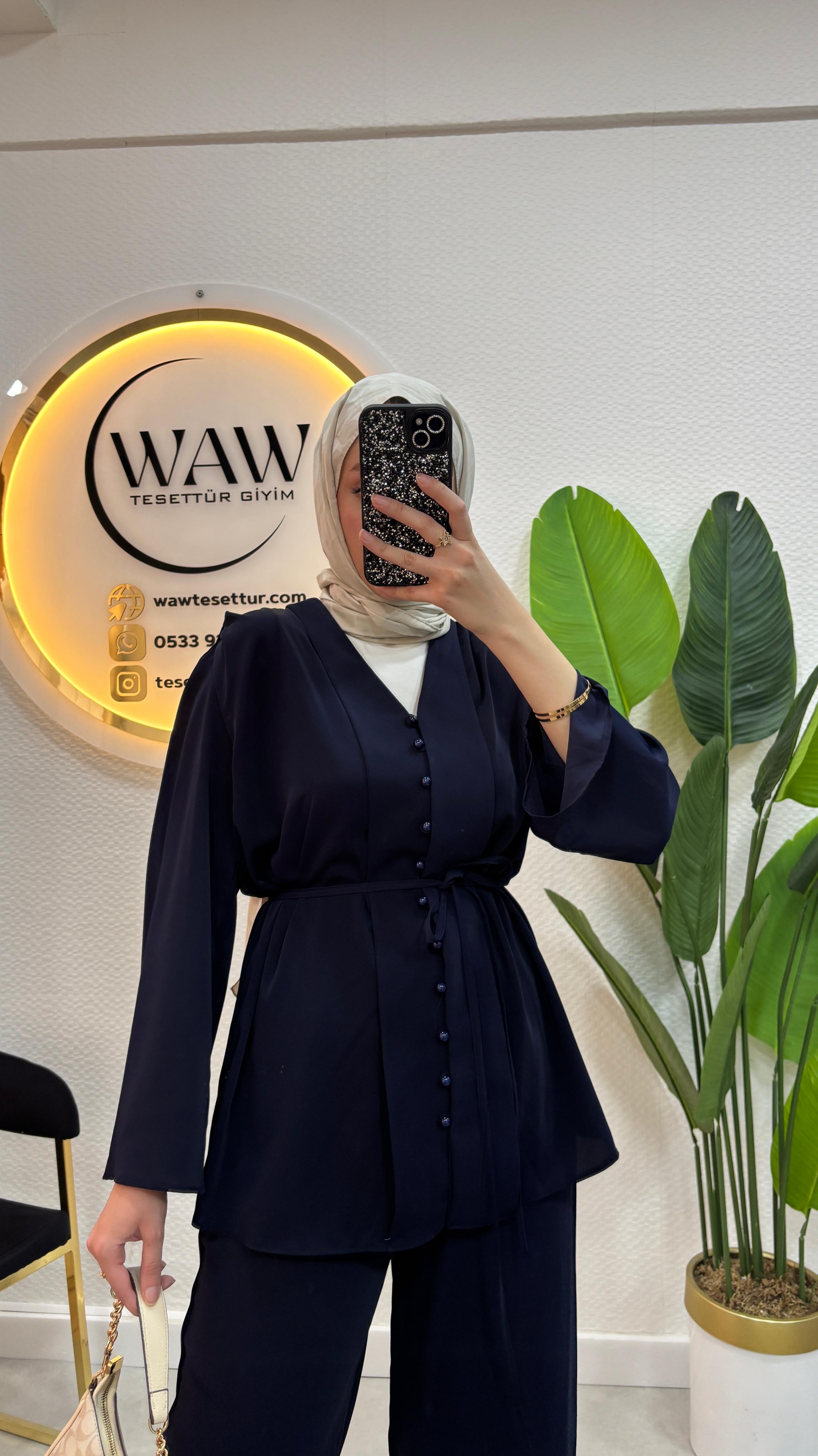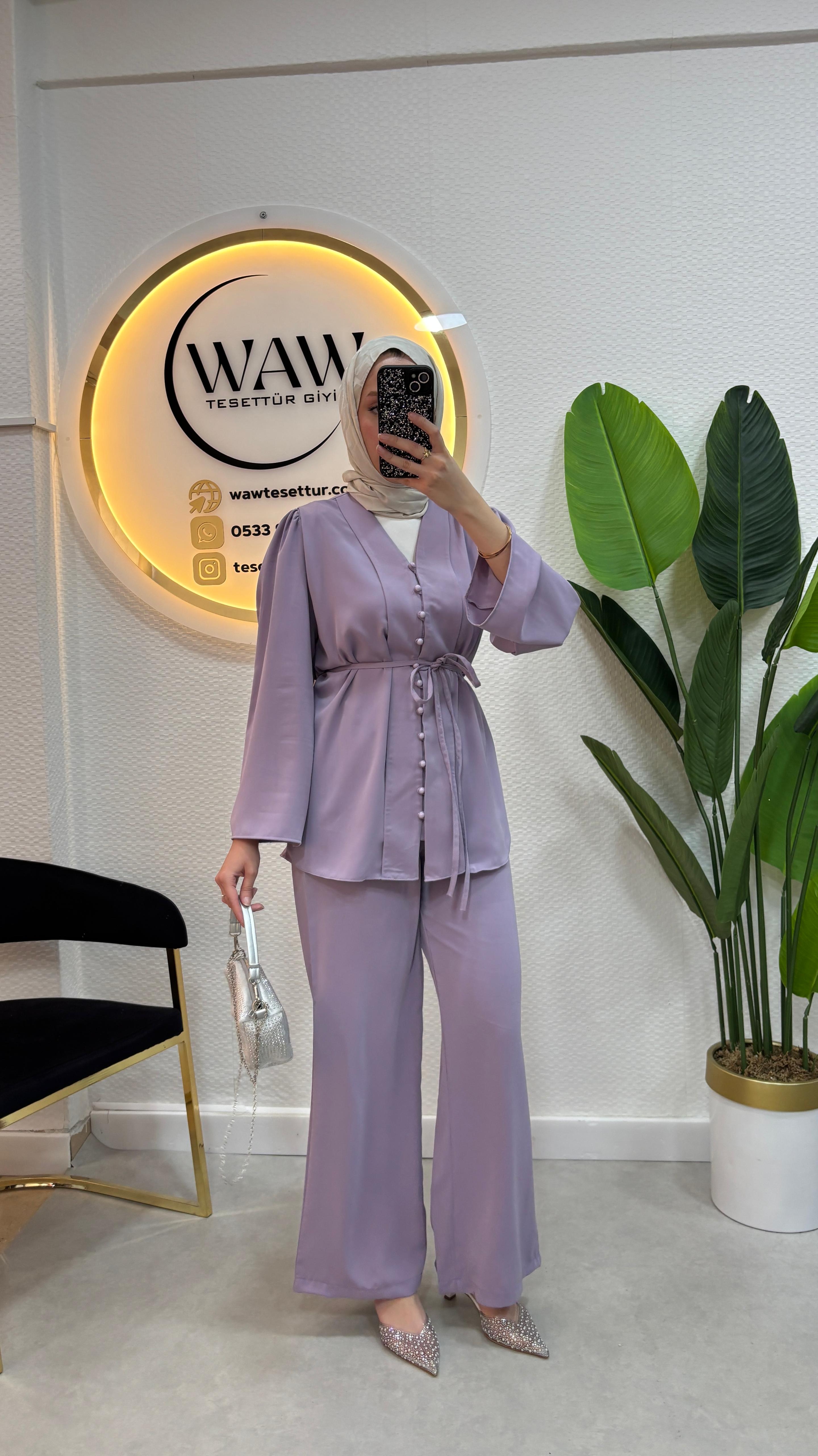 Ürünümüz dubai krep kumaştan üretilmiştir.Pantolon/tunik şeklinde ikili takımdır.Seyyar kemerlidir.36/38/40/42/44 bedenler mevcuttur. Pantolon bel lastiklidir.Manken 170/60kg 38 giymektedir.