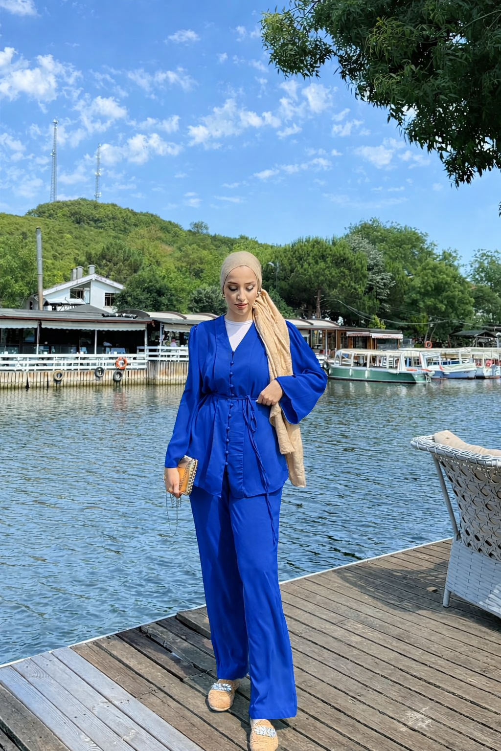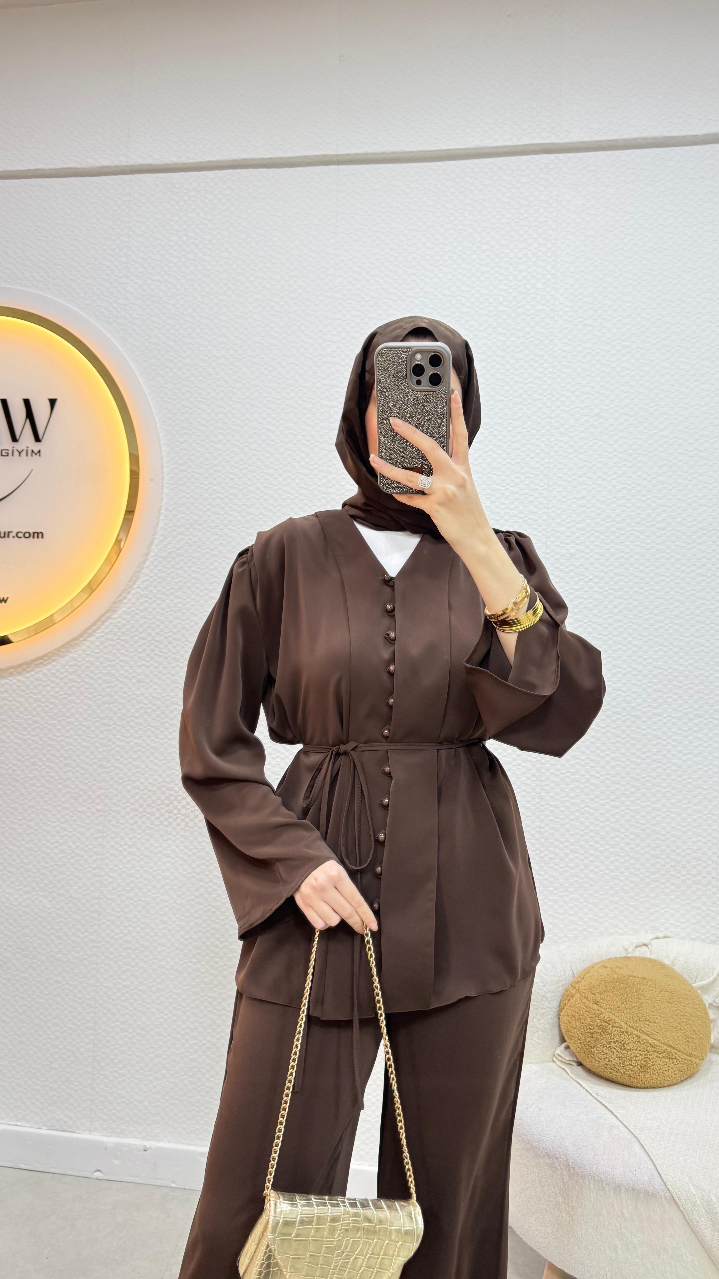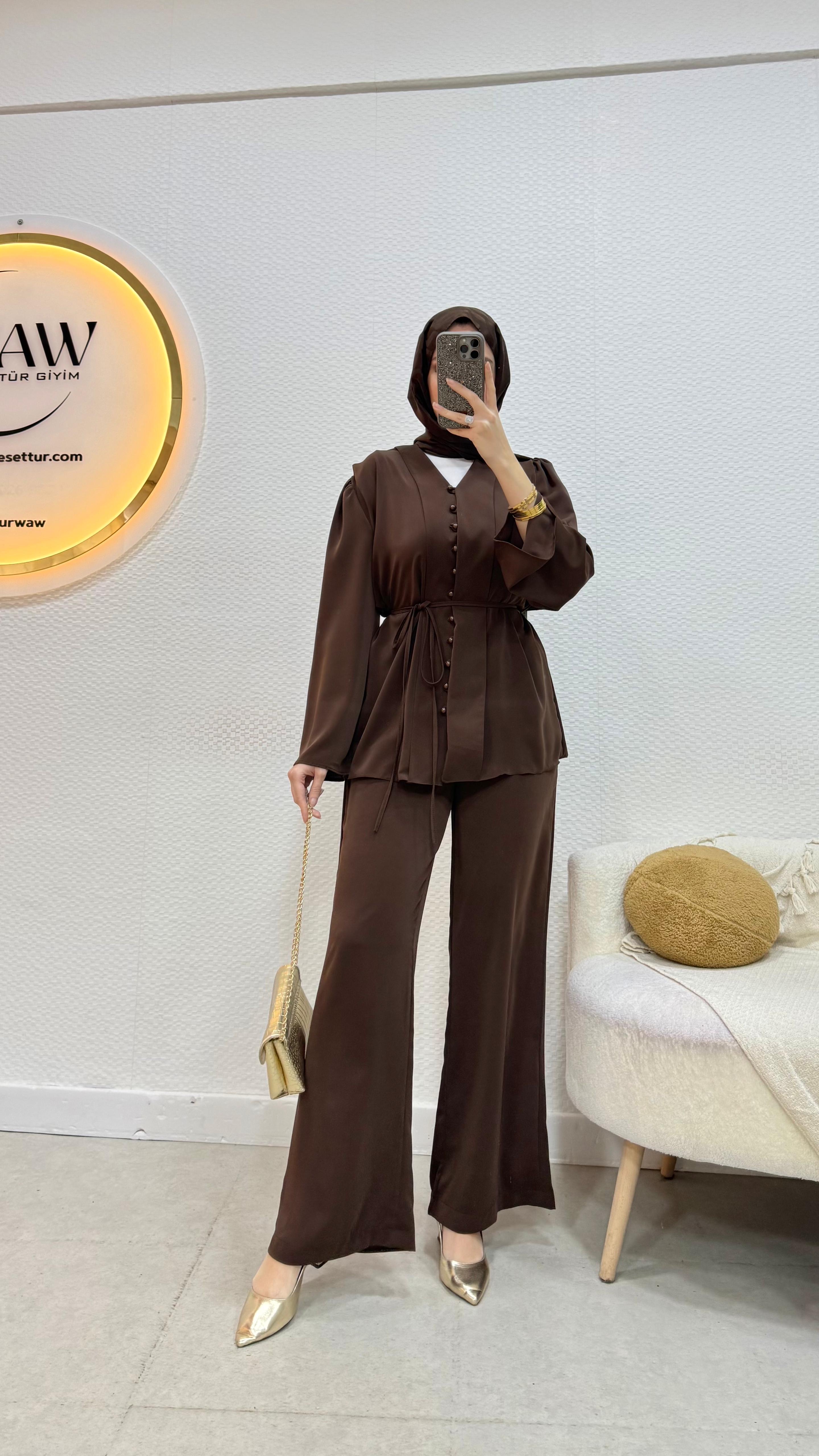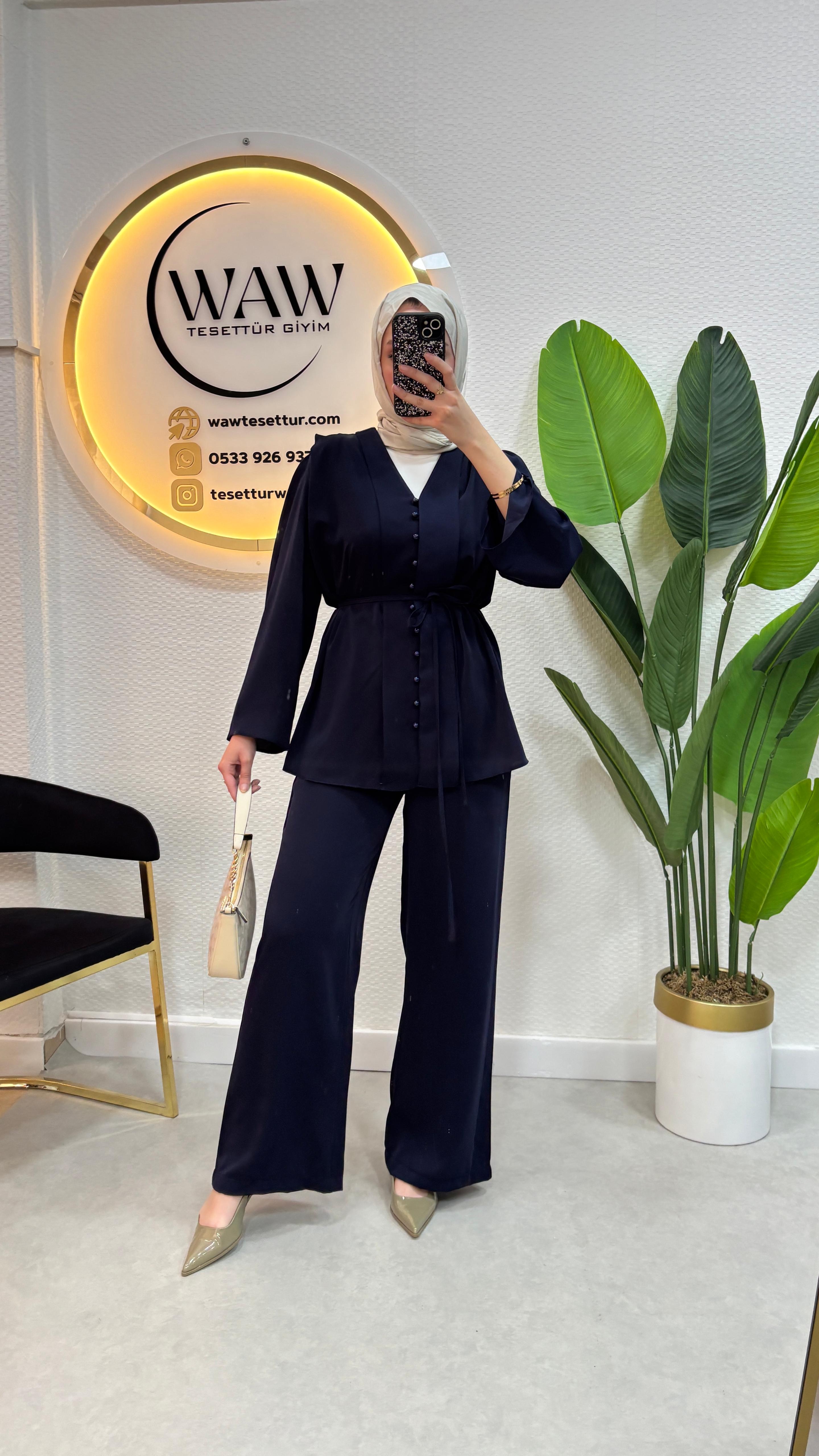 Ürünümüz dubai krep kumaştan üretilmiştir.Pantolon/tunik şeklinde ikili takımdır.Seyyar kemerlidir.36/38/40/42/44 bedenler mevcuttur. Pantolon bel lastiklidir.Manken 170/60kg 38 giymektedir.