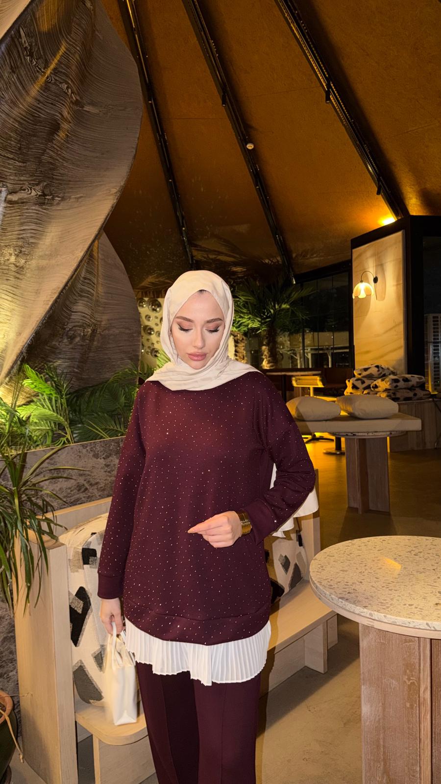 Taşlı oyso kumaştan üretilmiştir Pantolon ve tunikten oluşmuştur Kolları manşetlidir 36/38/40/42/44 bedenler mevcuttur. Çekim mankeni 170/60kg 38 beden tercih etmektedir