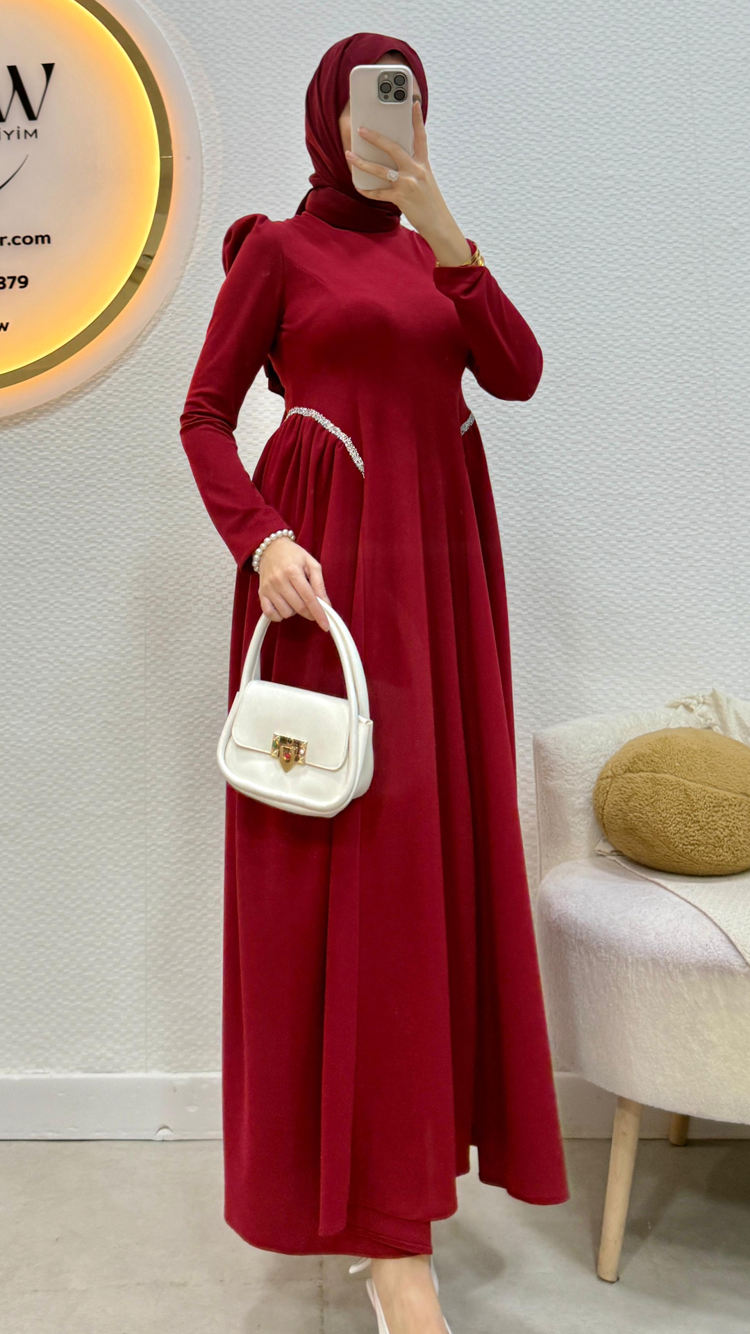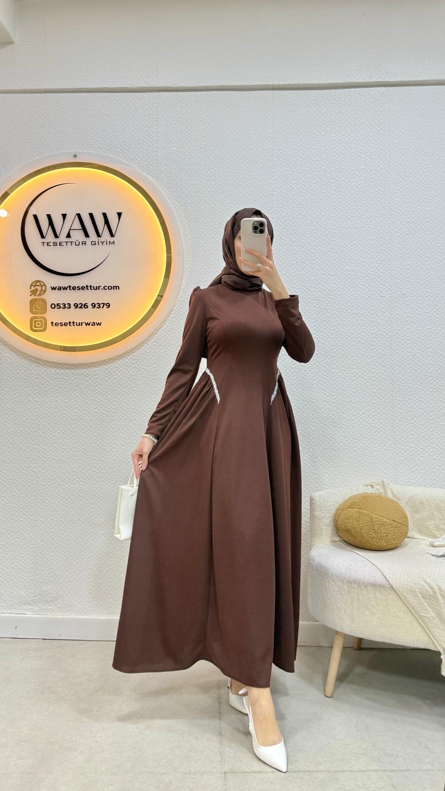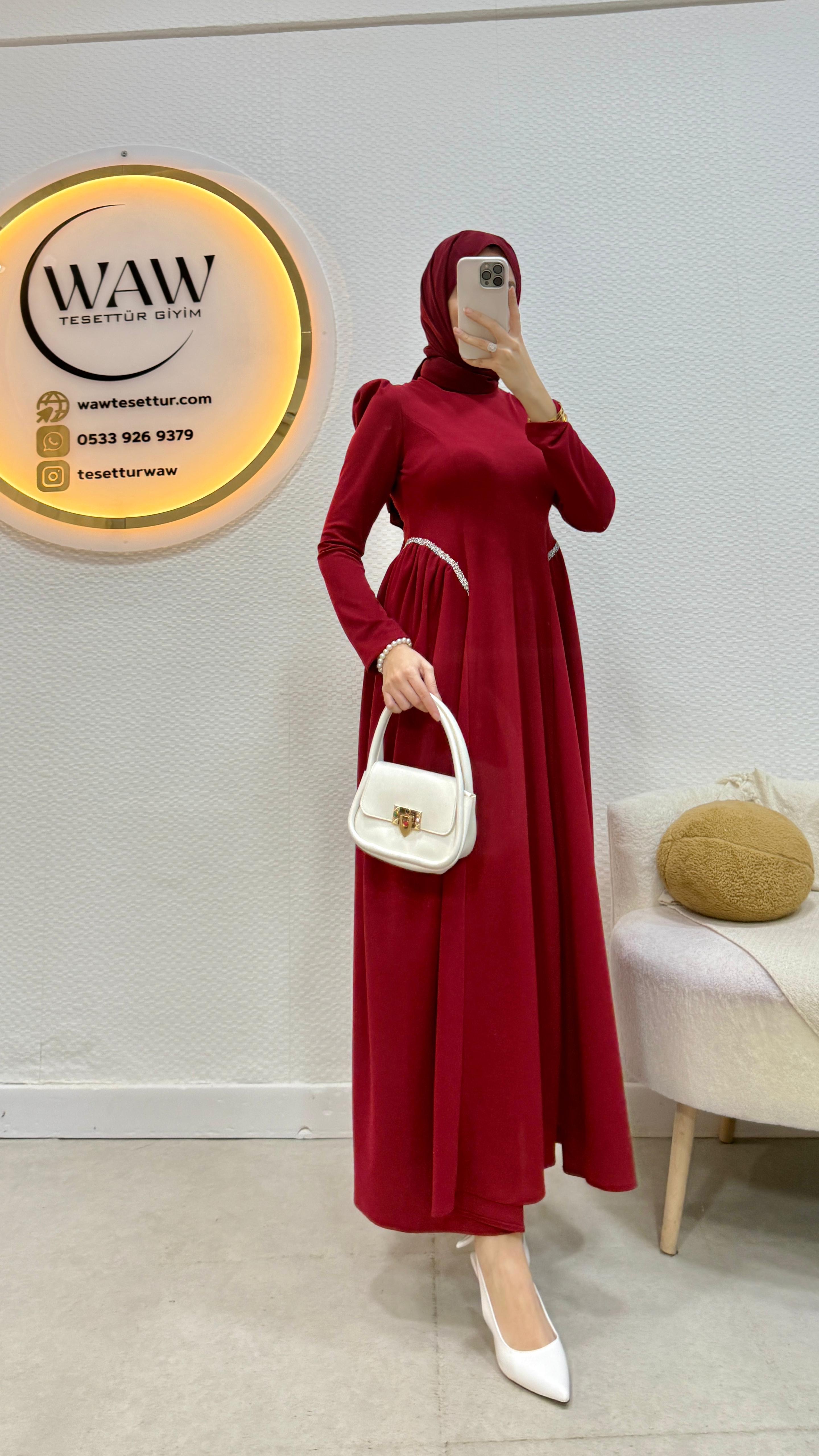 Ürünümüz birinci kalite krep kumaştan üretilmiştir. Bel taş detaylıdır, hakim yakadır. Arka orta gizli fermuarlıdır: Mevlana kesimdir. 36/38/40/42/44 bedenler mevcuttur. ürün boyu 140cmdir. Ürünümüz tam kalıptır.Manken 170/60kg 38 giymektedir.