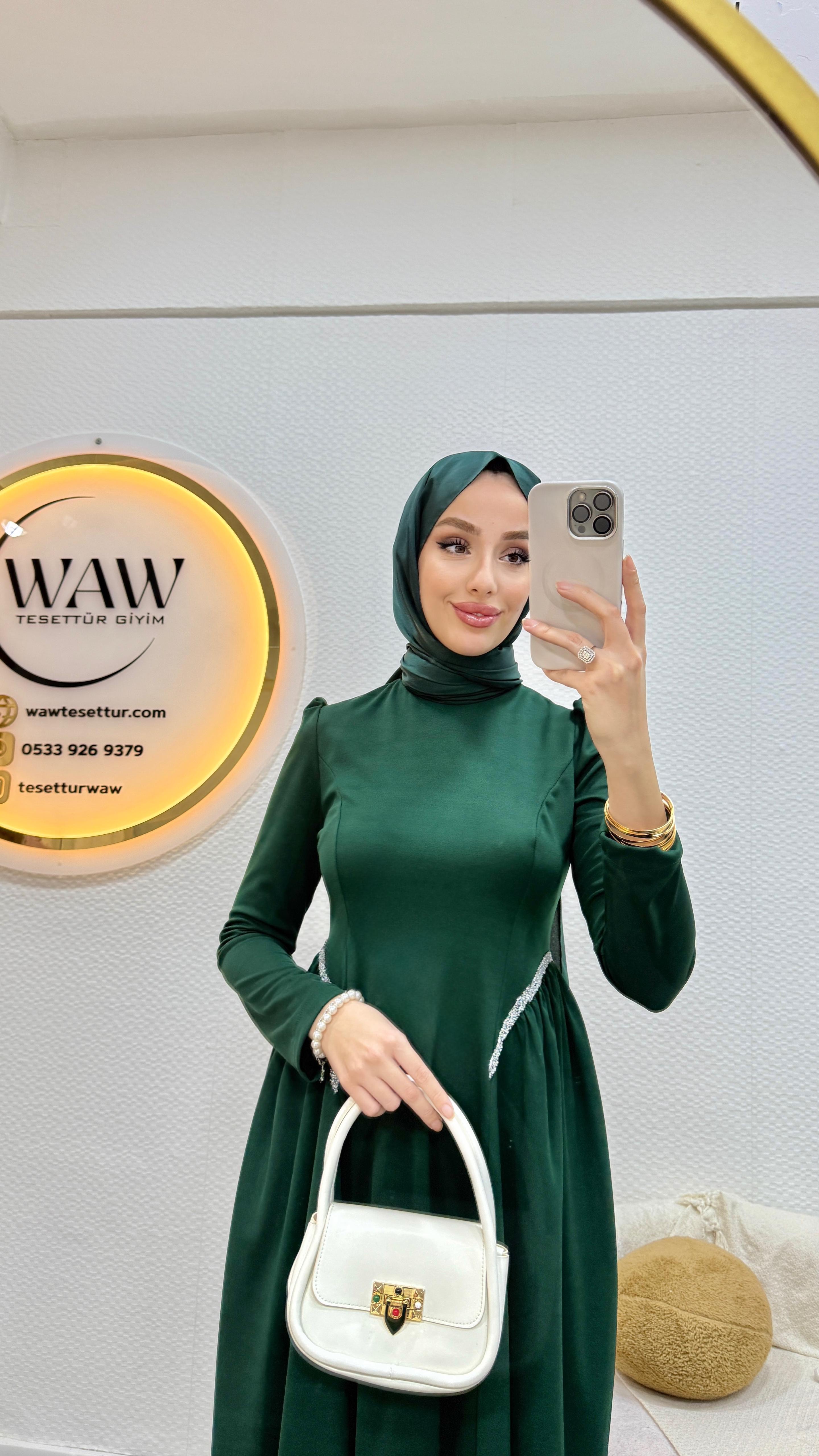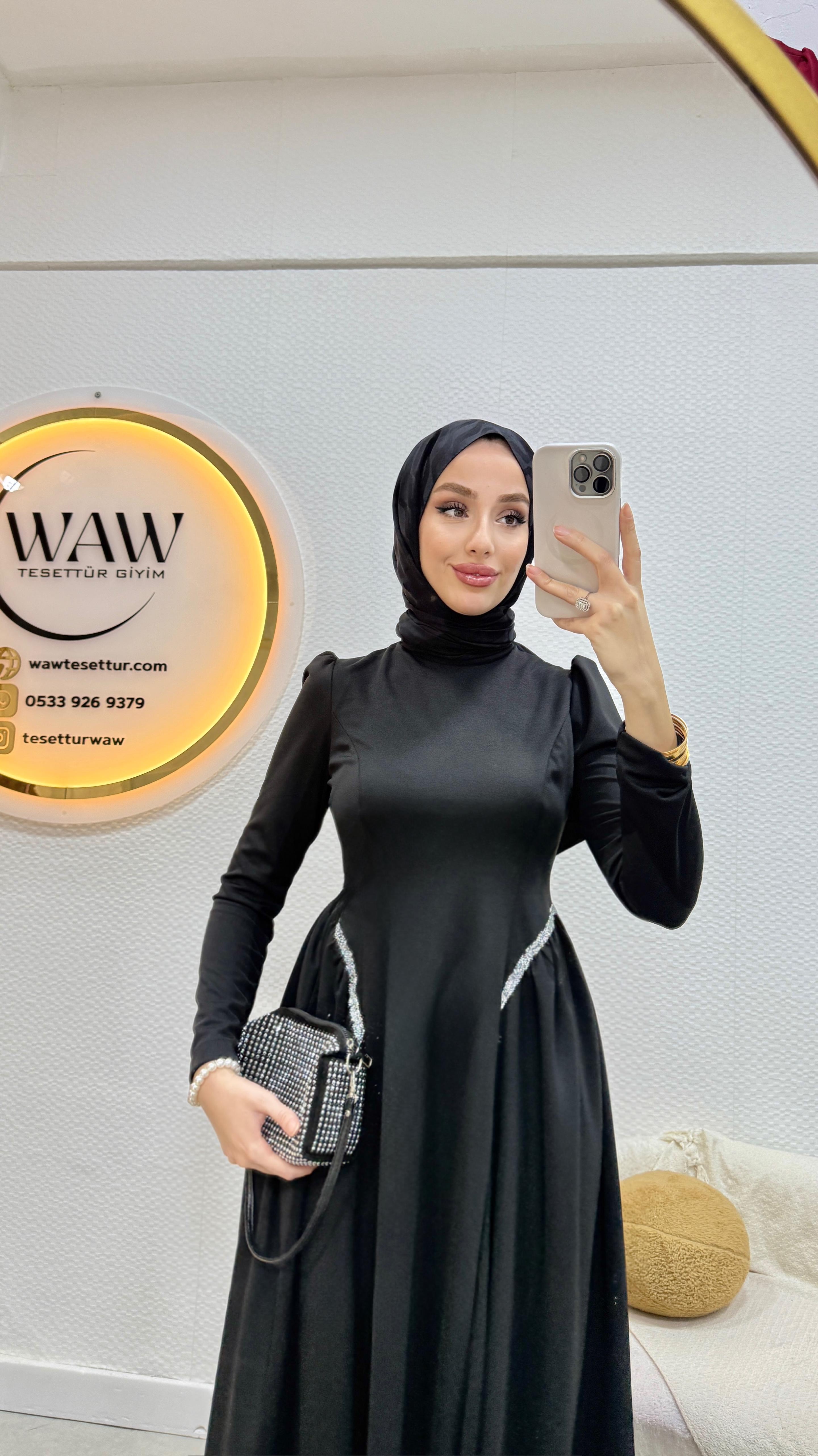 Ürünümüz birinci kalite krep kumaştan üretilmiştir. Bel taş detaylıdır, hakim yakadır. Arka orta gizli fermuarlıdır: Mevlana kesimdir. 36/38/40/42/44 bedenler mevcuttur. ürün boyu 135cmdir. Manken 170/60kg 38 giymektedir.