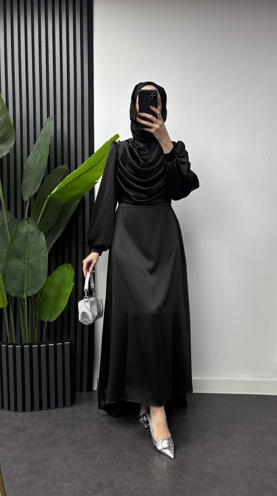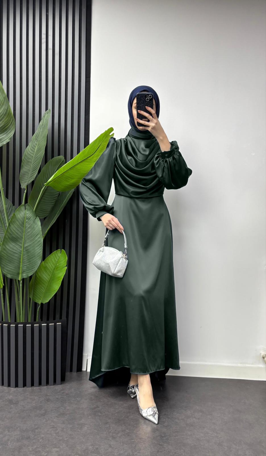 Fırsat Ürünü - Yakası Taşlı Saten Elbise - İp Çekme / Kemersiz