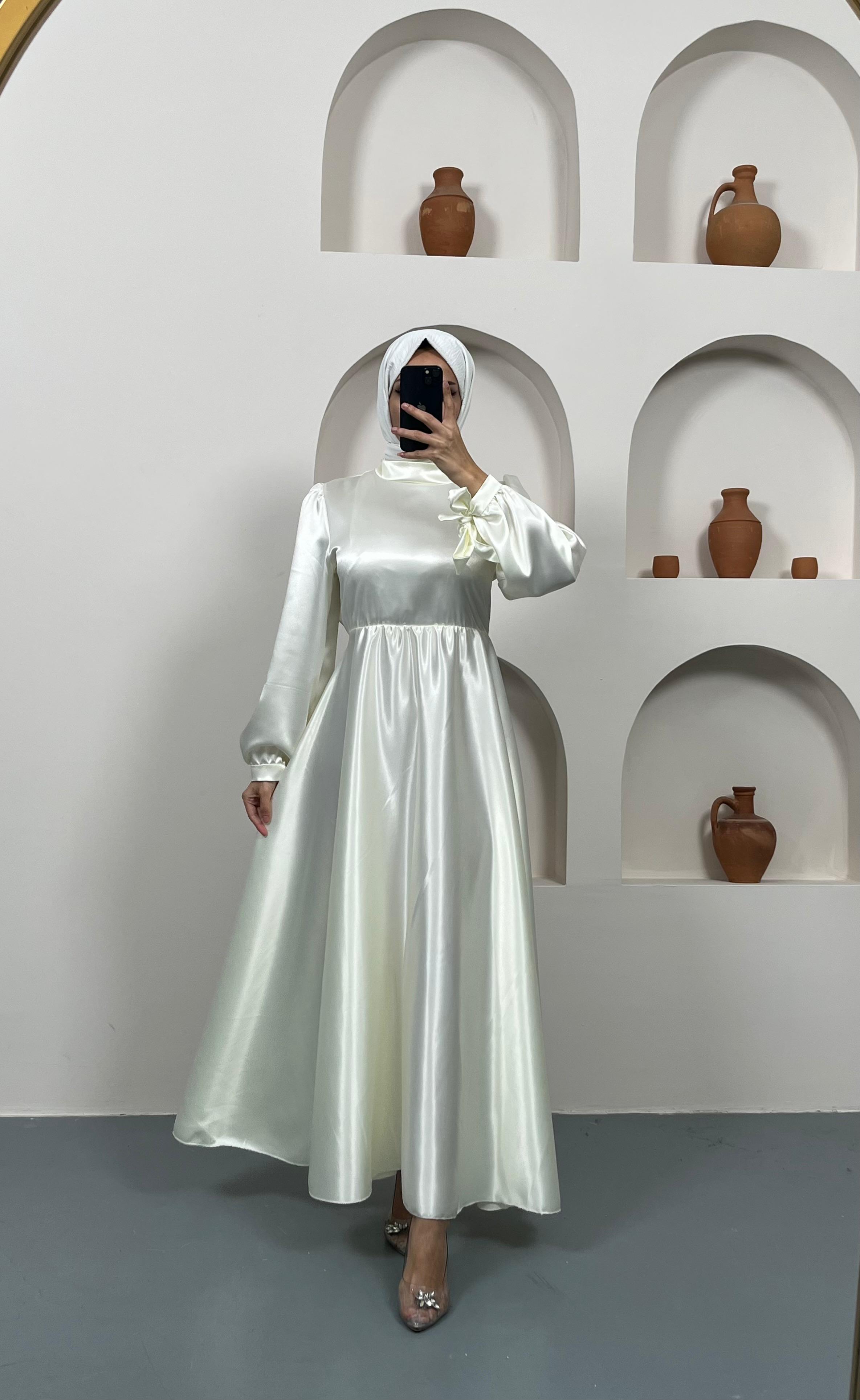 Fırsat Ürünü - Yakası Taşlı Saten Elbise - İp Çekme / Kemersiz