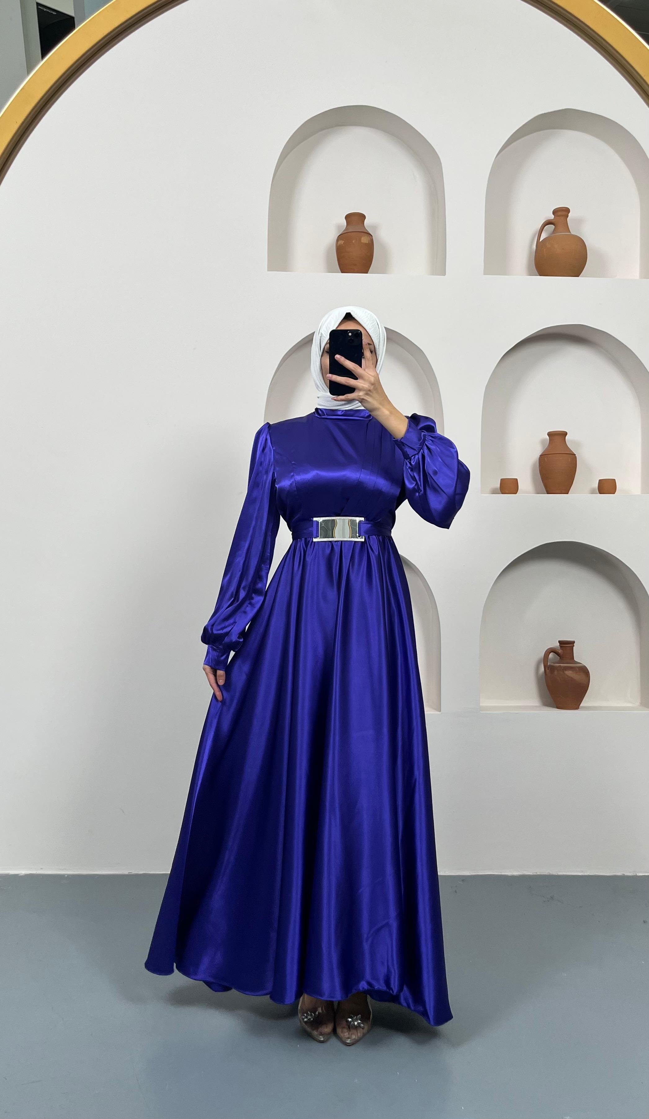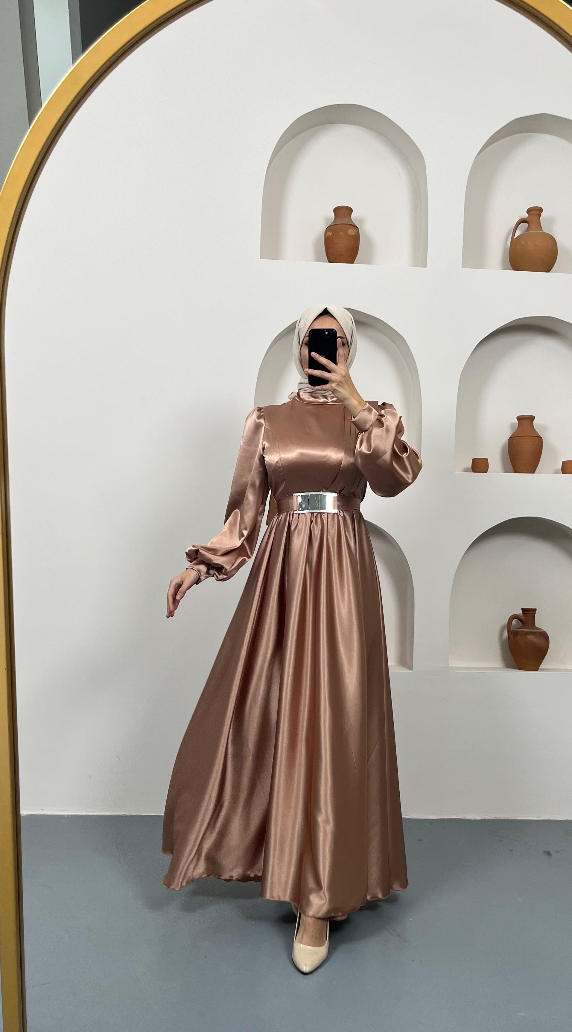Fırsat Ürünü - Yakası Taşlı Saten Elbise - İp Çekme / Kemersiz