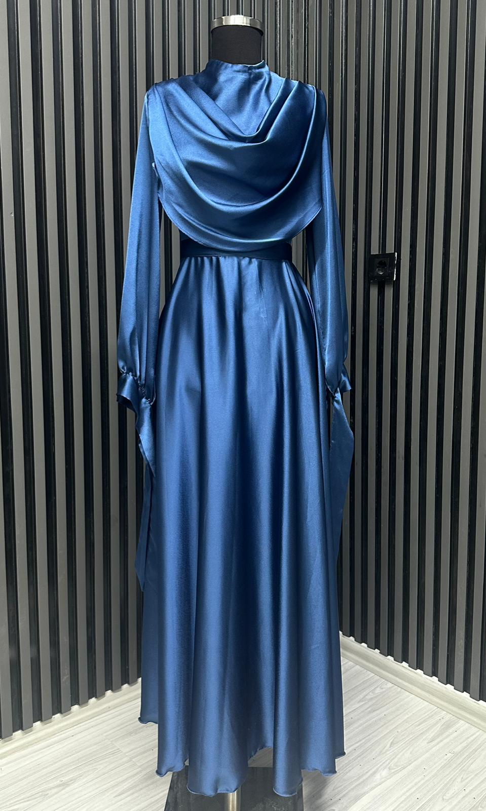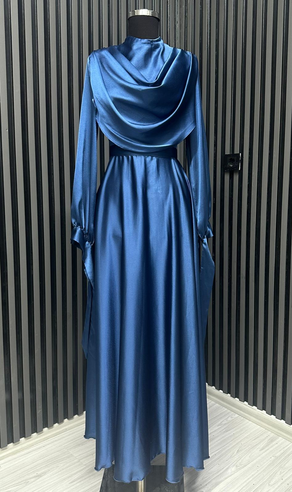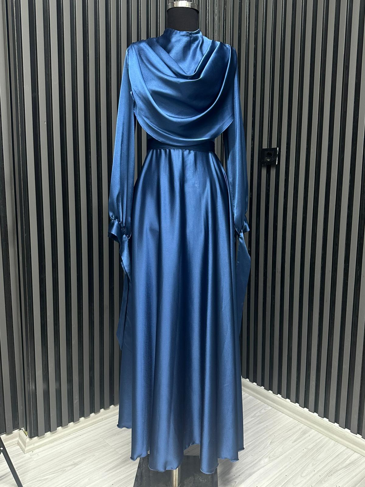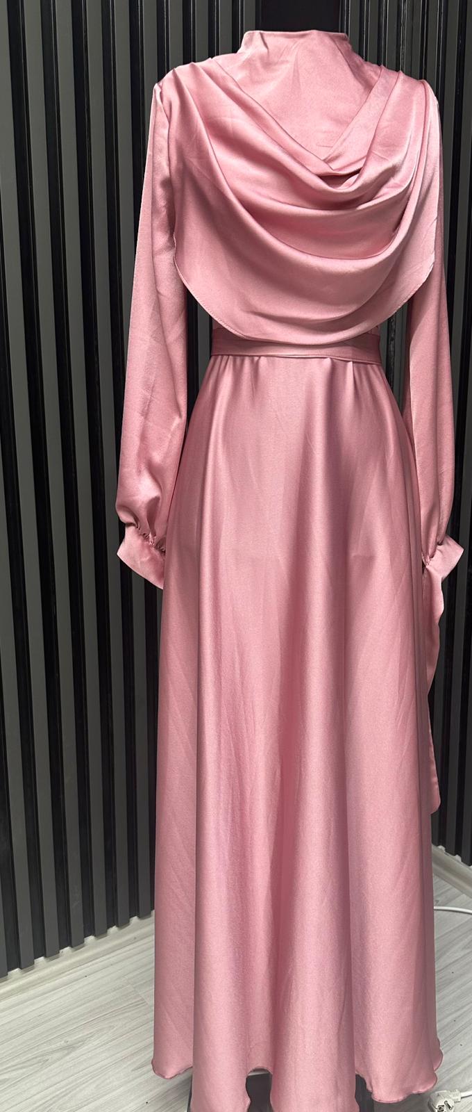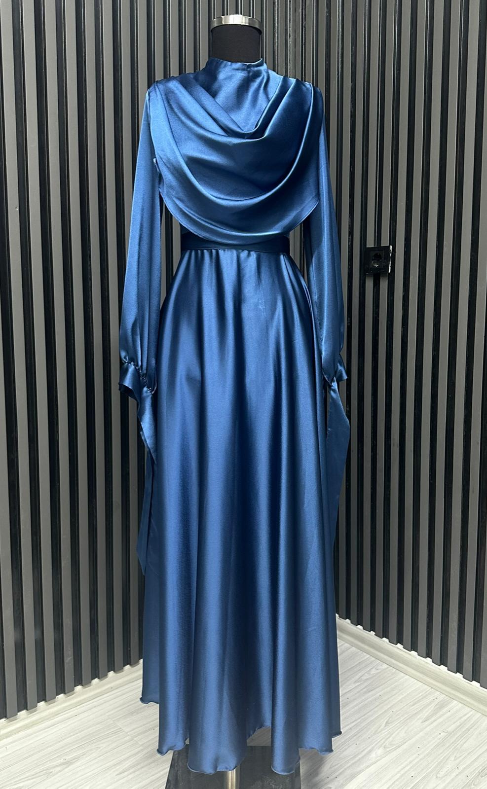 Fırsat Ürünü - Yakası Taşlı Saten Elbise - İp Çekme / Kemersiz