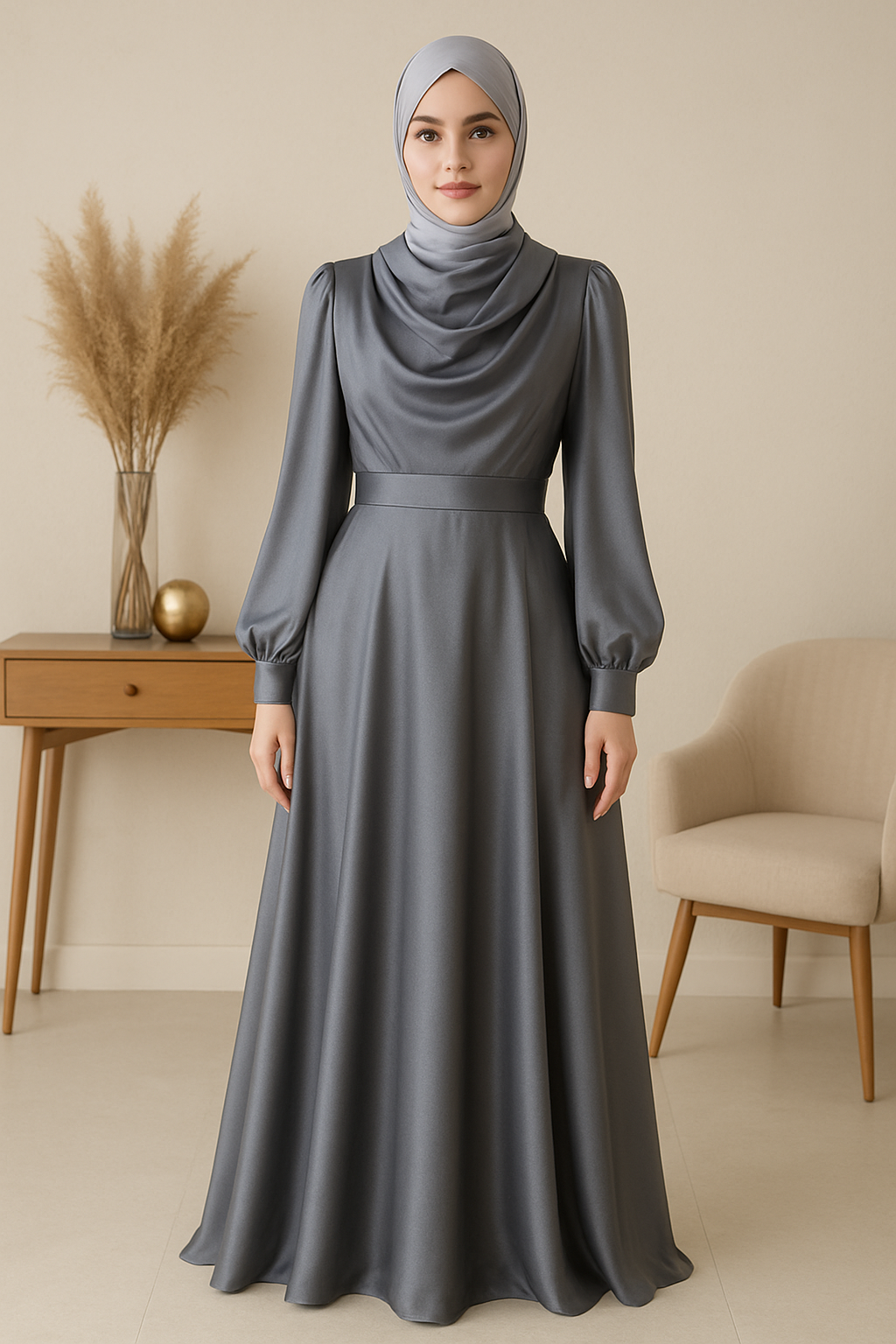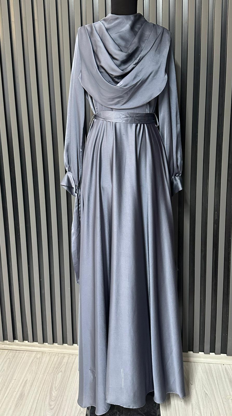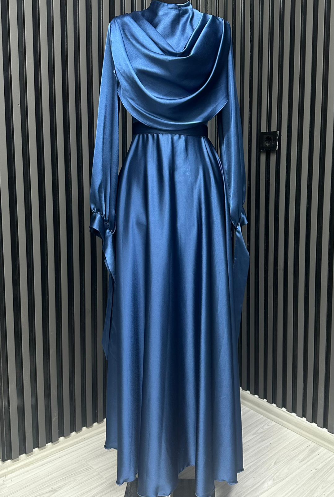 Fırsat Ürünü - Yakası Taşlı Saten Elbise - İp Çekme / Kemersiz