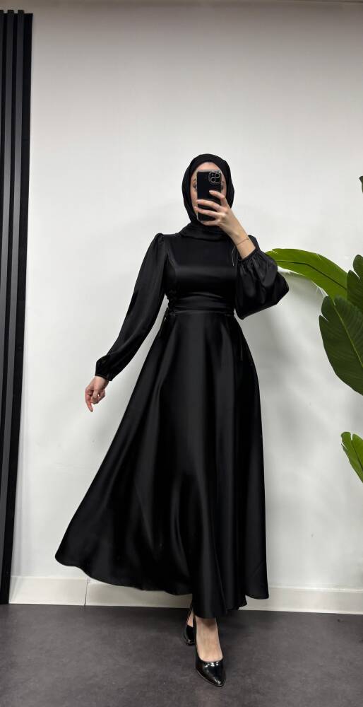 Fırsat Ürünü - Yakası Taşlı Saten Elbise - İp Çekme / Kemersiz
