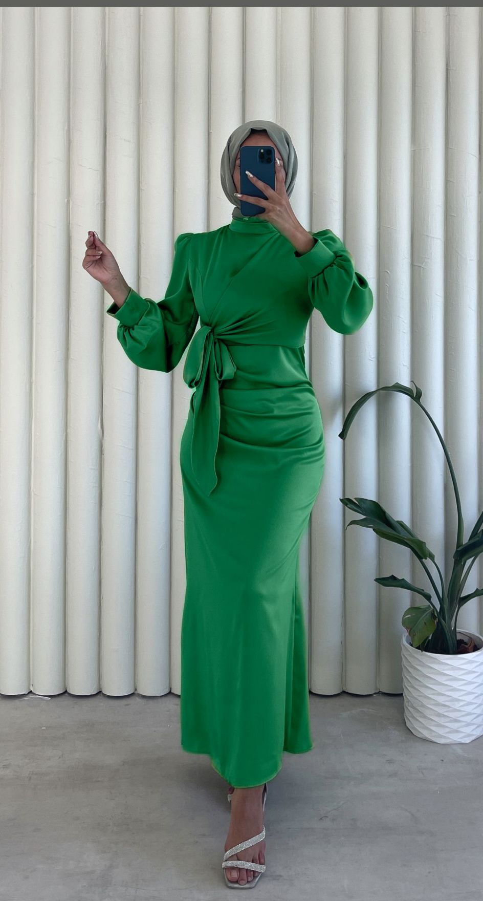 Fırsat Ürünü - Yakası Taşlı Saten Elbise - İp Çekme / Kemersiz