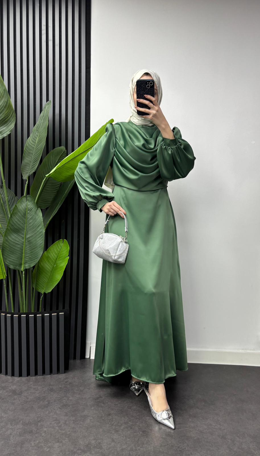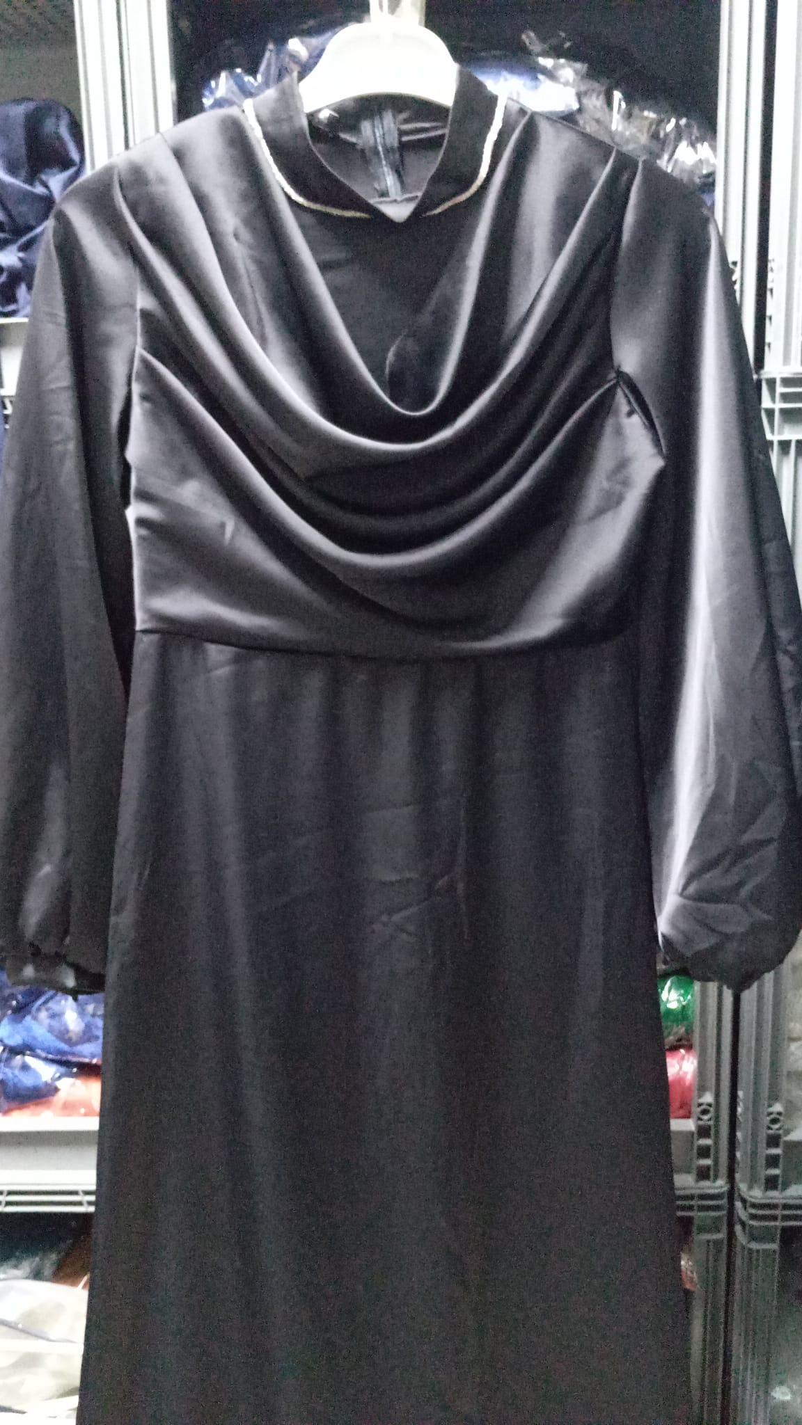 Fırsat Ürünü - Yakası Taşlı Saten Elbise - İp Çekme / Kemersiz