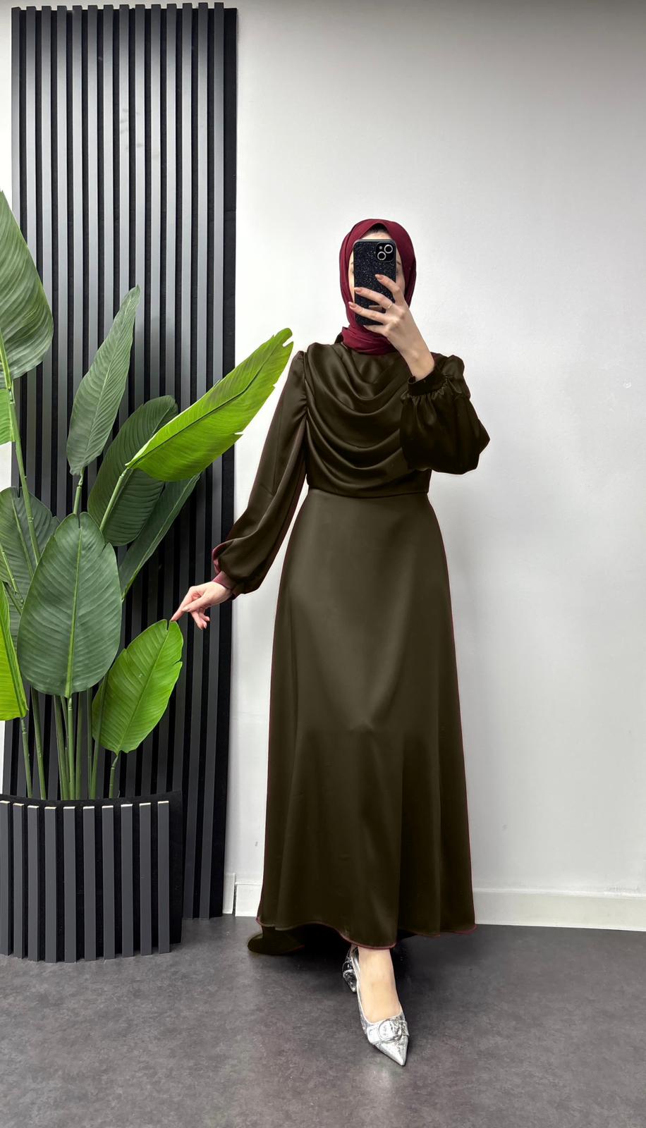 Fırsat Ürünü - Yakası Taşlı Saten Elbise - İp Çekme / Kemersiz