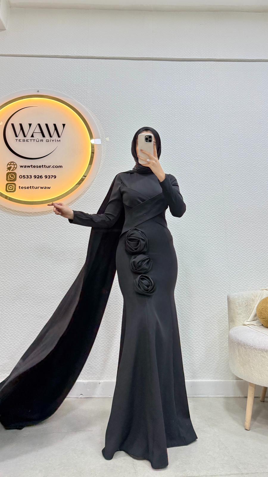 Krep kumaştan üretilmiştir.Balık formundadır.Pelerinlidir.Hakim yakadır.Arka orta fermuarlıdır.Gül detayları mevcuttur.Ürün boyu…Ürün kalıbı…36/38/40/42/44 bedenler mevcuttur.Manken 170/60kg 38 beden giymektedir.