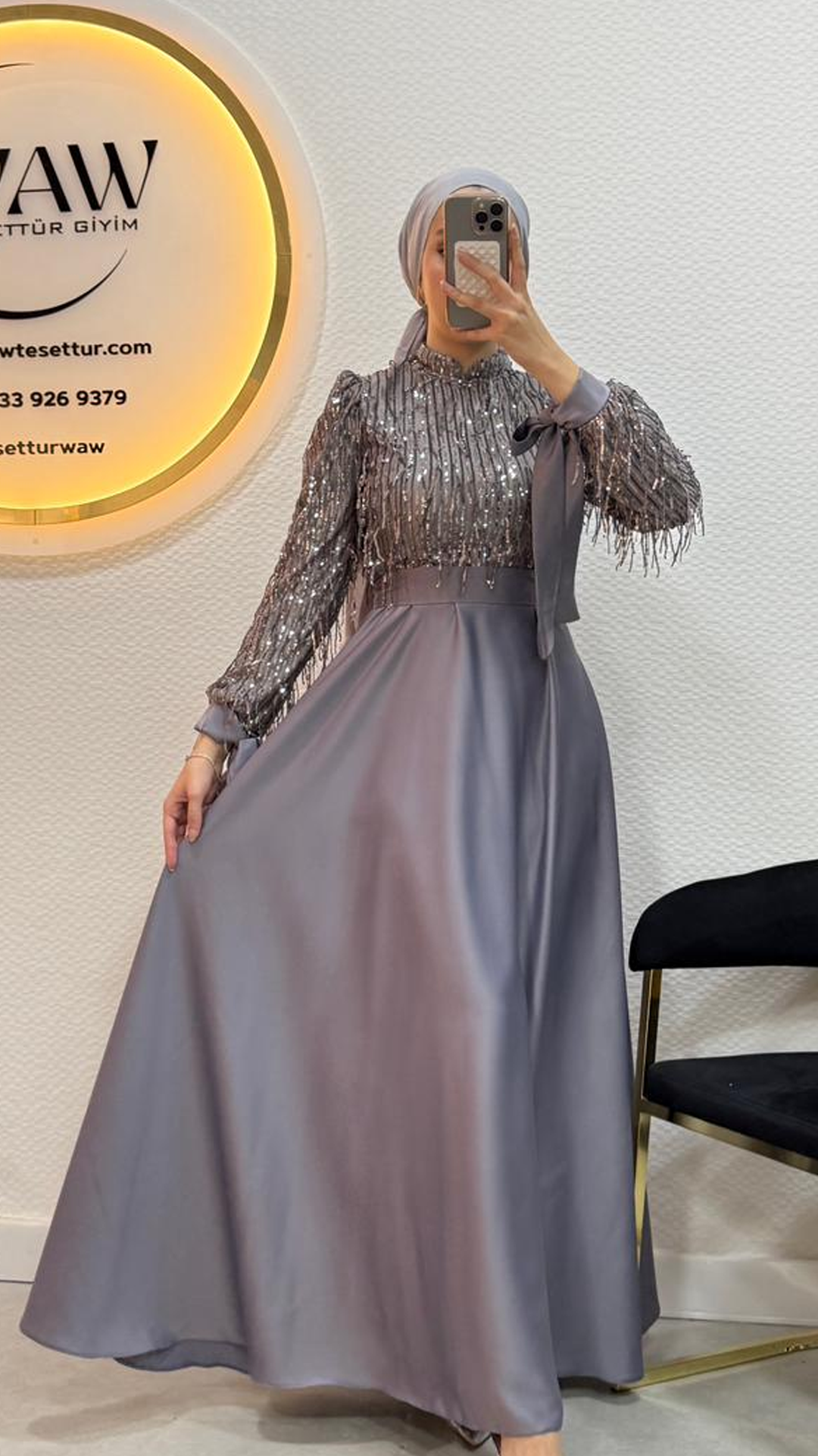 Gelince Haber VerAbiyemizin üst kısmı 1.kalite püsküllü payet detaylı kumaştan alt kısmı ise saten kumaştan üretilmiştir. 36/38/40/42/44 bedenler mevcuttur.