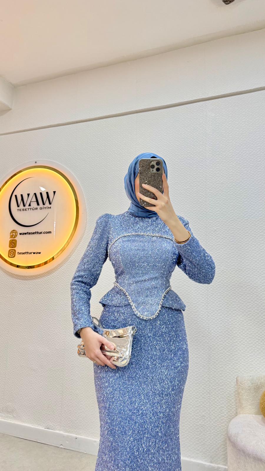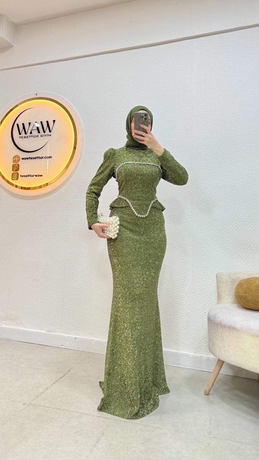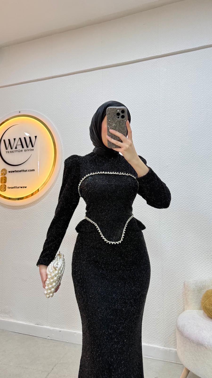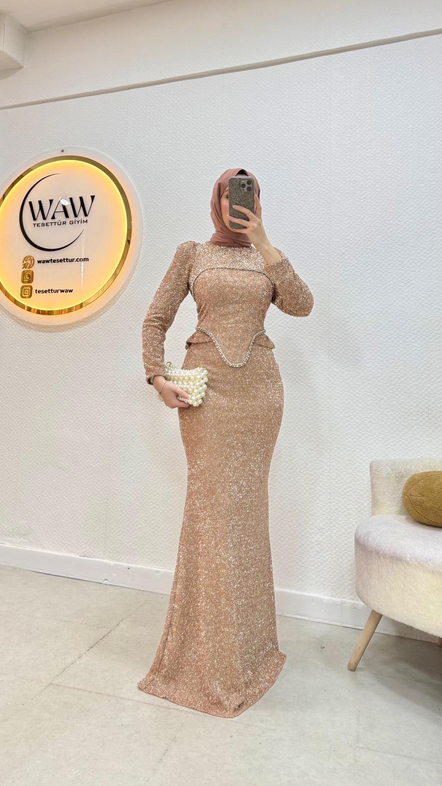 Payetli taşlı kumaştan üretilmiştir.Hakim yakadır.Arka orta gizli fermuarlıdır.Boy:155cmKalıp:Bedenler 36/38/40/42/44