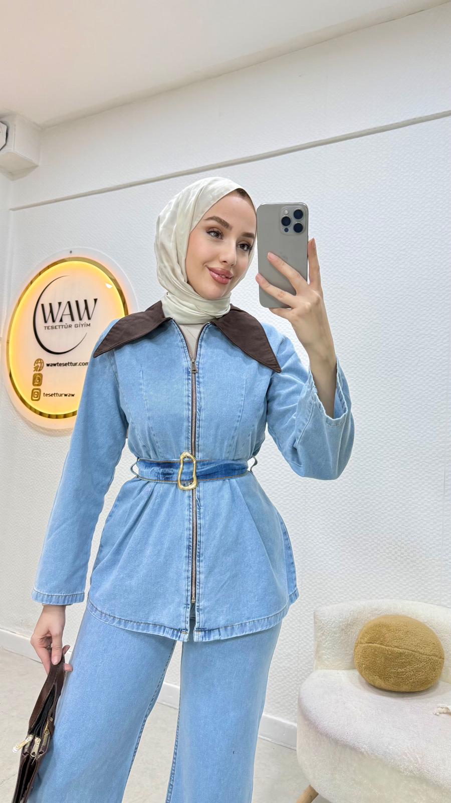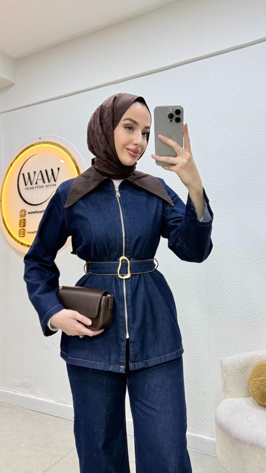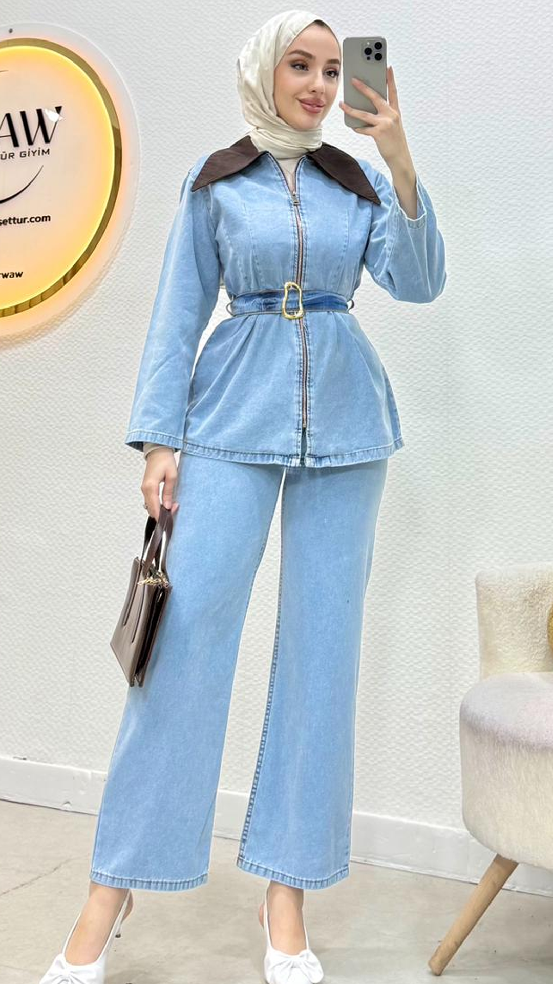 Kot kumaştan üretilmiştir.Pantolon-Ceket şeklinde ikili takımdır.Ceket fermuarlıdır,seyyar kemerlidir.Pantolon bel lastiklidir.Boy:Ürünümüz tam kalıptır.Bedenler 36/38/40/42/44