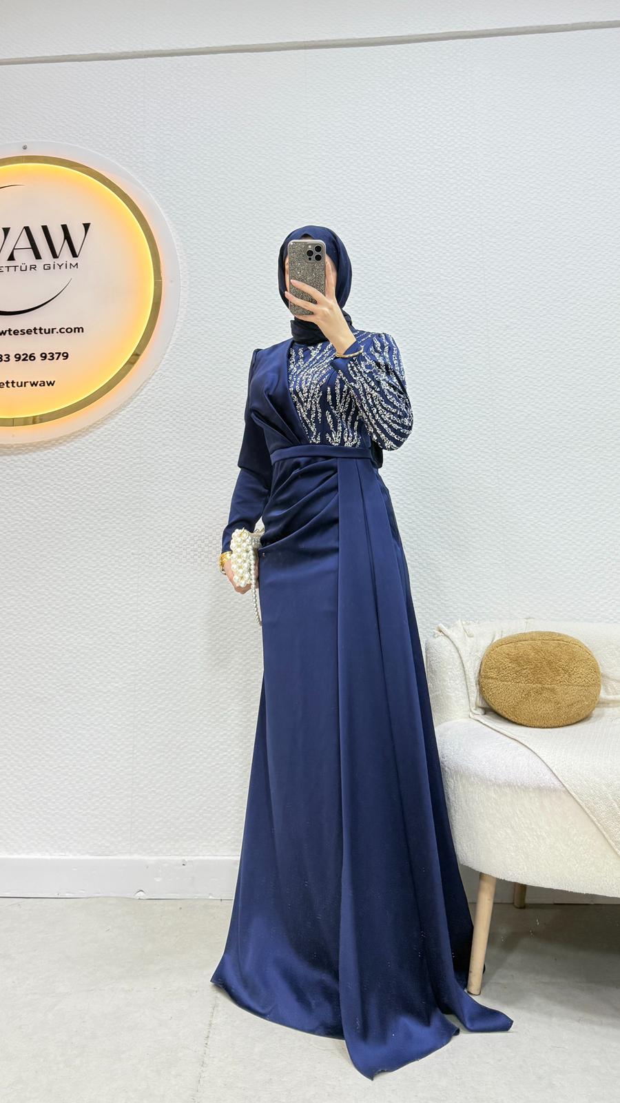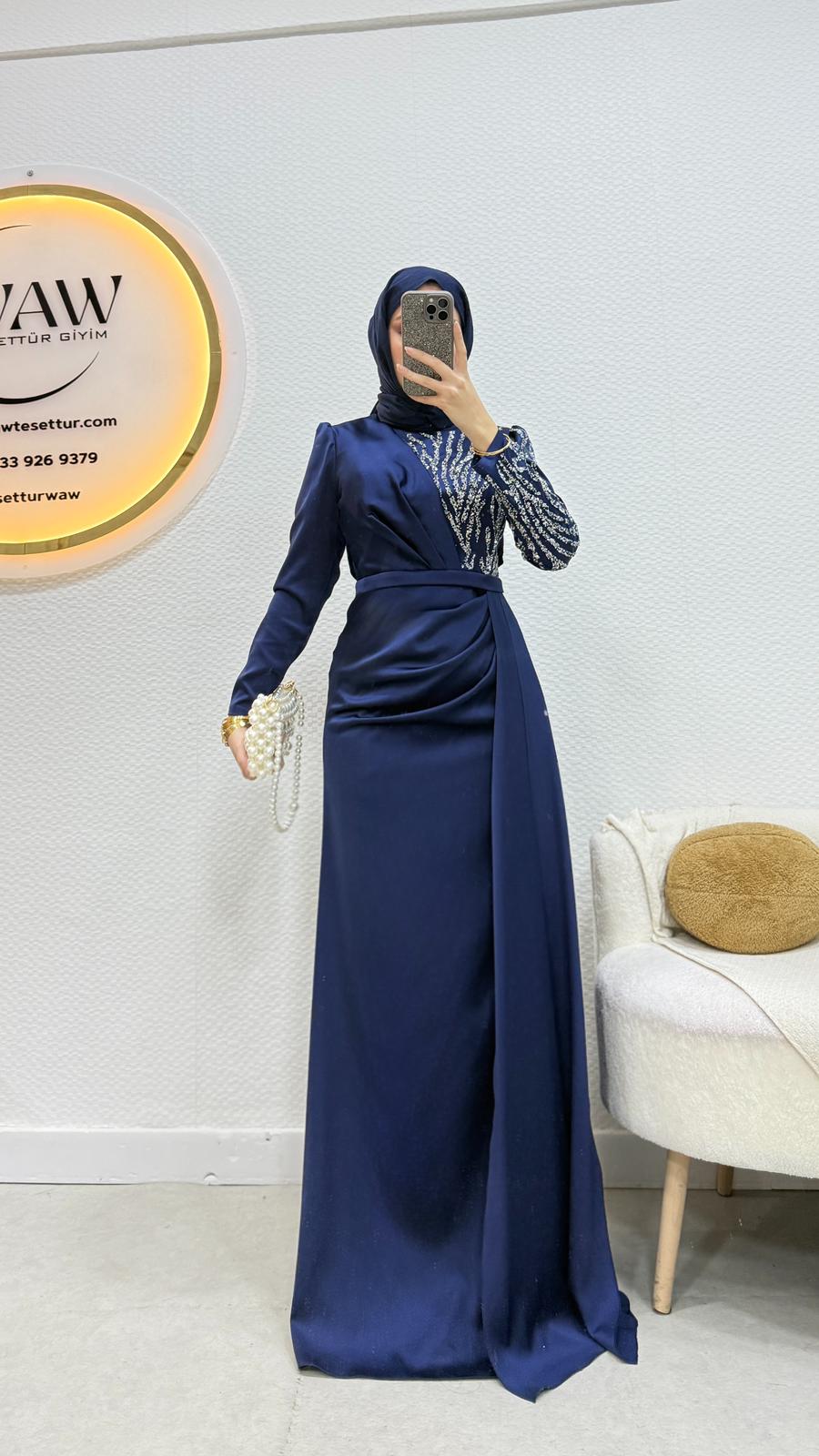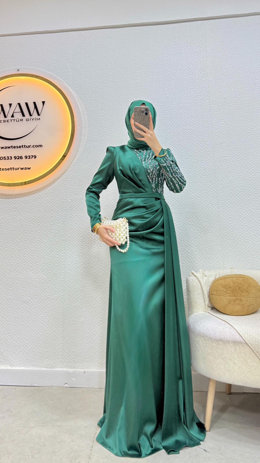 Ürünümüz birinci kalite saten kumaştan üretilmiştir.Seyyar Kemerlidir.36/38/40/42/44 bedenler mevcuttur.Arka orta gizli fermuarlıdır.Ürün boyu 140cm’dir.Ürünümüz dar kalıptır.Manken 170/60kg 38 giymektedir.