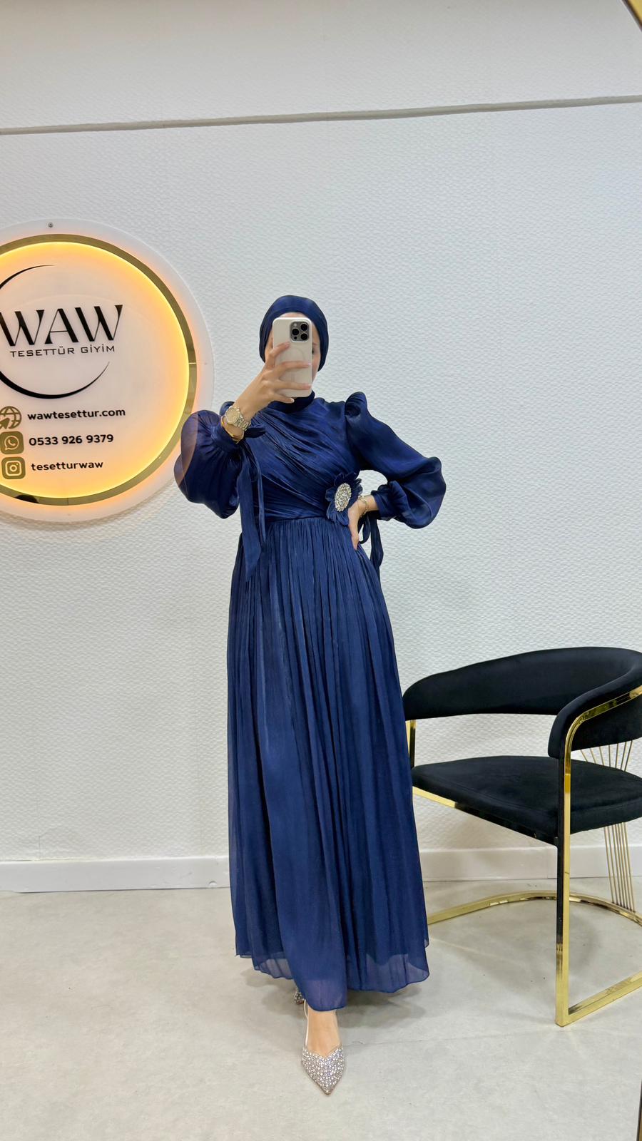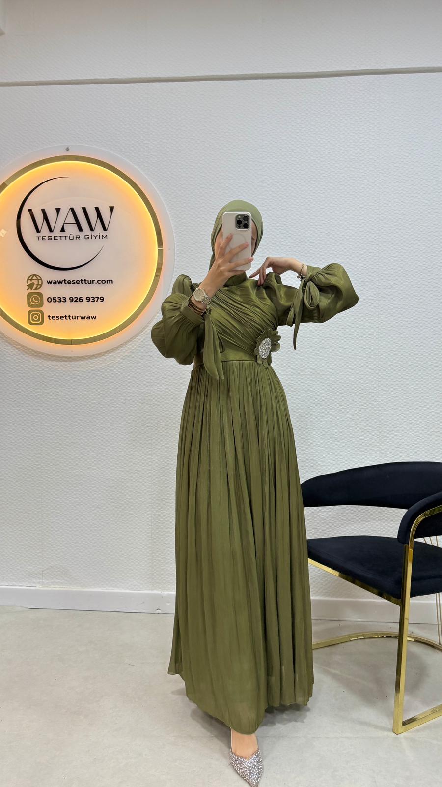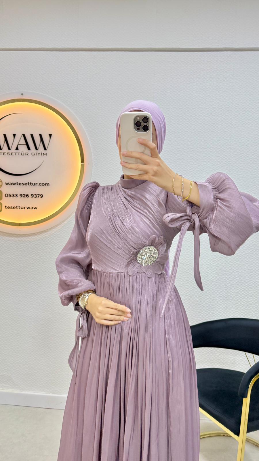 Kumaş : 1. kalite sofya kumaştan üretilmiştir.Boyu 140cm’dir.Belinde çiçek, kollarında bağlama detayı vardır.36/38/40/42/44 bedenleri mevcuttur.Çekim mankeni 170/60kg 38 bedeni tercih etmektedir.