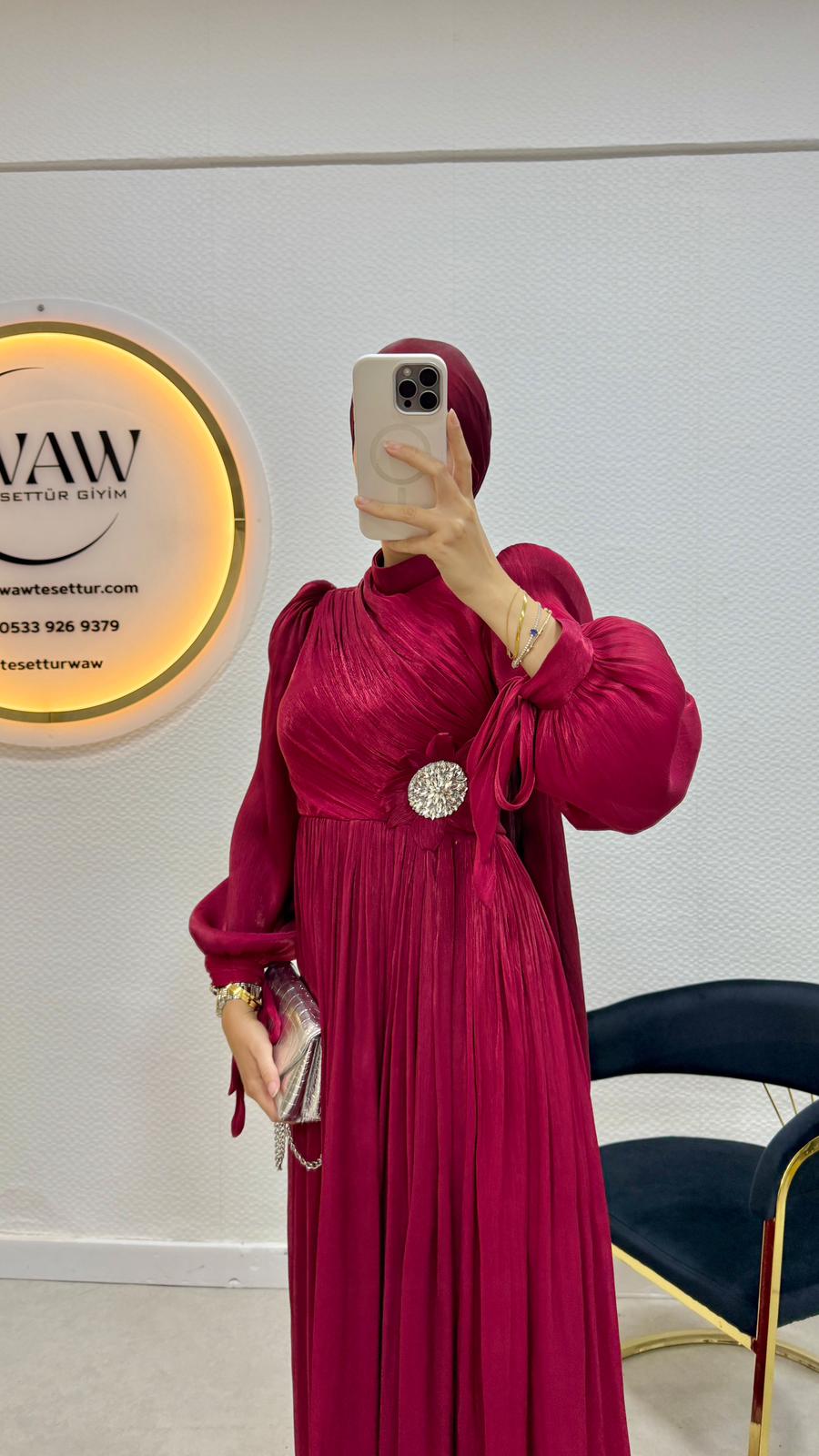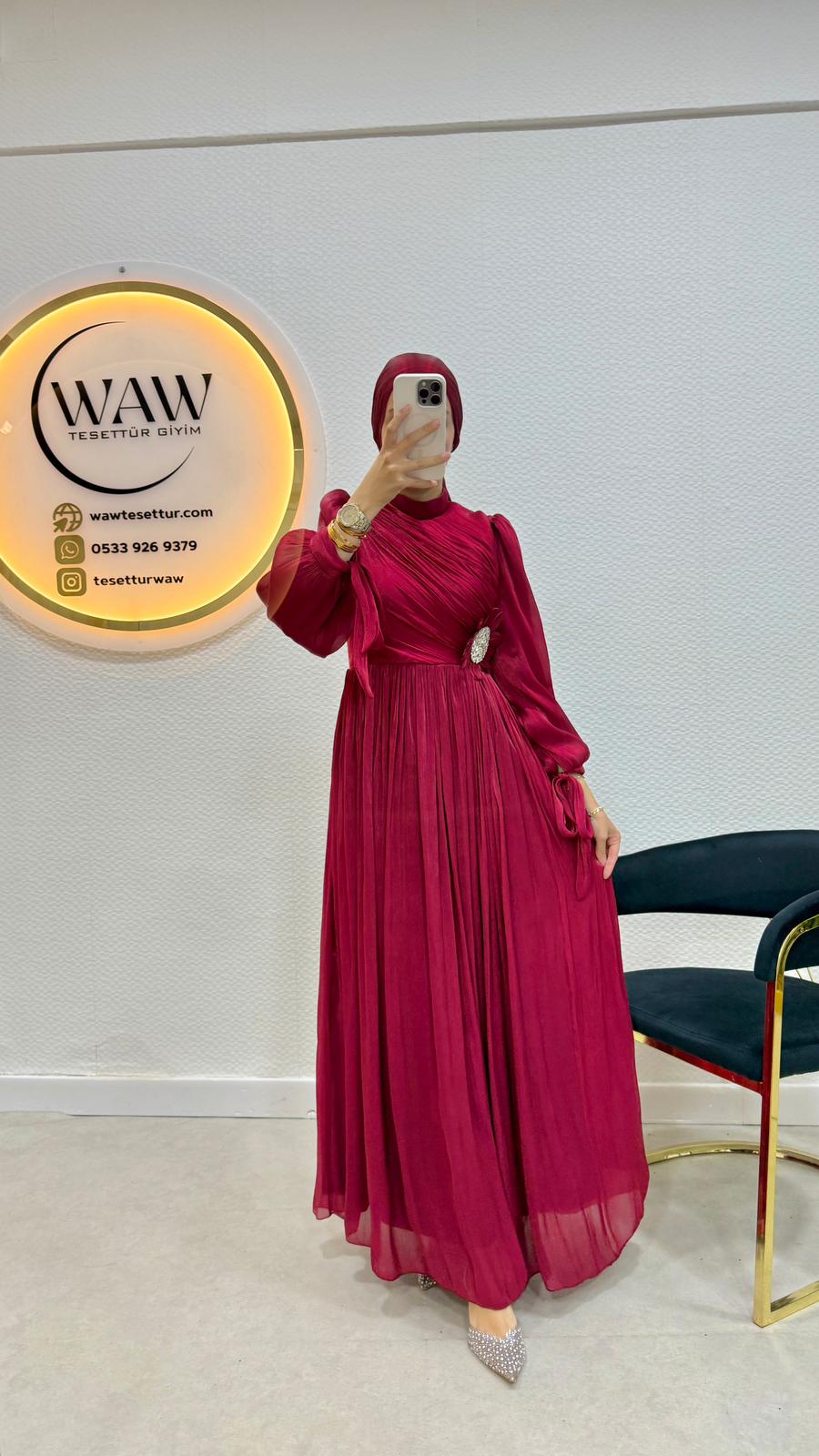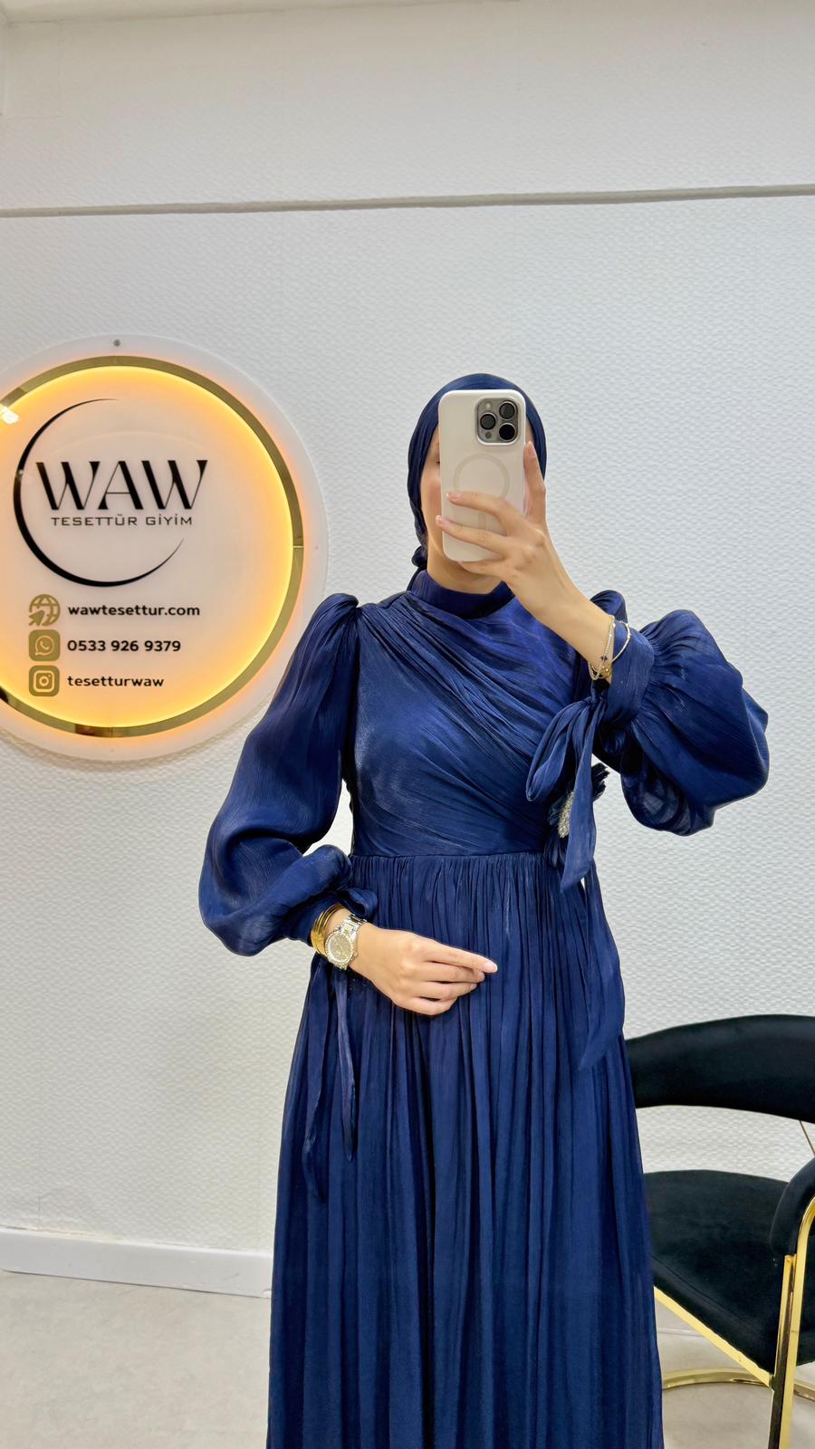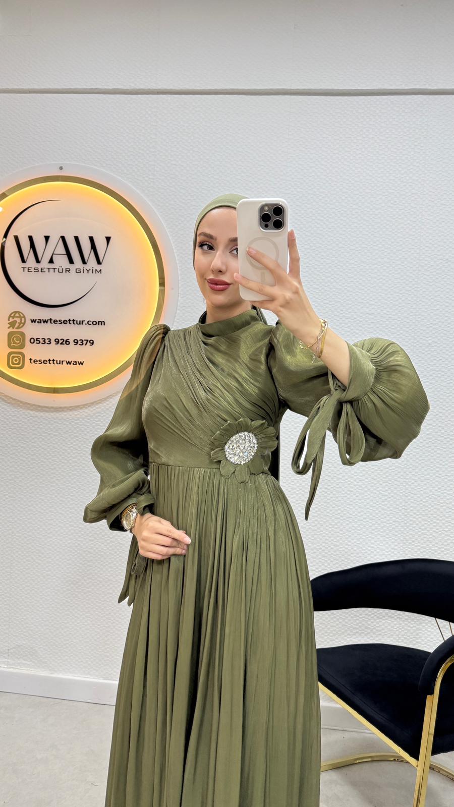 Kumaş : 1. kalite sofya kumaştan üretilmiştir.Boyu 140cm’dir.Belinde çiçek, kollarında bağlama detayı vardır.36/38/40/42/44 bedenleri mevcuttur.Çekim mankeni 170/60kg 38 bedeni tercih etmektedir.