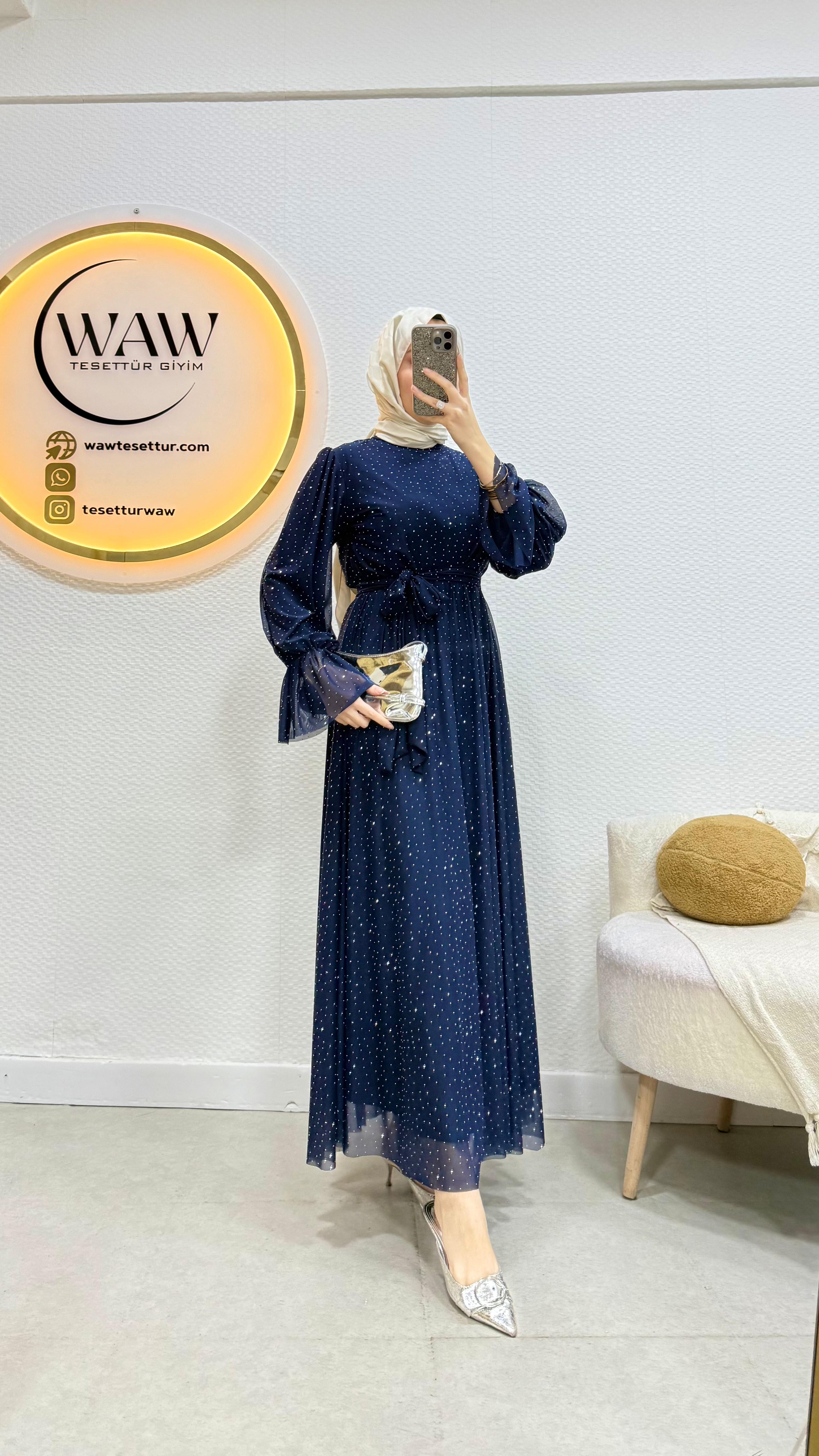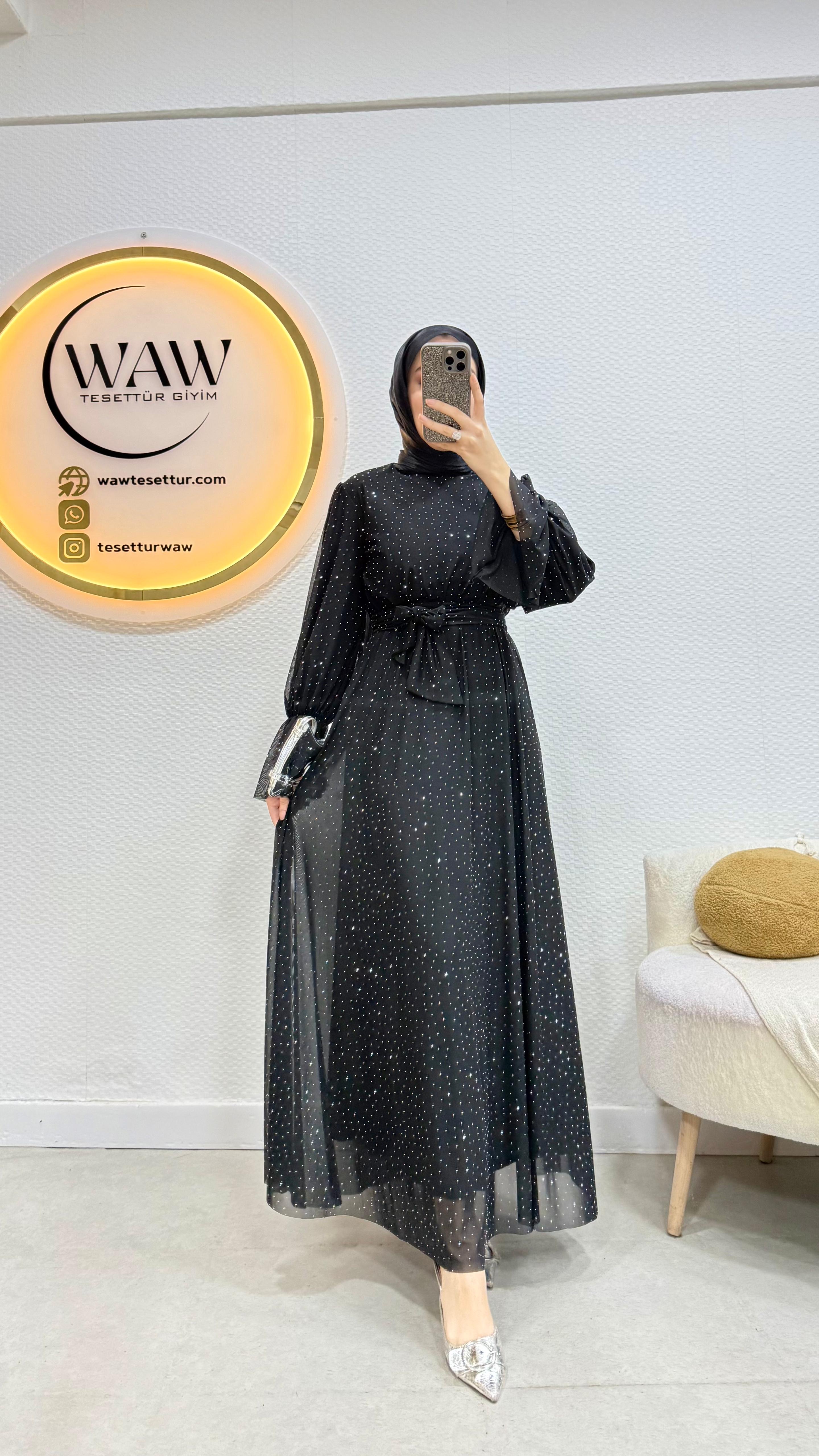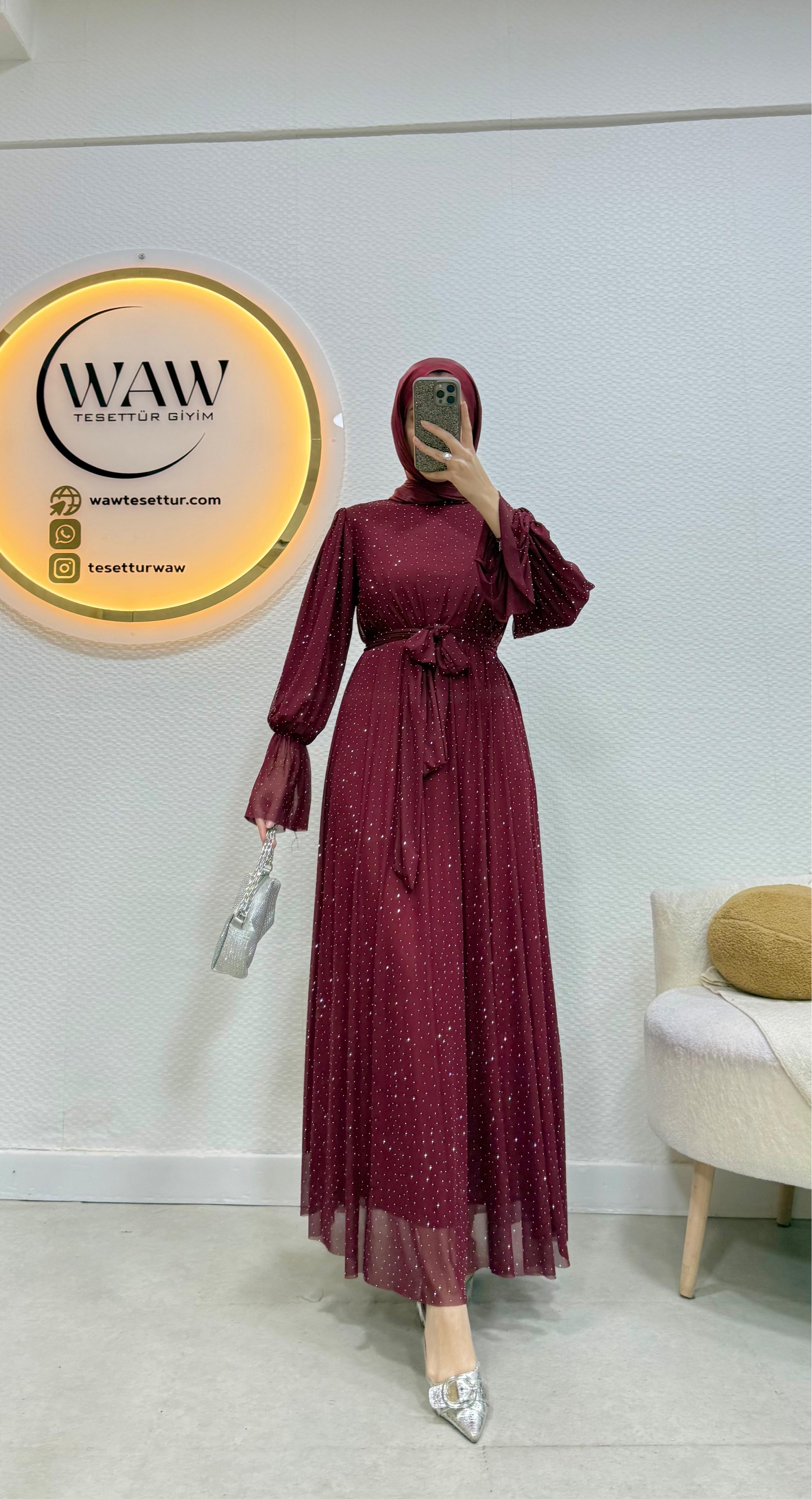Işılay Elbise ürünümüz birinci kalite taşlı tül kumaştan üretilmiştir.