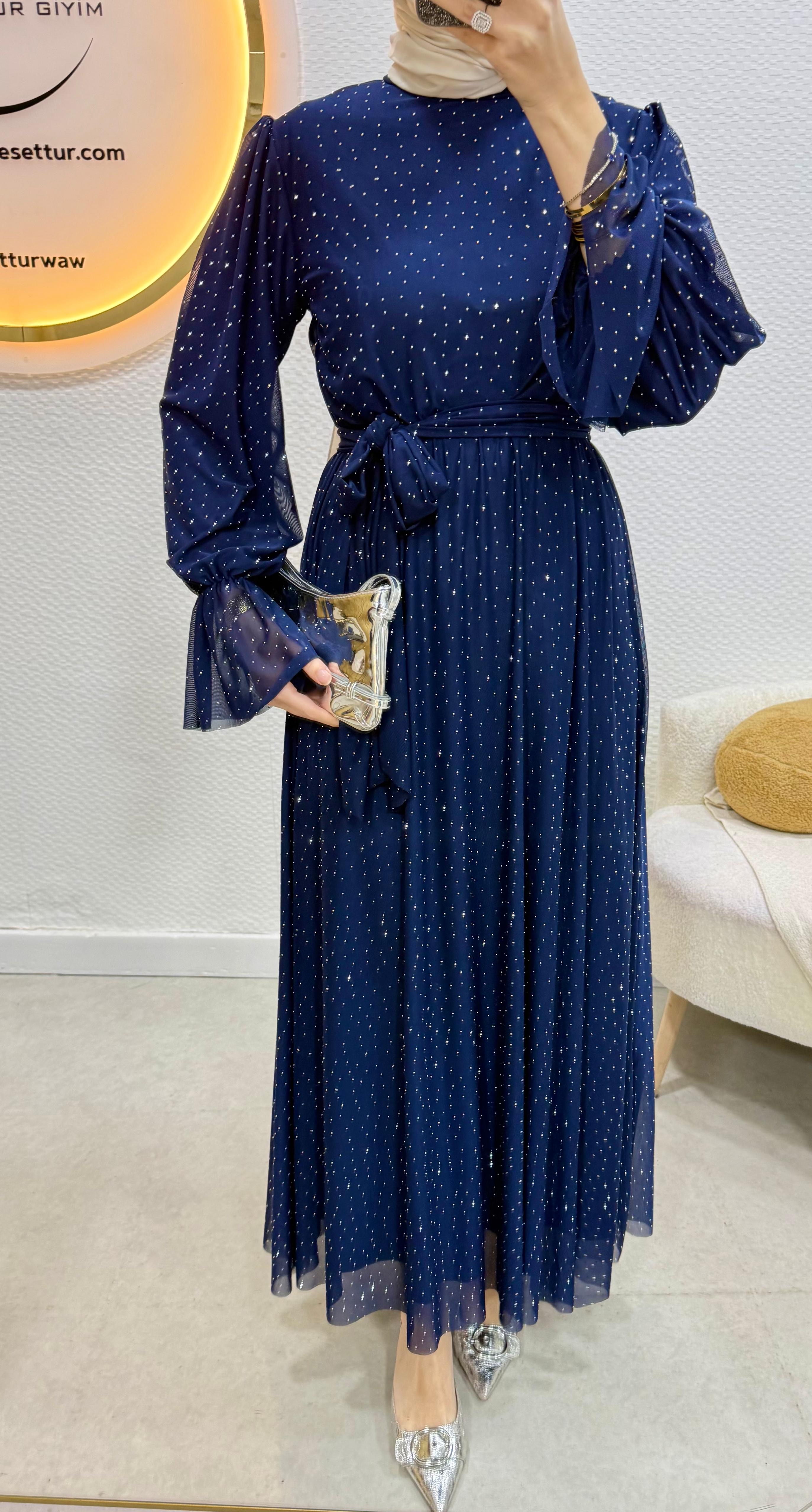 Işılay Elbise ürünümüz birinci kalite taşlı tül kumaştan üretilmiştir. Astarlıdır, iç göstermez. Seyyar kemerlidir. Manşet lastiklidir. Ürün boyu 140cm’dir. 36/38/40/42/44 bedenler mevcuttur. Arka orta gizli fermuarlıdır. Tam kalıptır. Manken 170/60kg 38 tercih etmektedir.