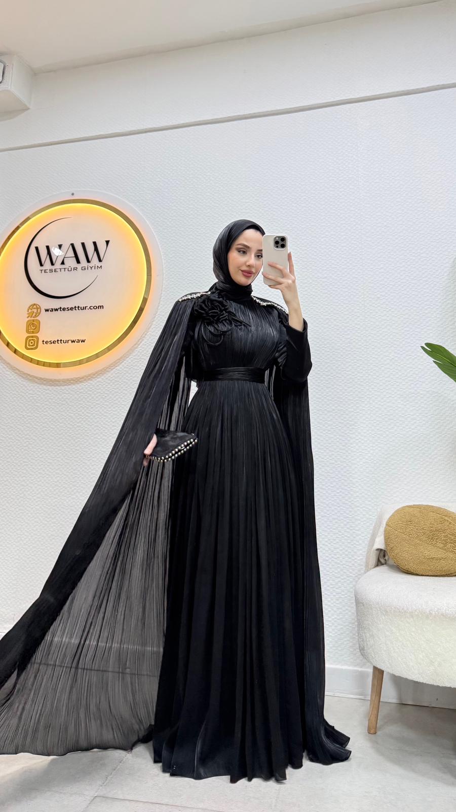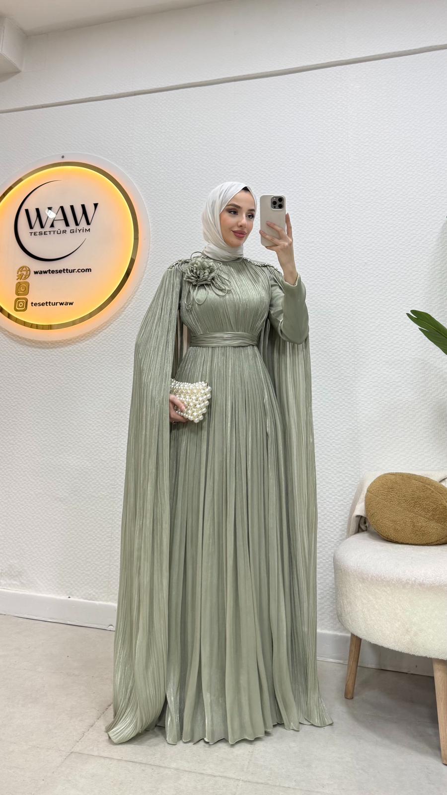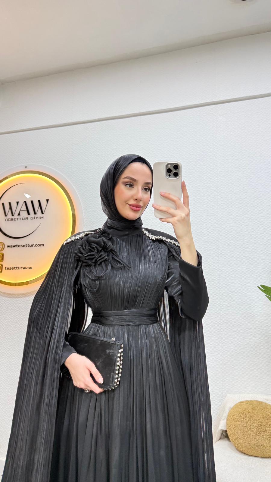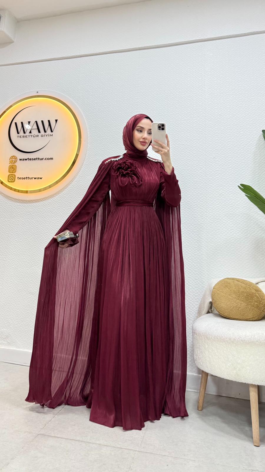 Karyel abiye Janjan sofia kumaştan üretilmiştir.Omuz taş işlemelidir.Tam kalıptır.Arka orta gizli fermuarlıdır. Boy: 145cmBedenler: 36/38/40/42/44