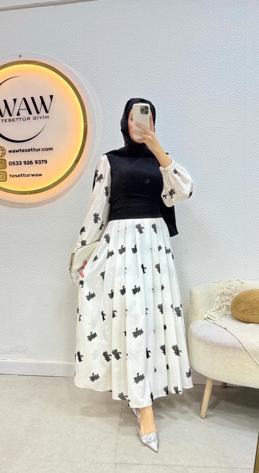 Pamuk Brode Nakis kumaştan üretilmiştir.Quetlet desenlidir. İç göstermez38/40/42/44/46 bedenler mevcuttur. Ürün boyu 135 cm’dir . Manken 170/60kg 38 giymektedir.