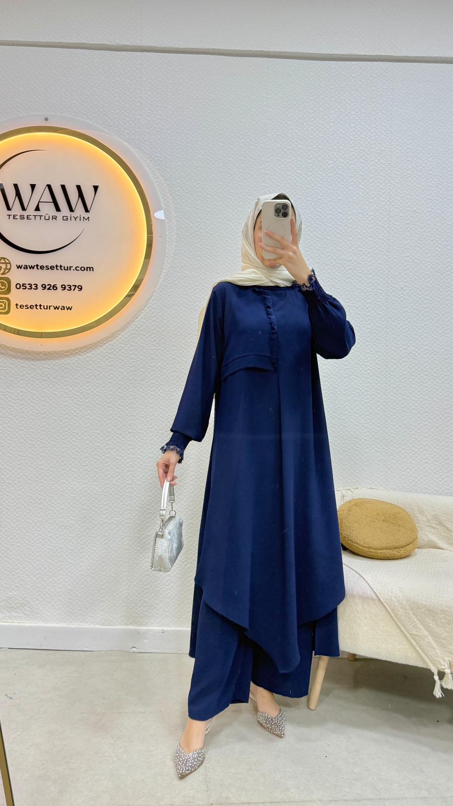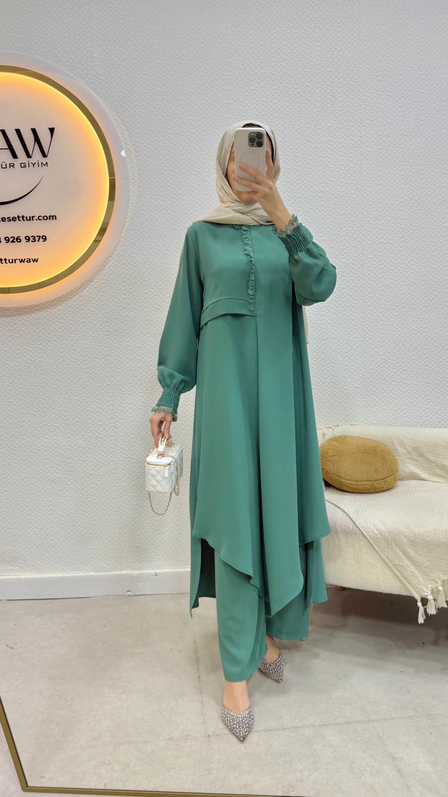 Tunik/pantolon şeklinde ikili takımdır.