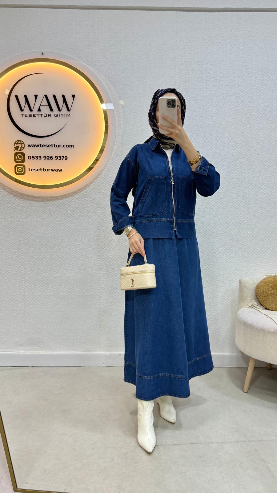 Ürünümüz birinci kalite kot kumaştan üretilmiştir. Etek ve üst şeklinde ikili takımdır. Üst fermuarlıdır kullanılabilir. Etek bel lastiklidir. 36/38/40/42/44 bedenler mevcuttur. Manken 170:60 kg 38 giymektedir.