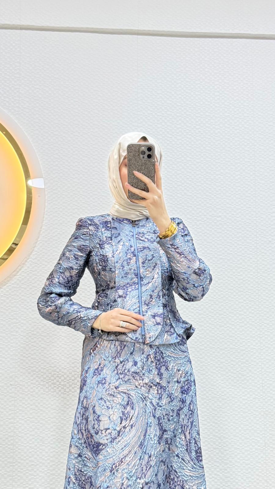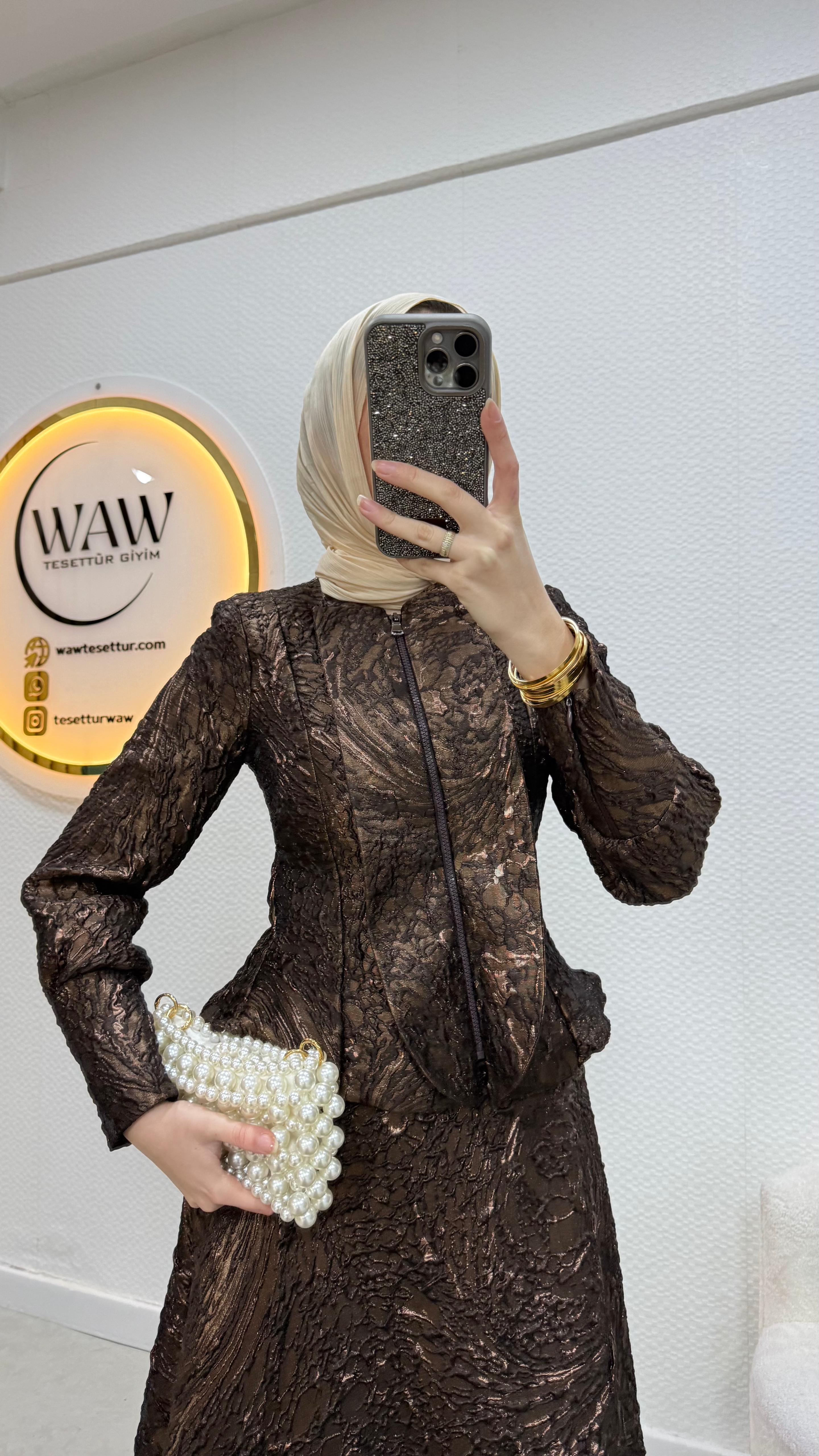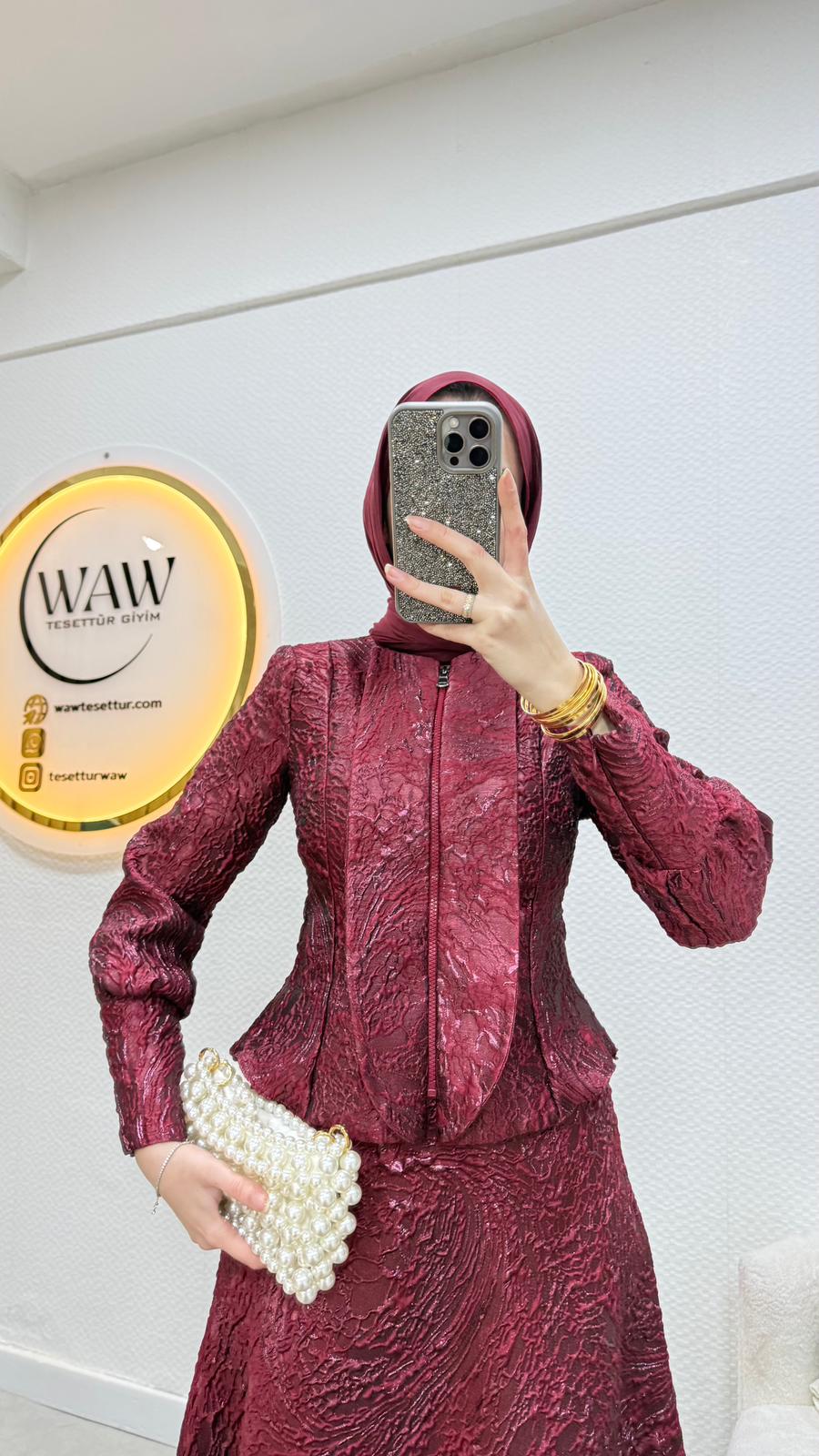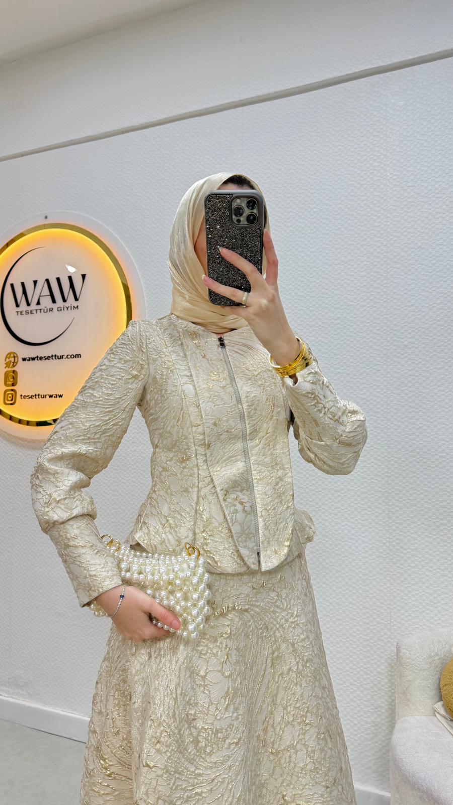 luna takım jakar kumaştan üretilmiştir tam kalıptır tam kalıptırüst boyu 55 cm etek boyu 115 cmüst kısım fermuarlıdır 36/38/40/42/44/46 bedenleri mevcuttur çekim mankeni 170/60kg 38 beden tercih etmektedir